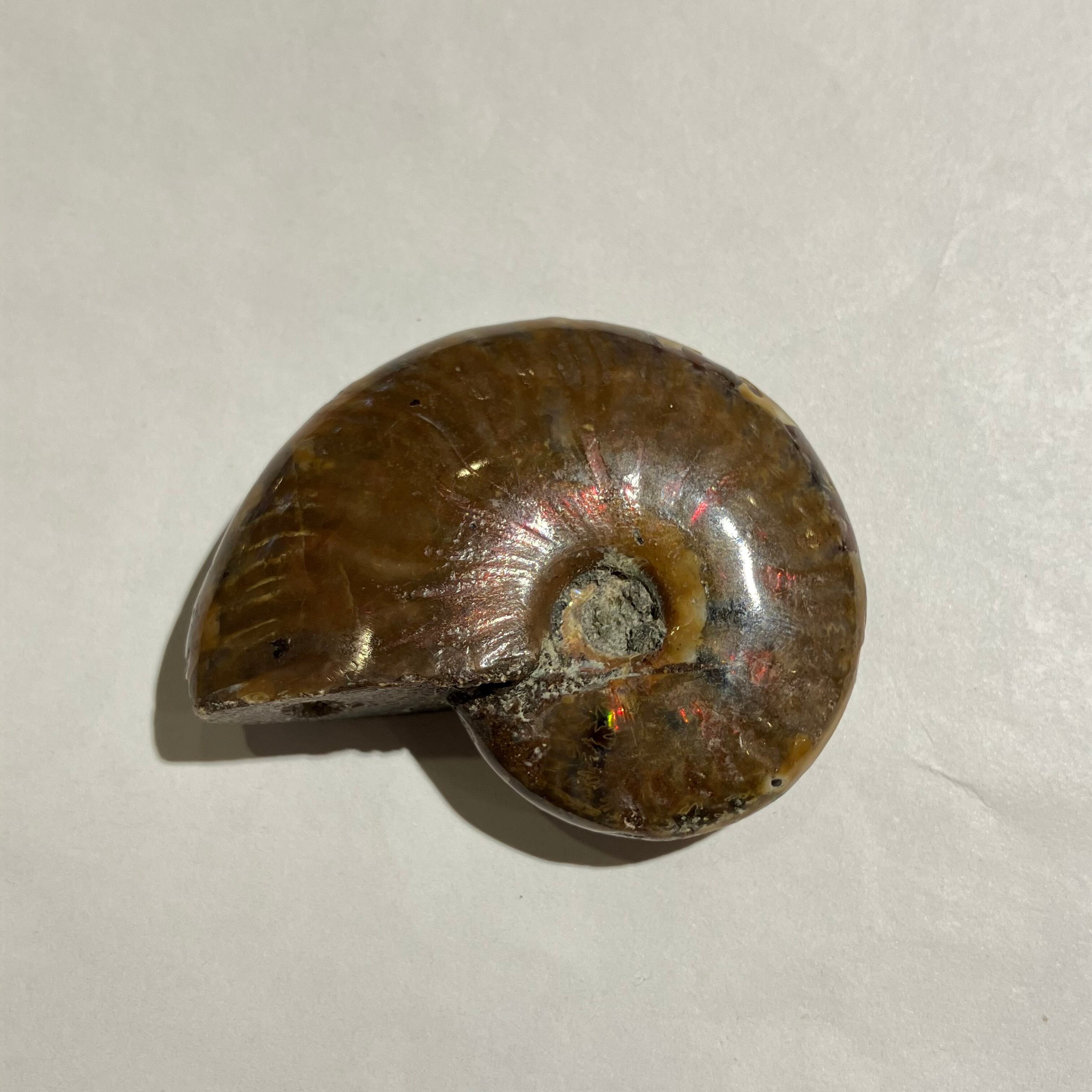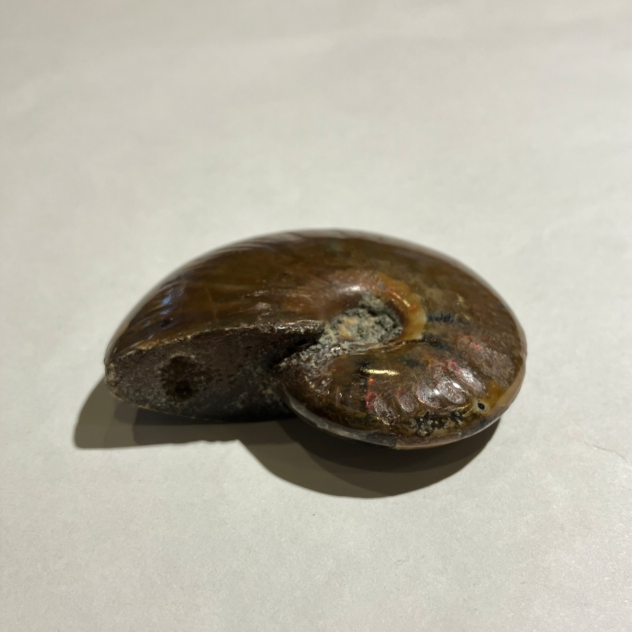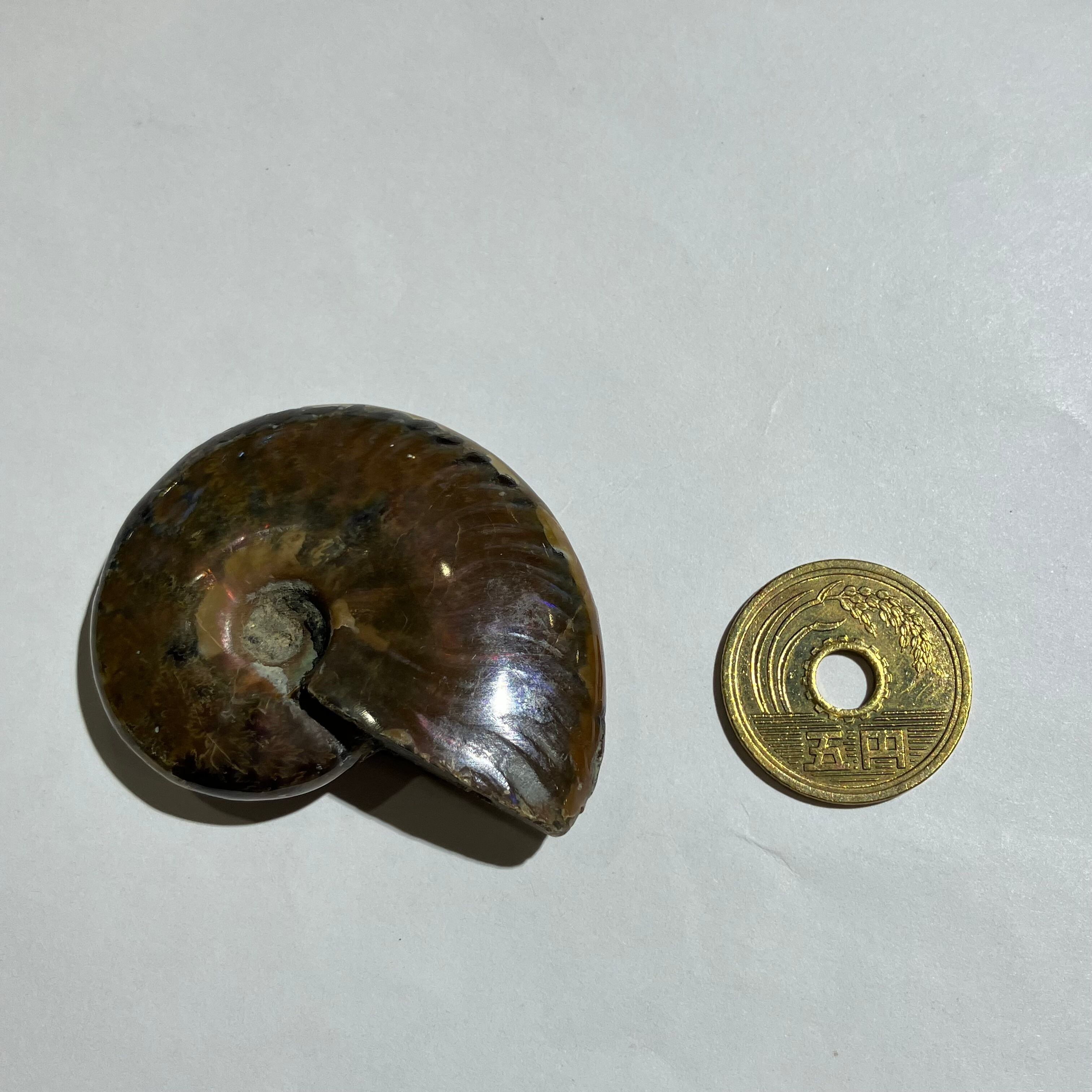 その原因は地層中の酸化鉄や珪酸がアンモナイトの殻に薄く付着し、細かなひび割れの部分がオパールのような光沢を放つためといわれています。