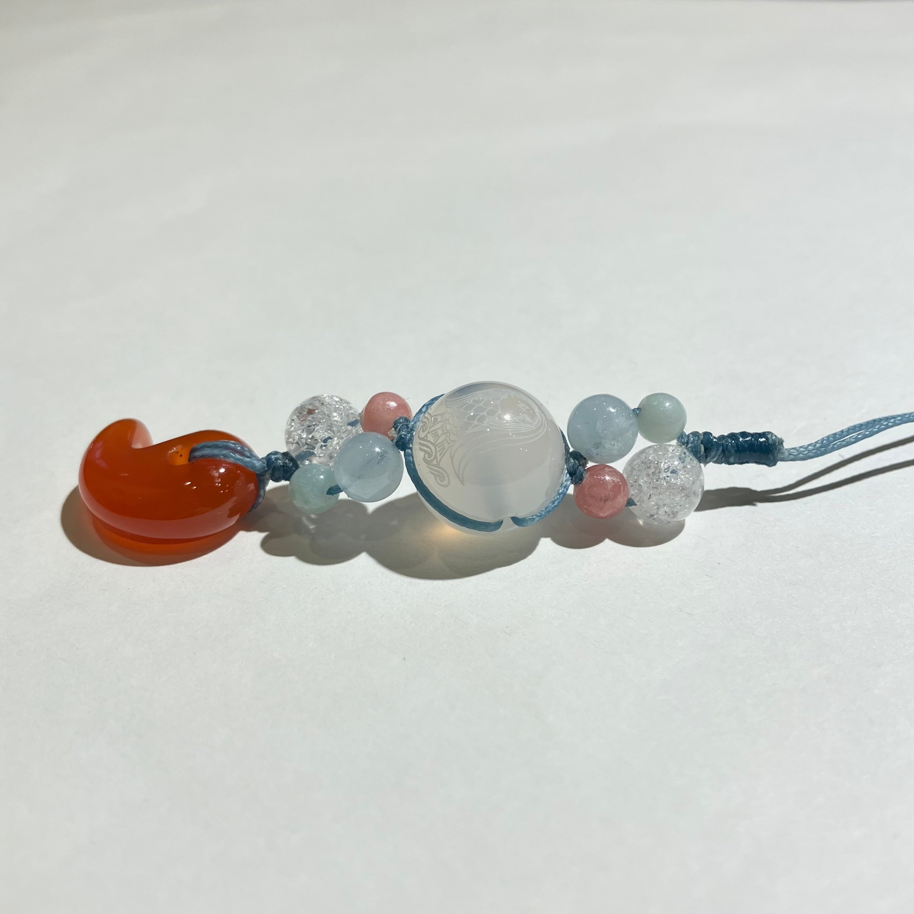 赤めのう(勾玉)白めのう(アマビエ)、クラック水晶、ロードクロサイト、アクアマリン、アマゾナイト