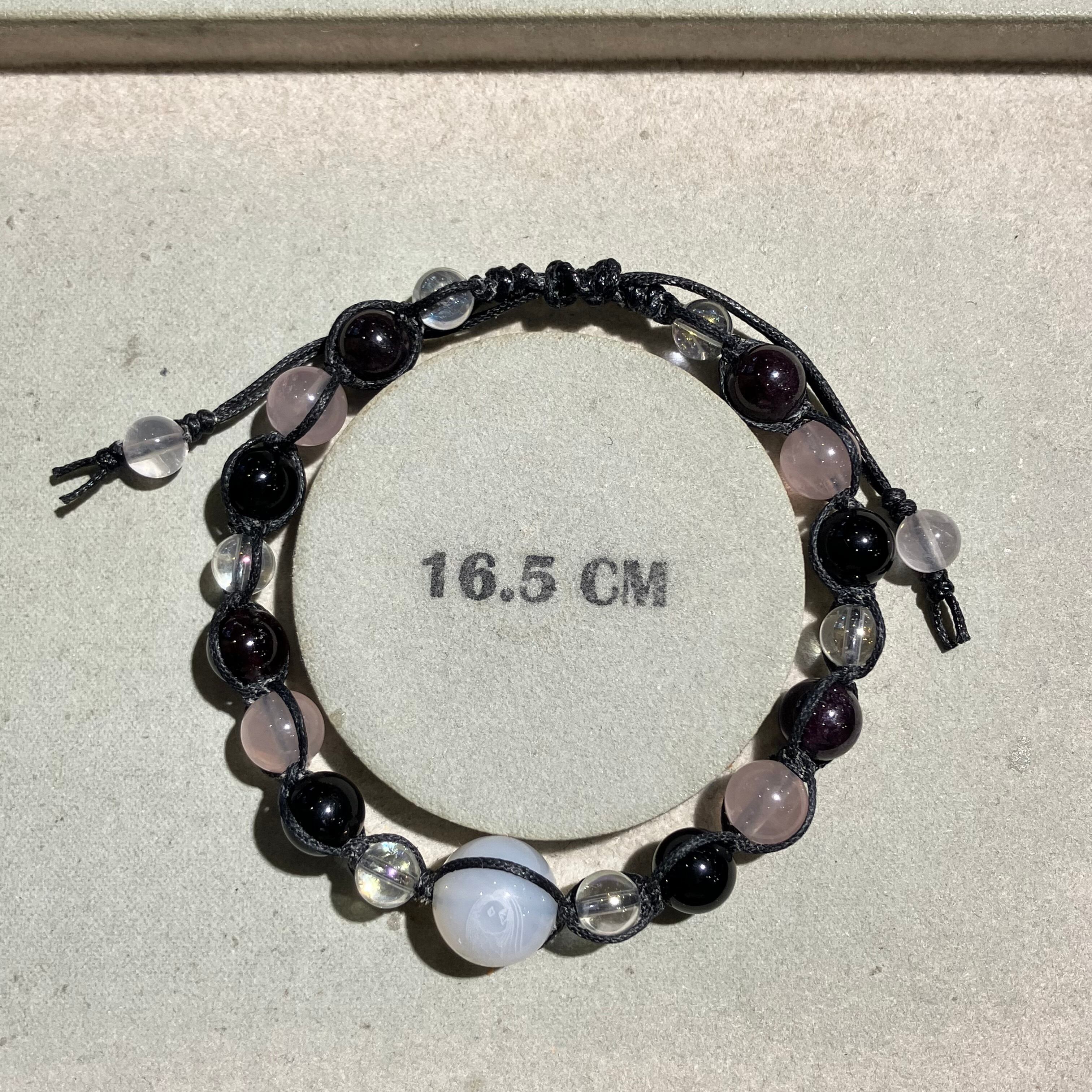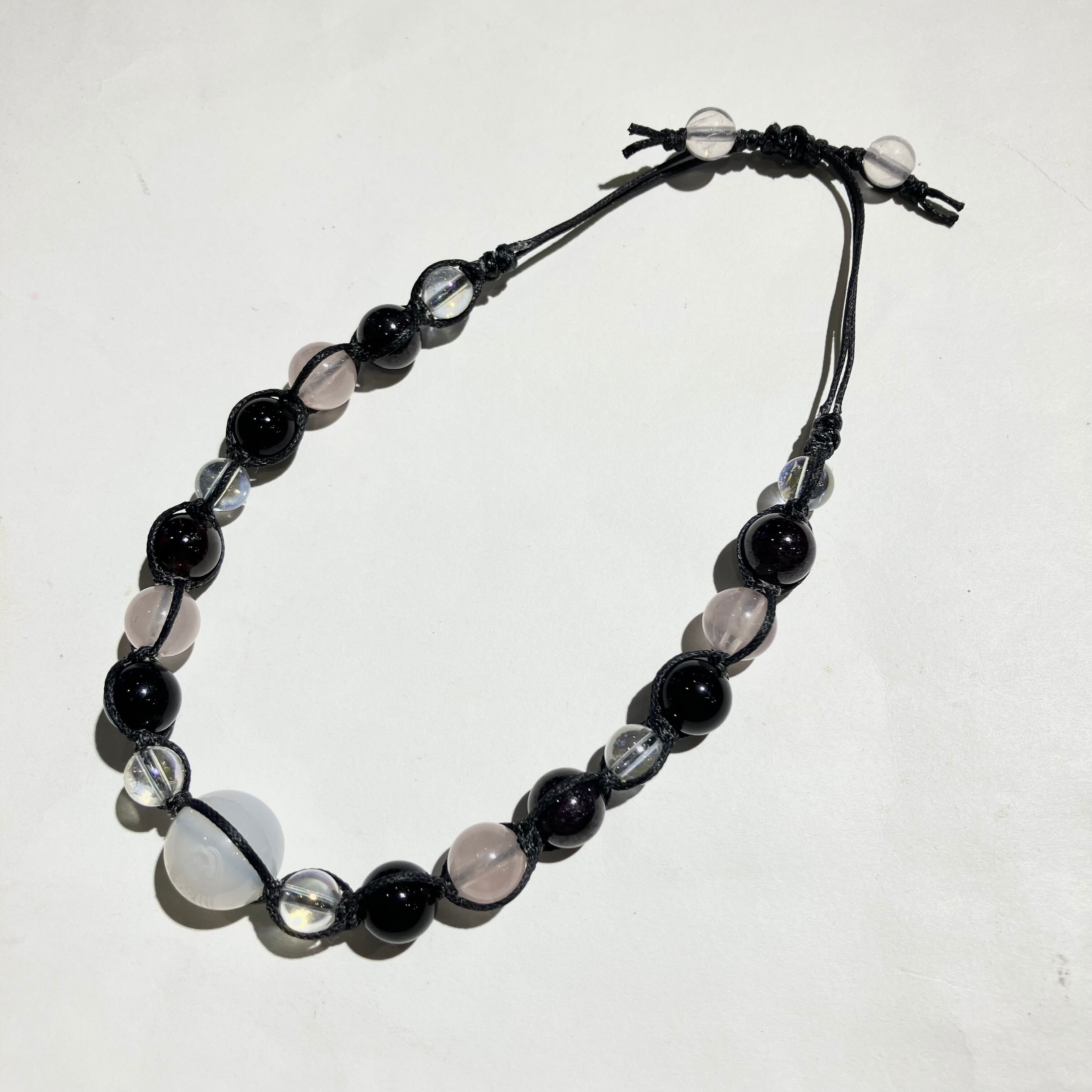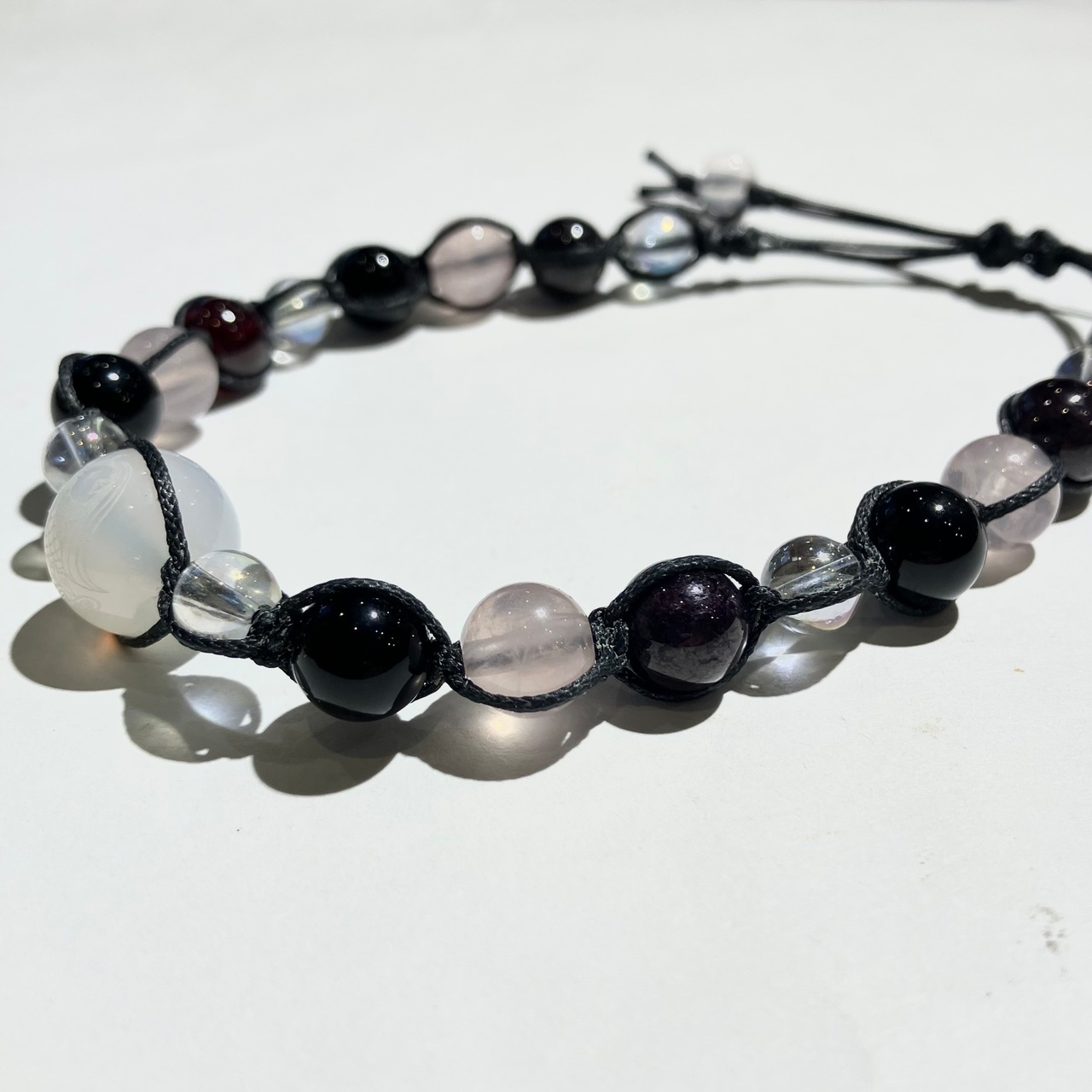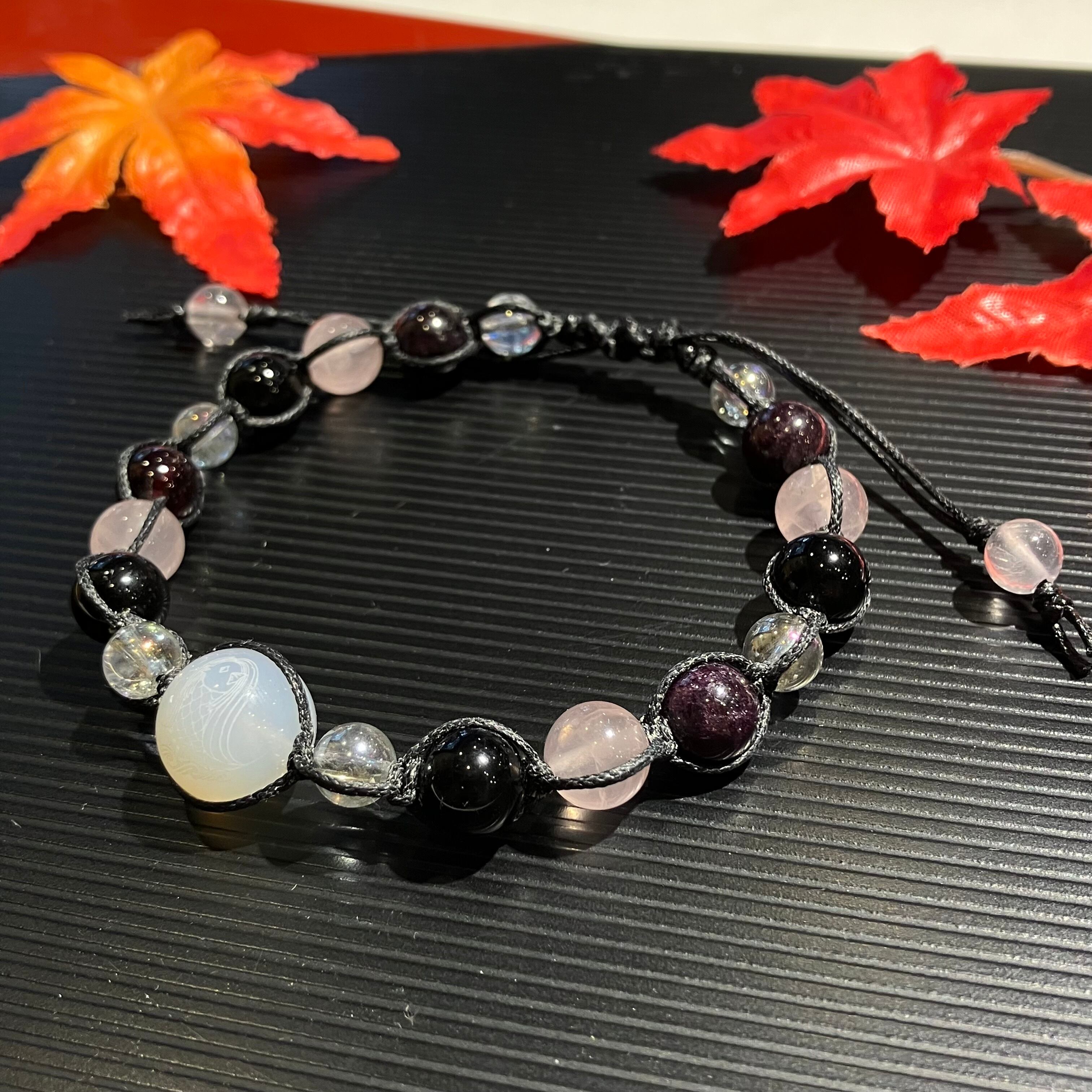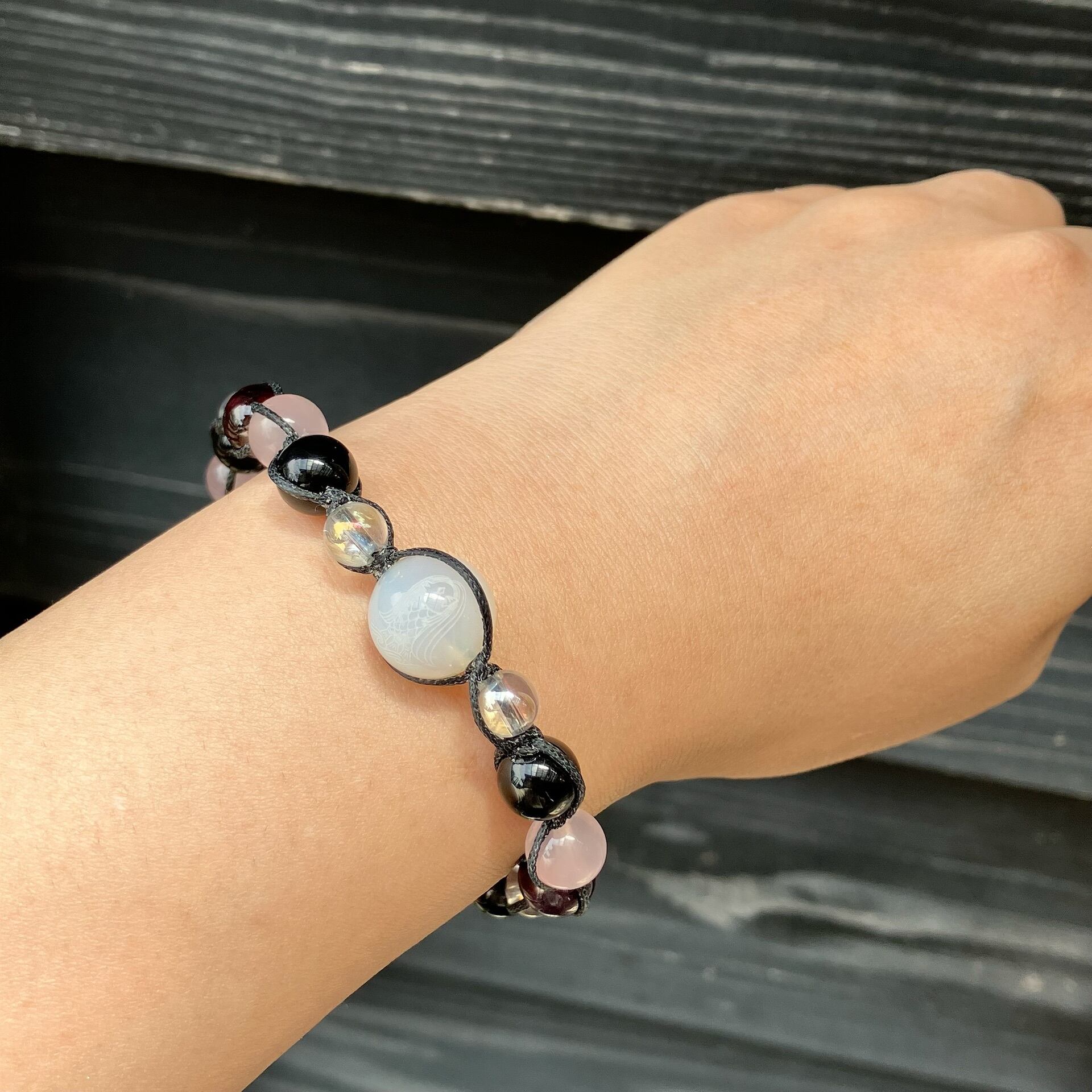 ■使用している石 白めのう(アマビエ)、ホワイトオーロラクォーツ、マダガスカルローズ、オニキス、ガーネット