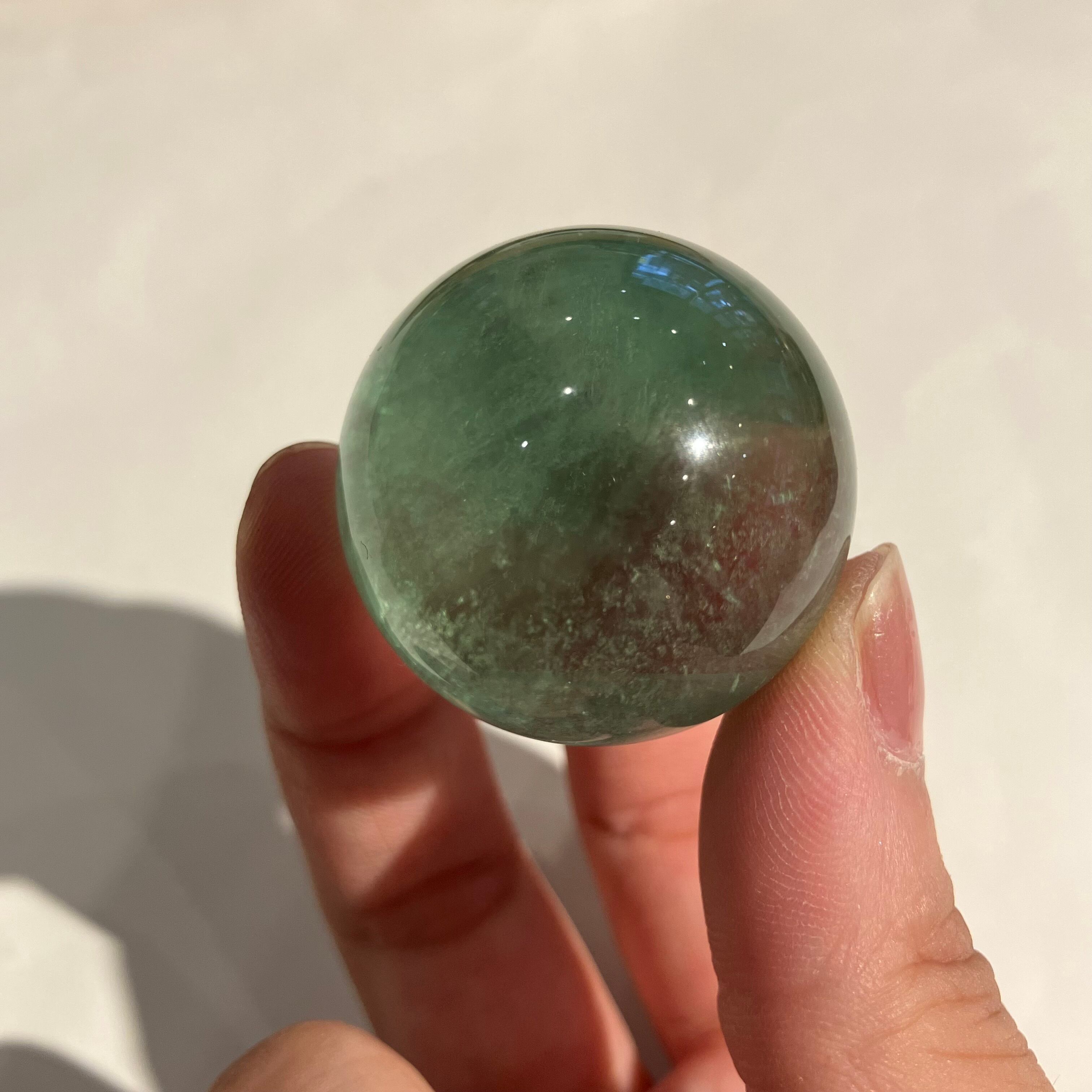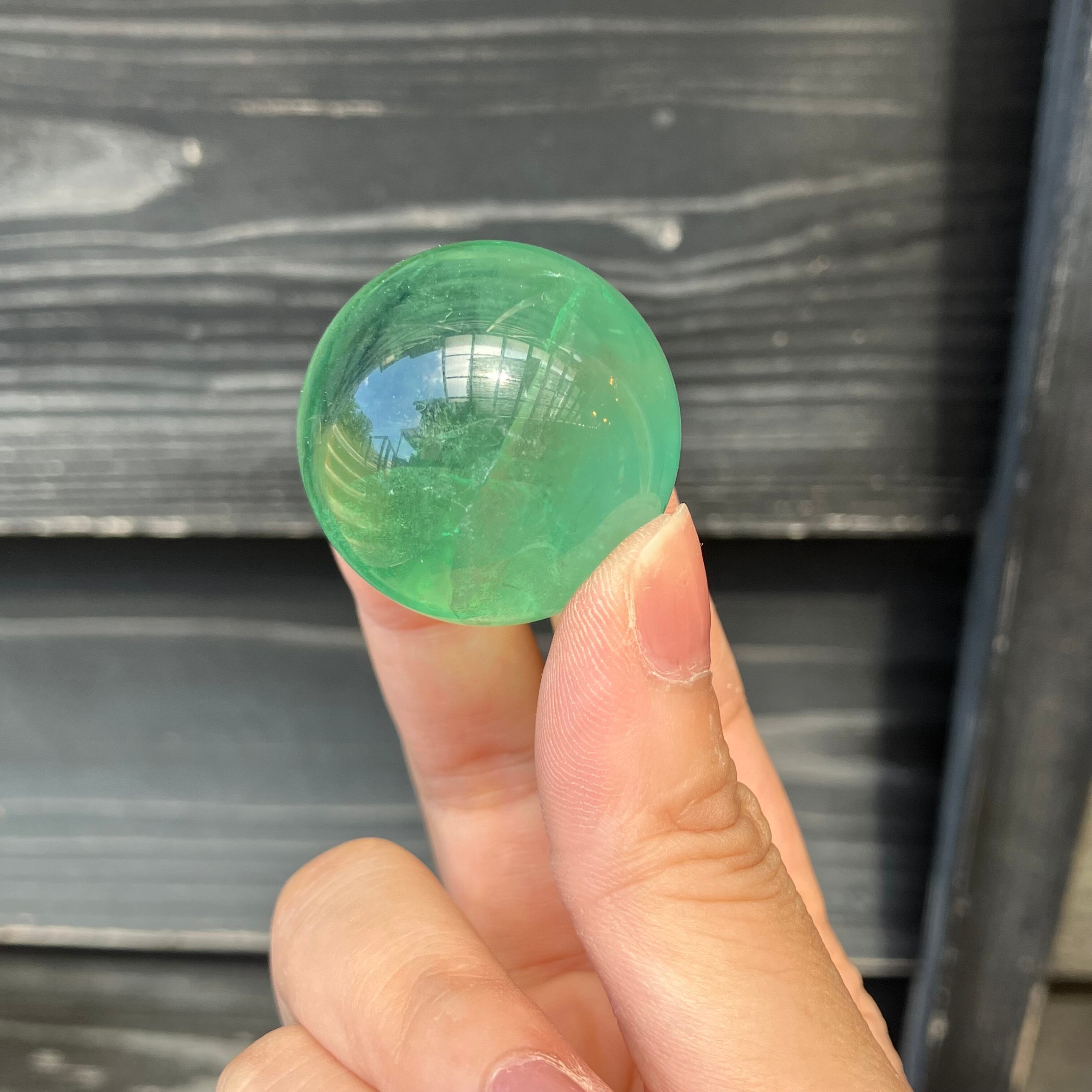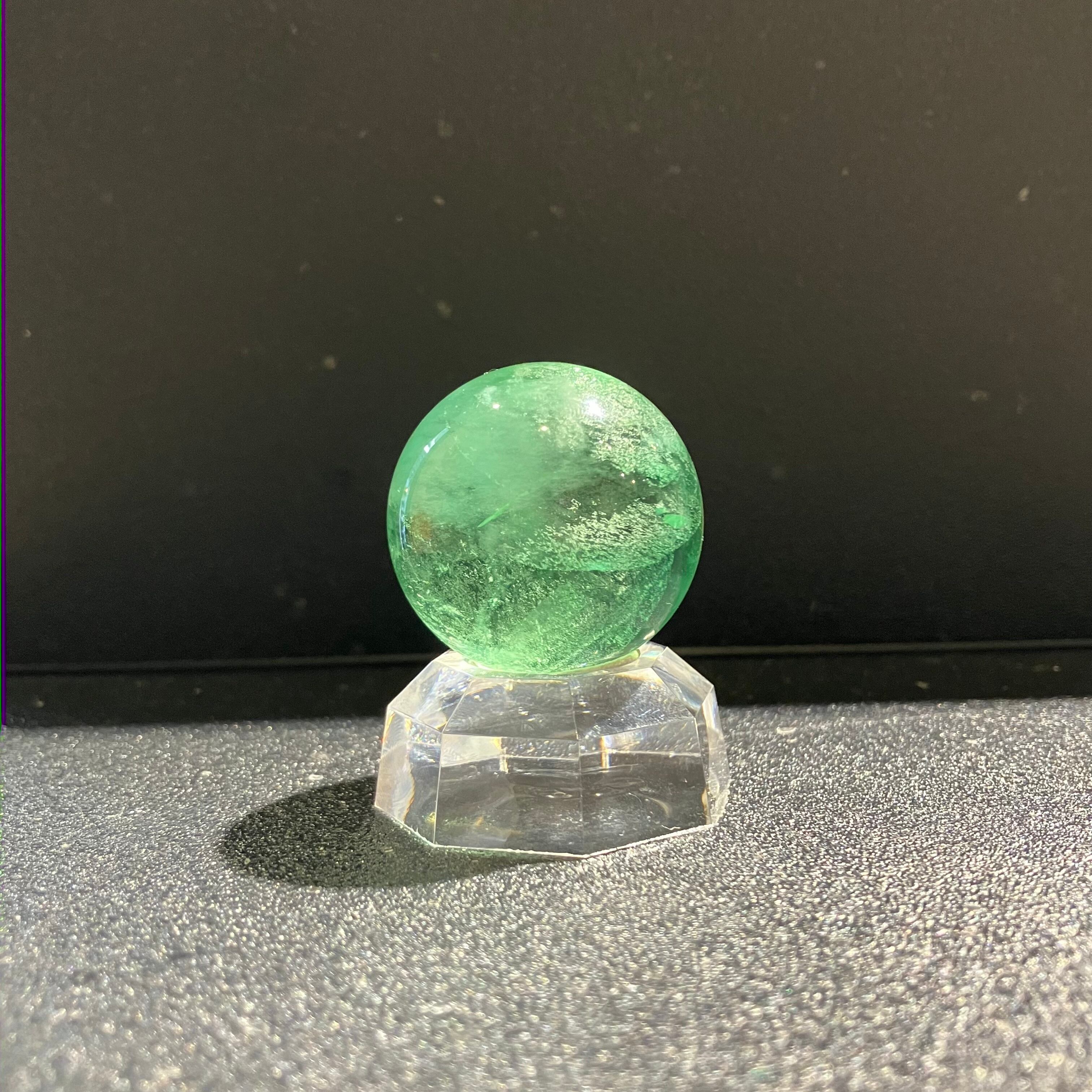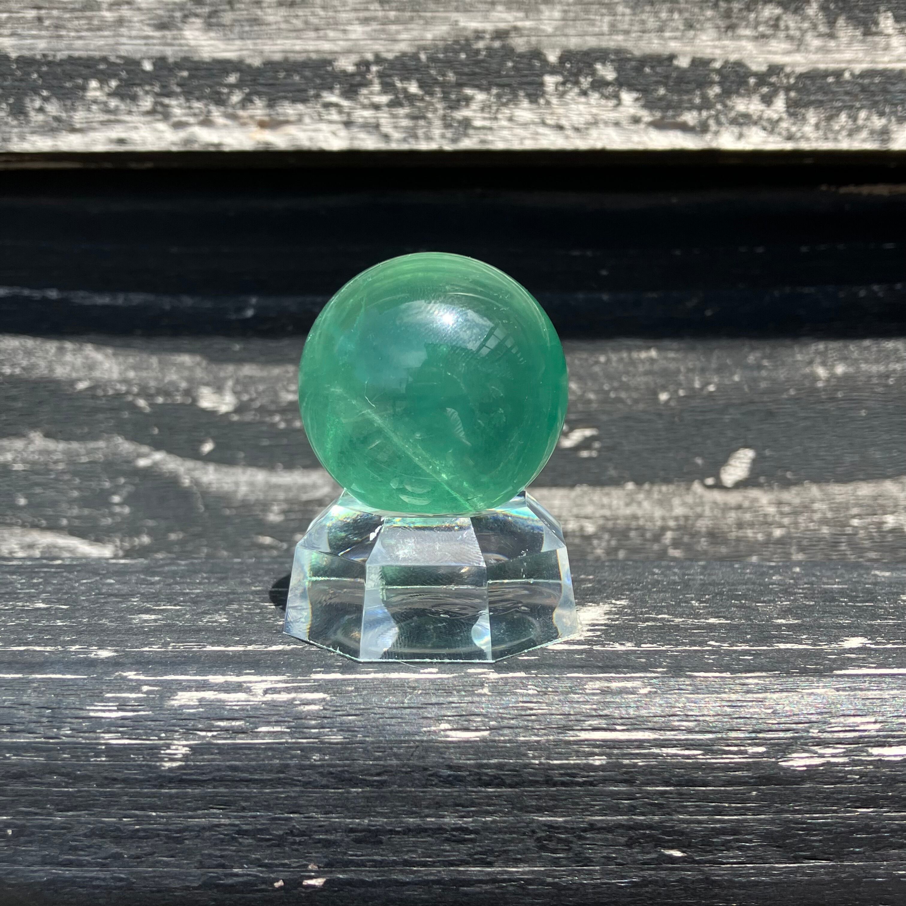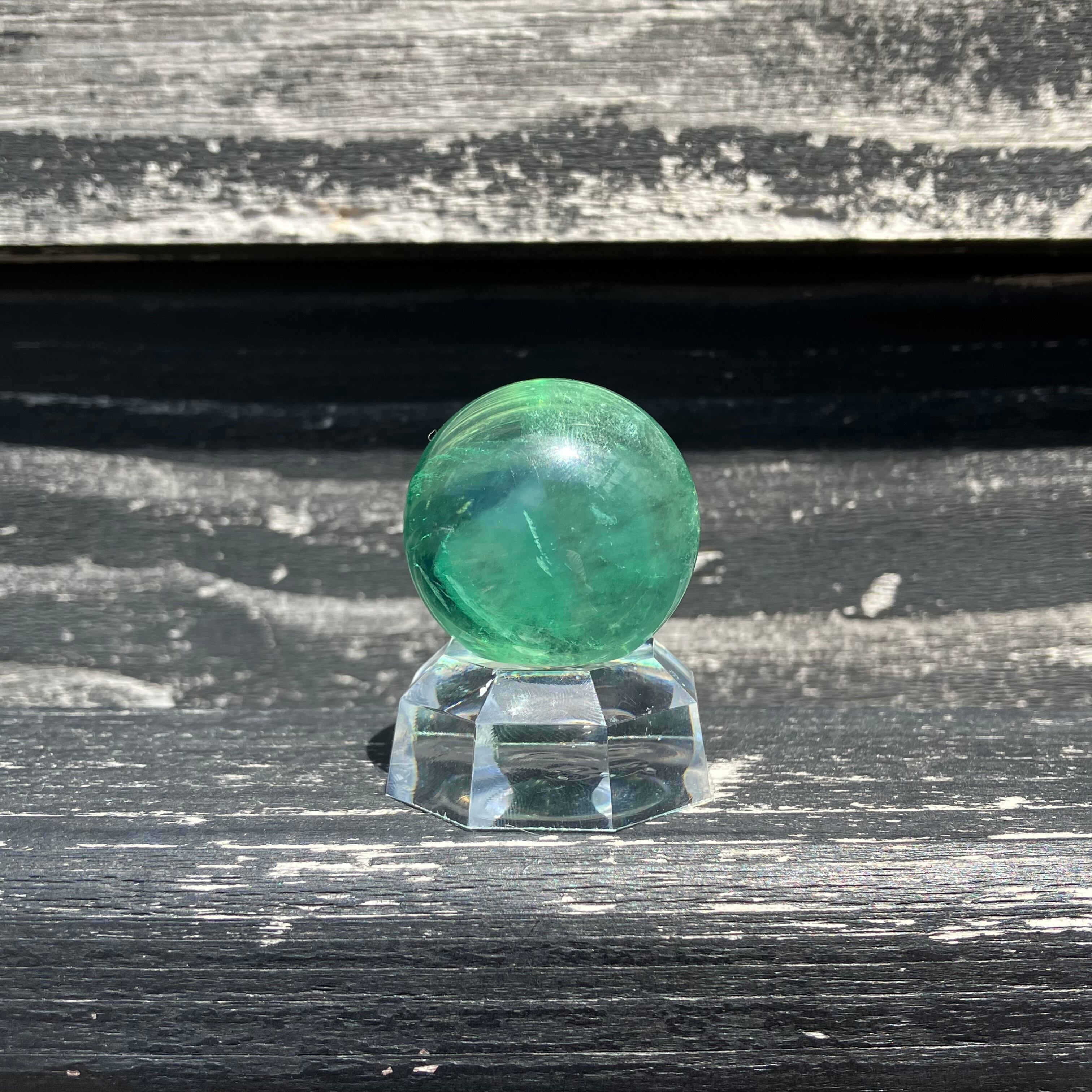 森林のような深い色をしたグリーンフローライトの丸玉です。