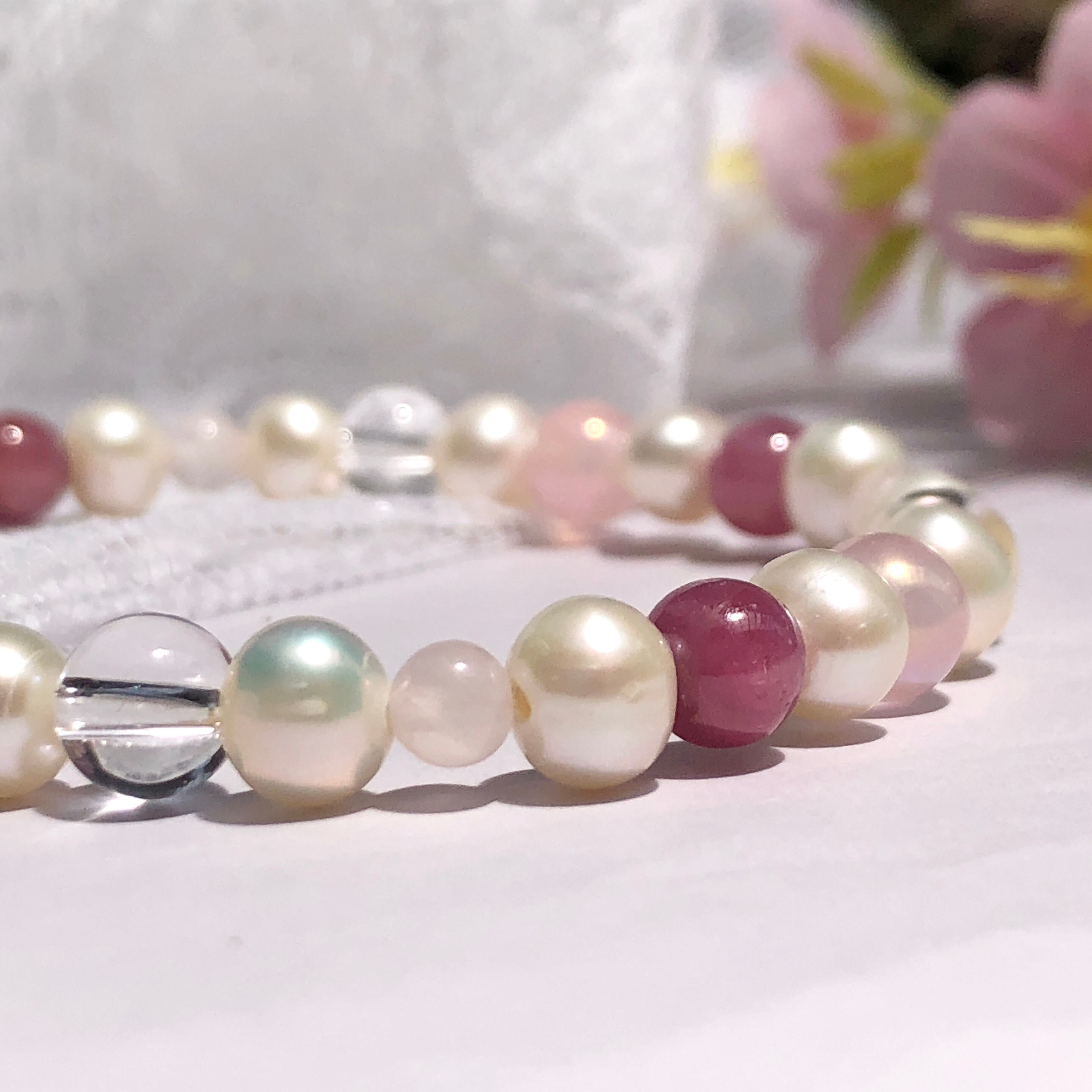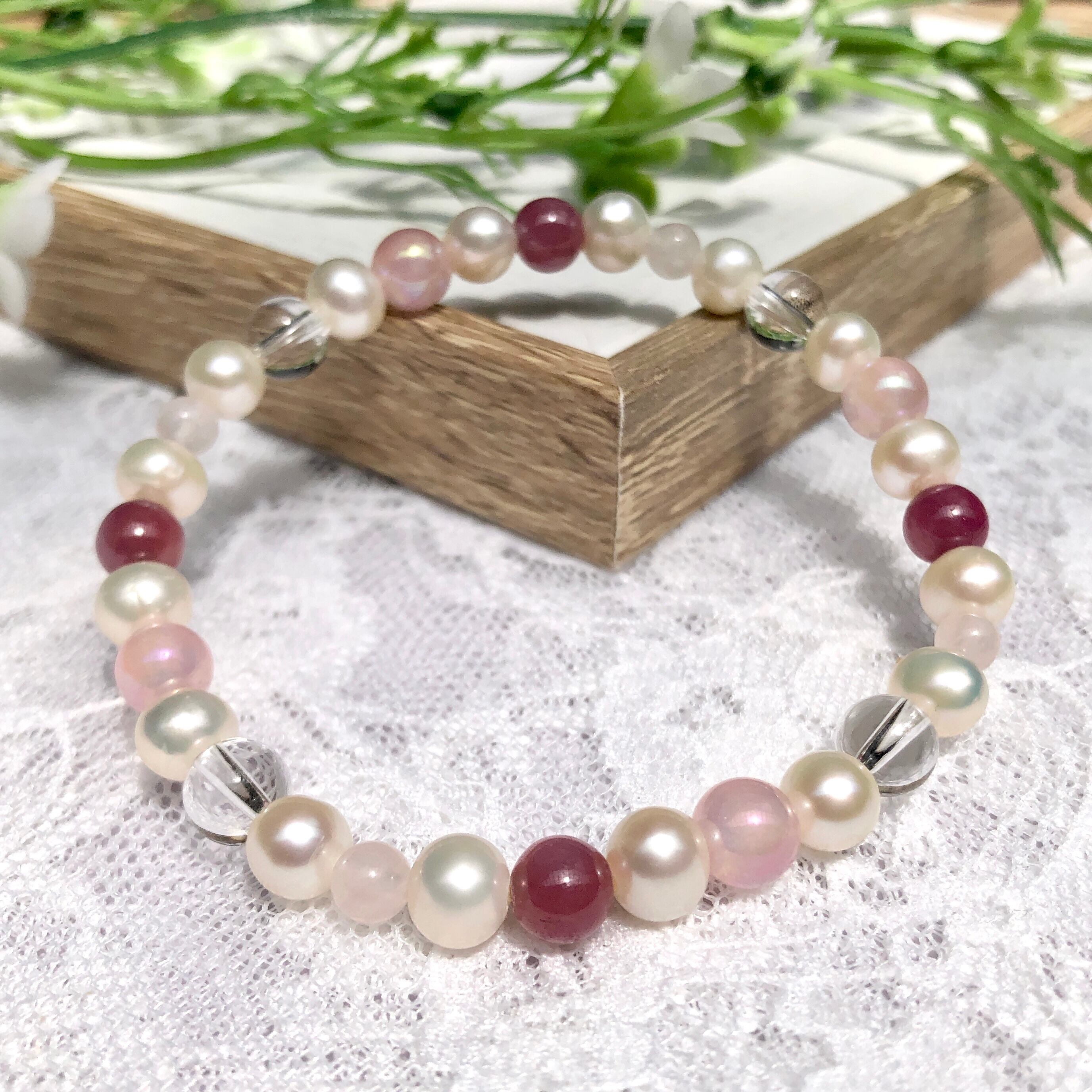 そんなルビーとパール、ローズクォーツなどを組み合わせた、華やかで夏にピッタリなブレスレットに仕上がっております。