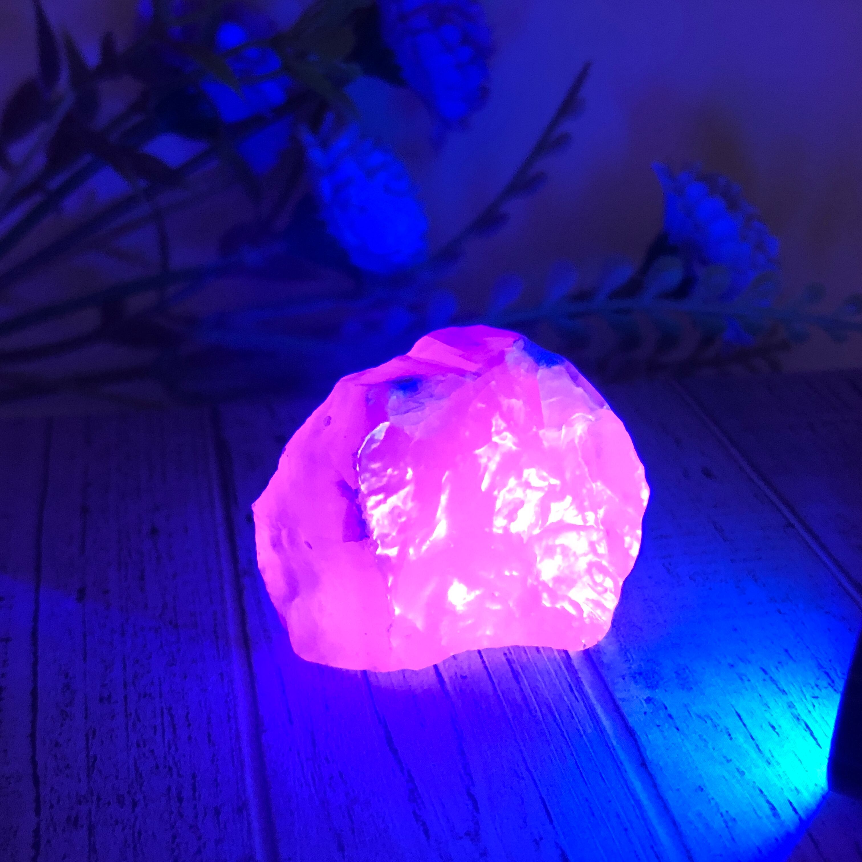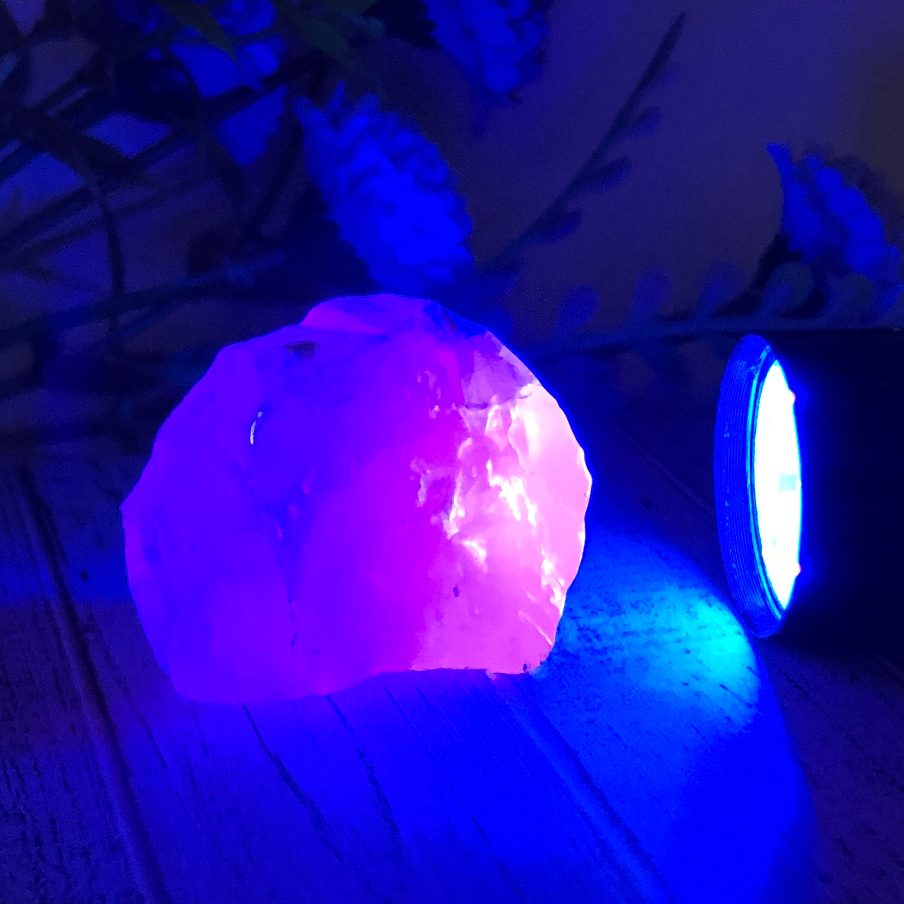 暗い場所で紫外線ライトを当てると鮮やかなピンク色に蛍光し、とても幻想的な色合いが見られる蛍光鉱物です。