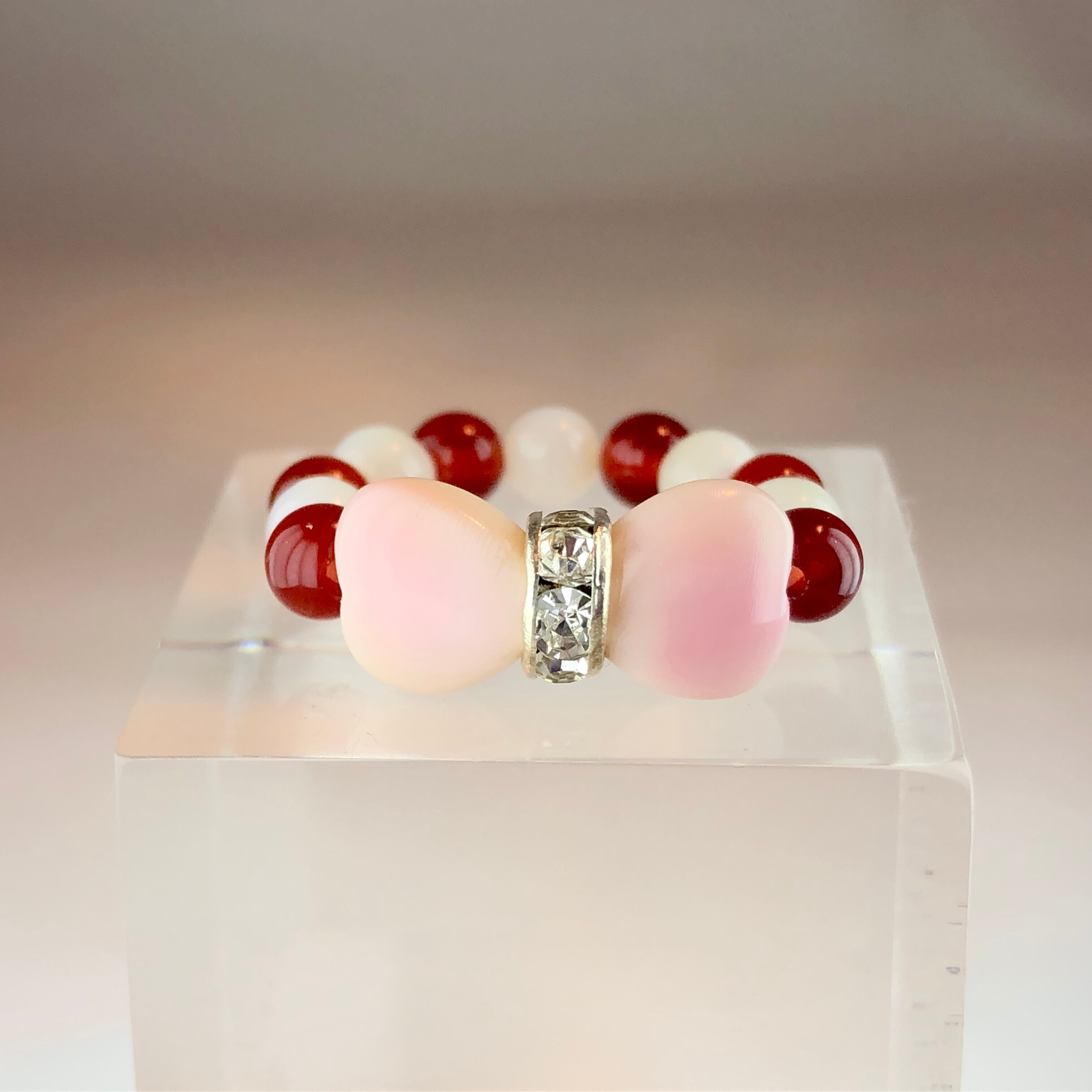 クィーンコンクシェルを使用したリボンモチーフと赤メノウ、マザーオブパールを組み合わせた可愛らしいリングです♡