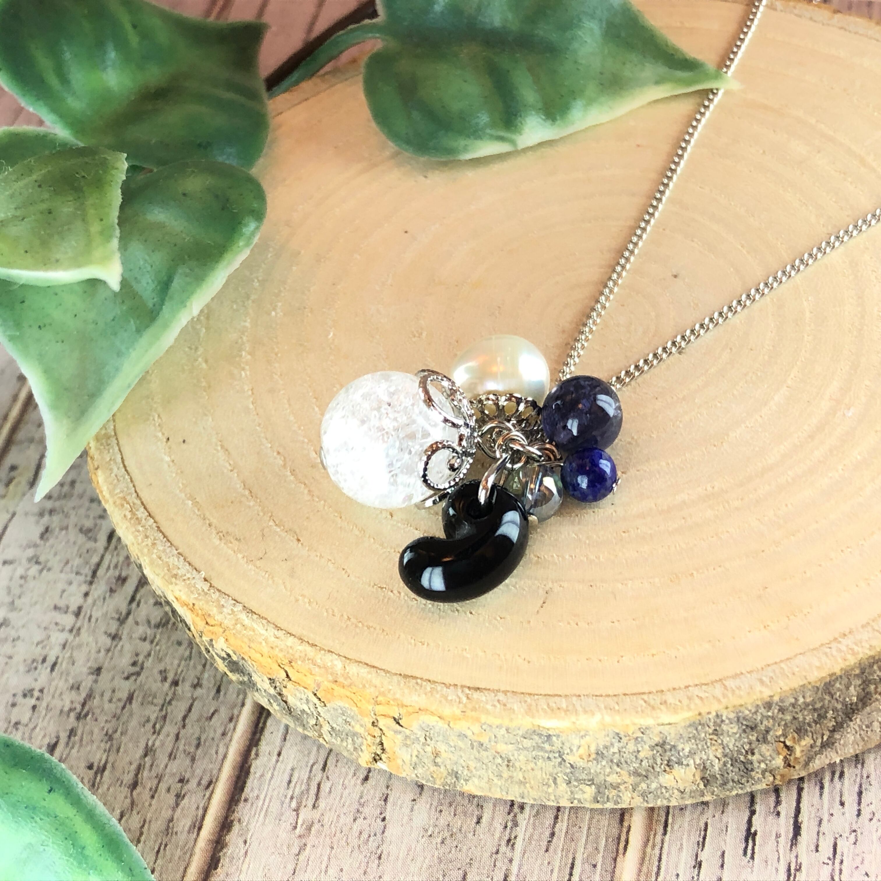 そんな勾玉と様々な天然石を組み合わせ、ころんとした可愛らしいネックレスに仕上げました。