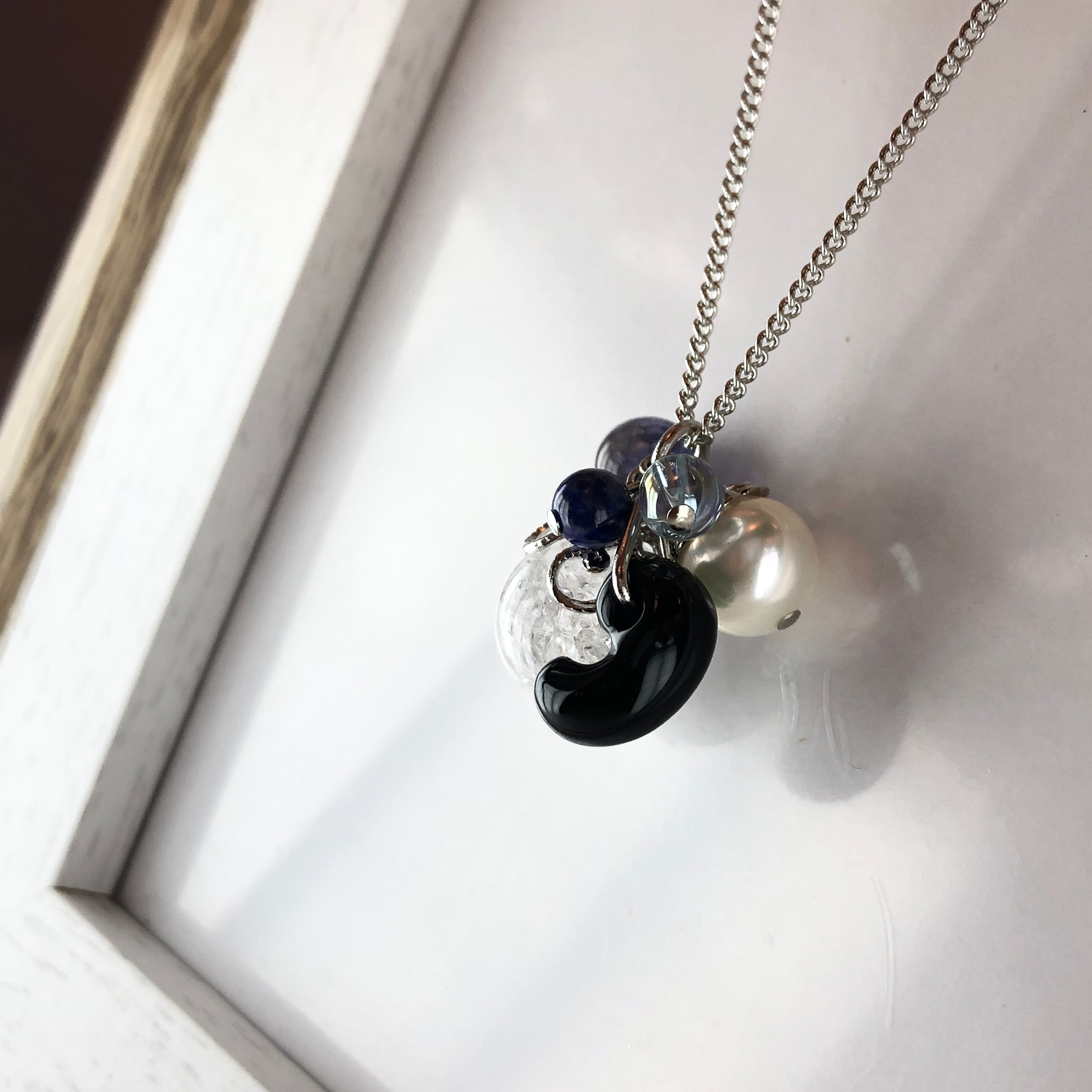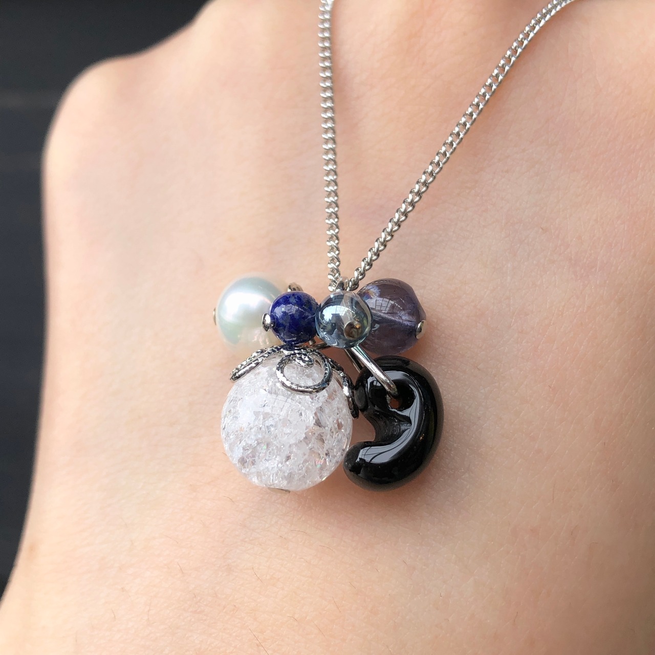 オニキス(勾玉)、アイオライト、ラピスラズリ、アクアオーラ、クラック水晶、淡水パール