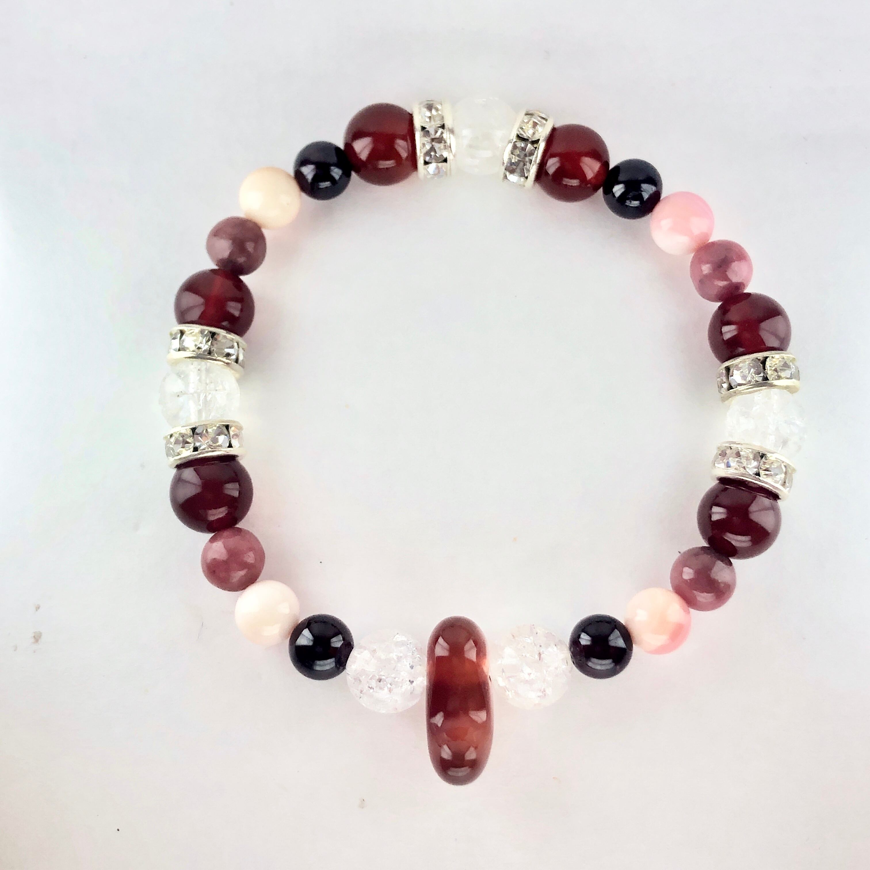 ■使用している石 赤めのう(勾玉)、ガーネット、クラック水晶、クィーンコンクシェル、ロードナイト、ロンデル(金具パーツ)
