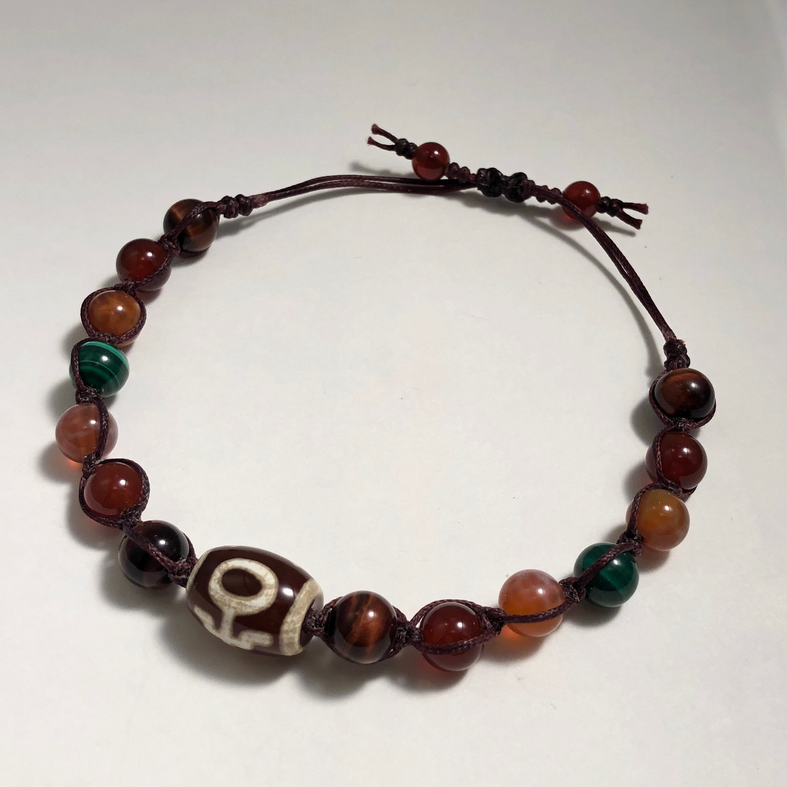 ■使用している石 大人天珠(赤めのう)、レッドタイガーアイ、ファイヤーアゲート、赤めのう、マラカイト