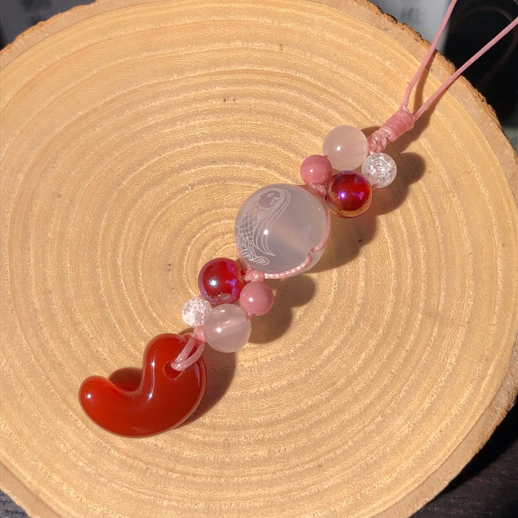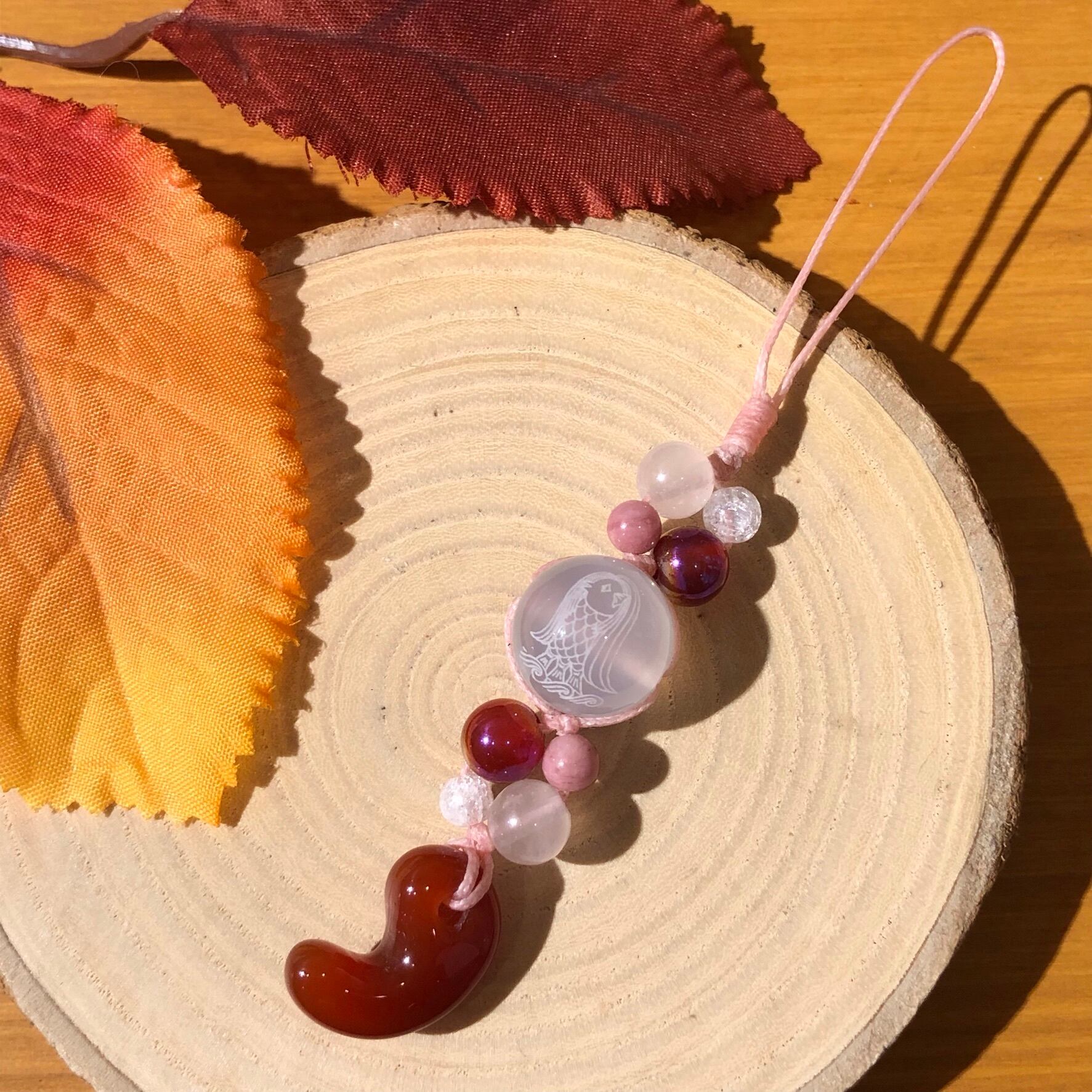 そんなアマビエの彫りが入った白めのう(精神安定)と様々な天然石を組み合わせてオリジナルのストラップを作りました♡