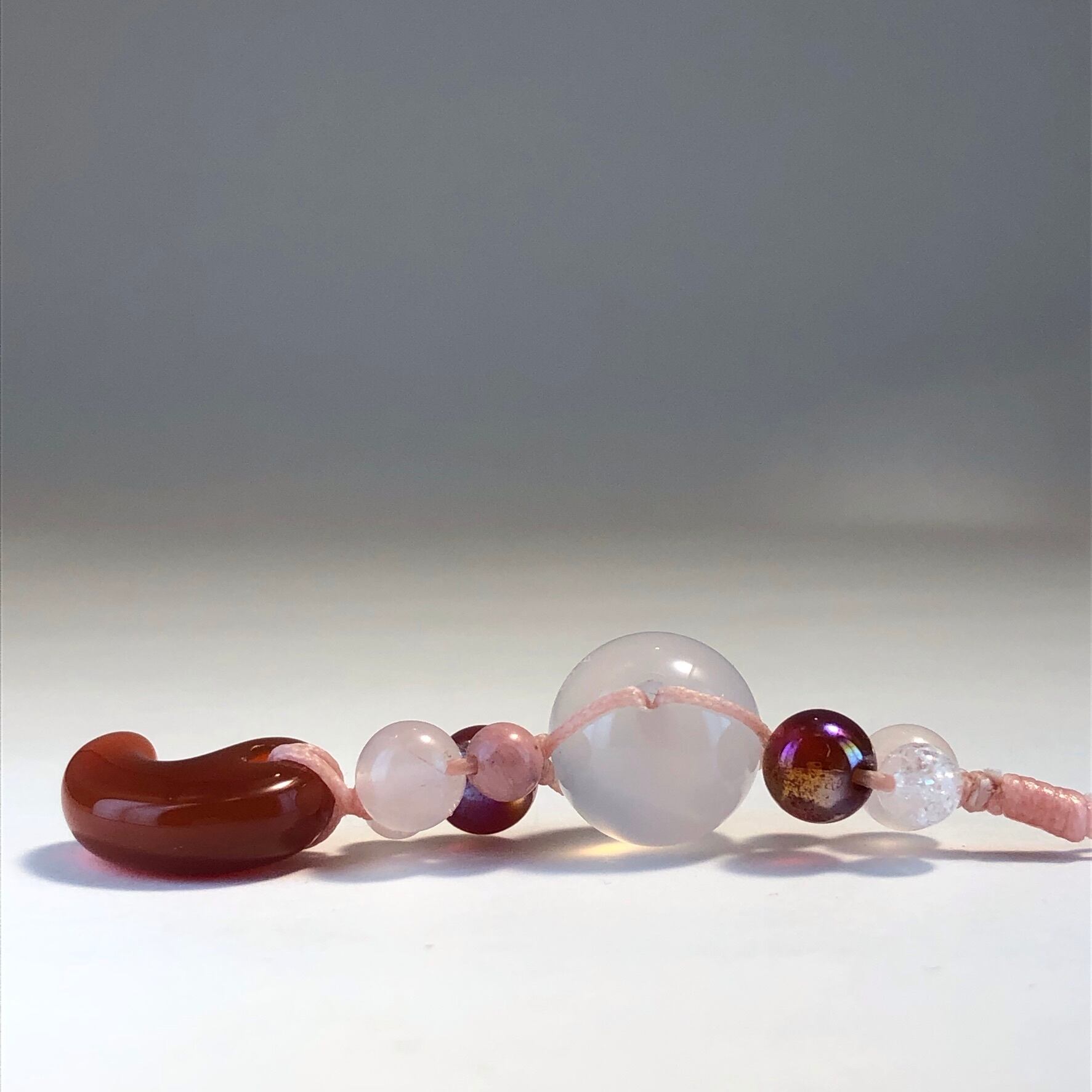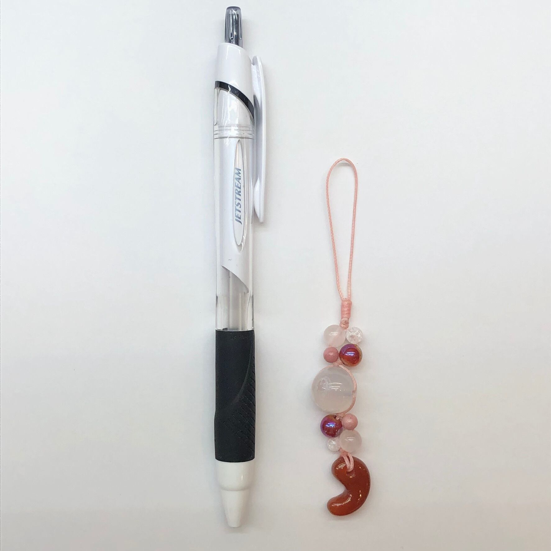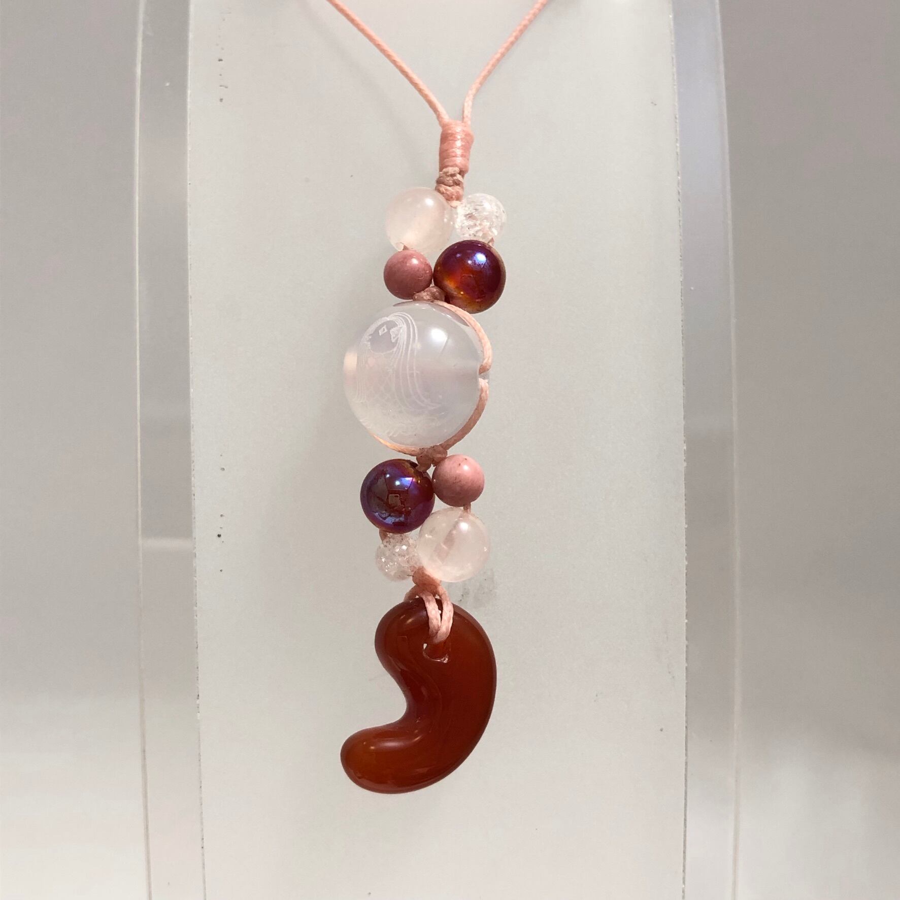 愛と優しさを育むといわれるロードナイトをはじめ、生命力や行動力を高めてくれるような天然石を組み合わせ、優しく可愛らしい印象のストラップに作り上げています♪