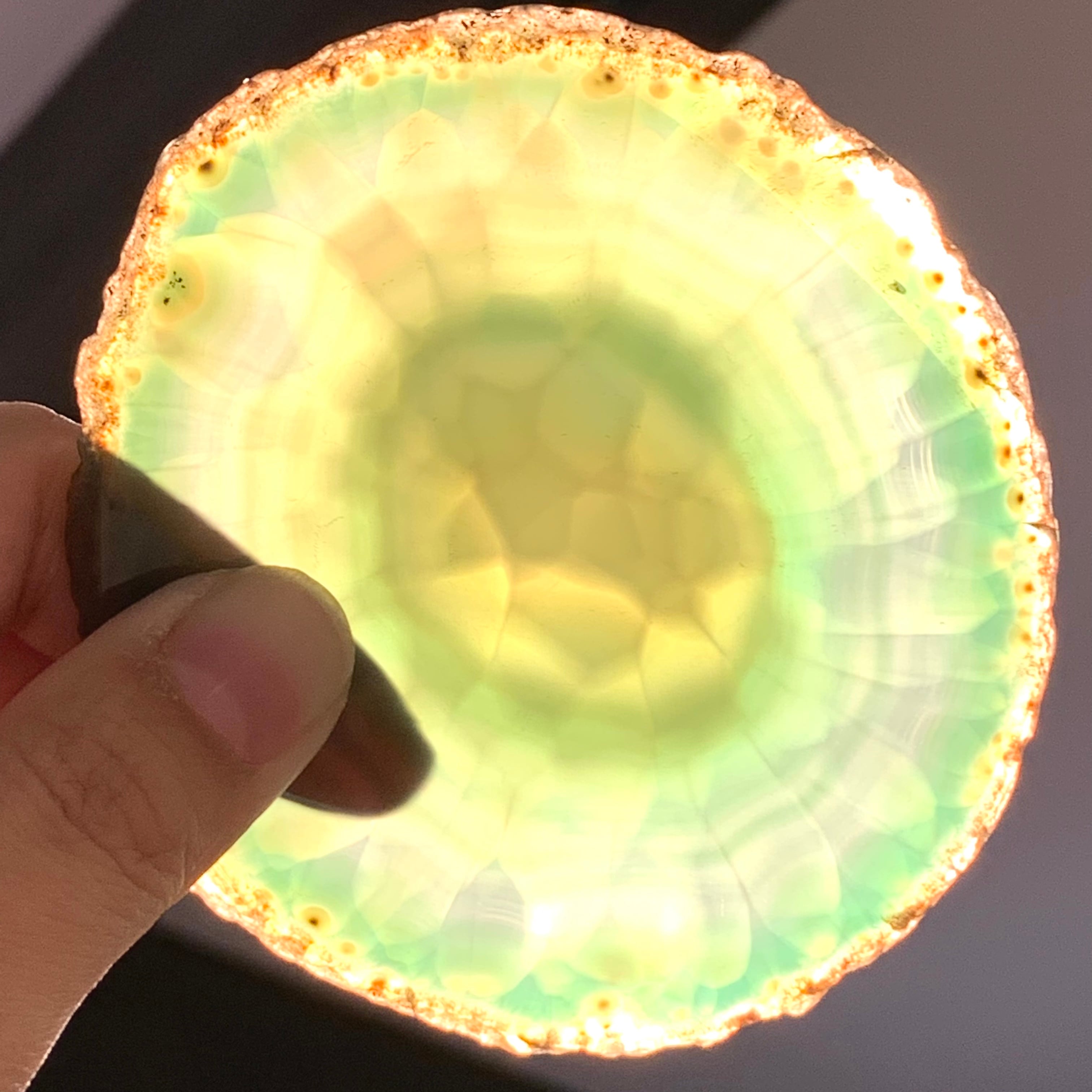 メノウは多孔質で光を透かすため、明るい所にかざしてみると模様や色味がハッキリ現れ、また違った美しさを発見できます。
