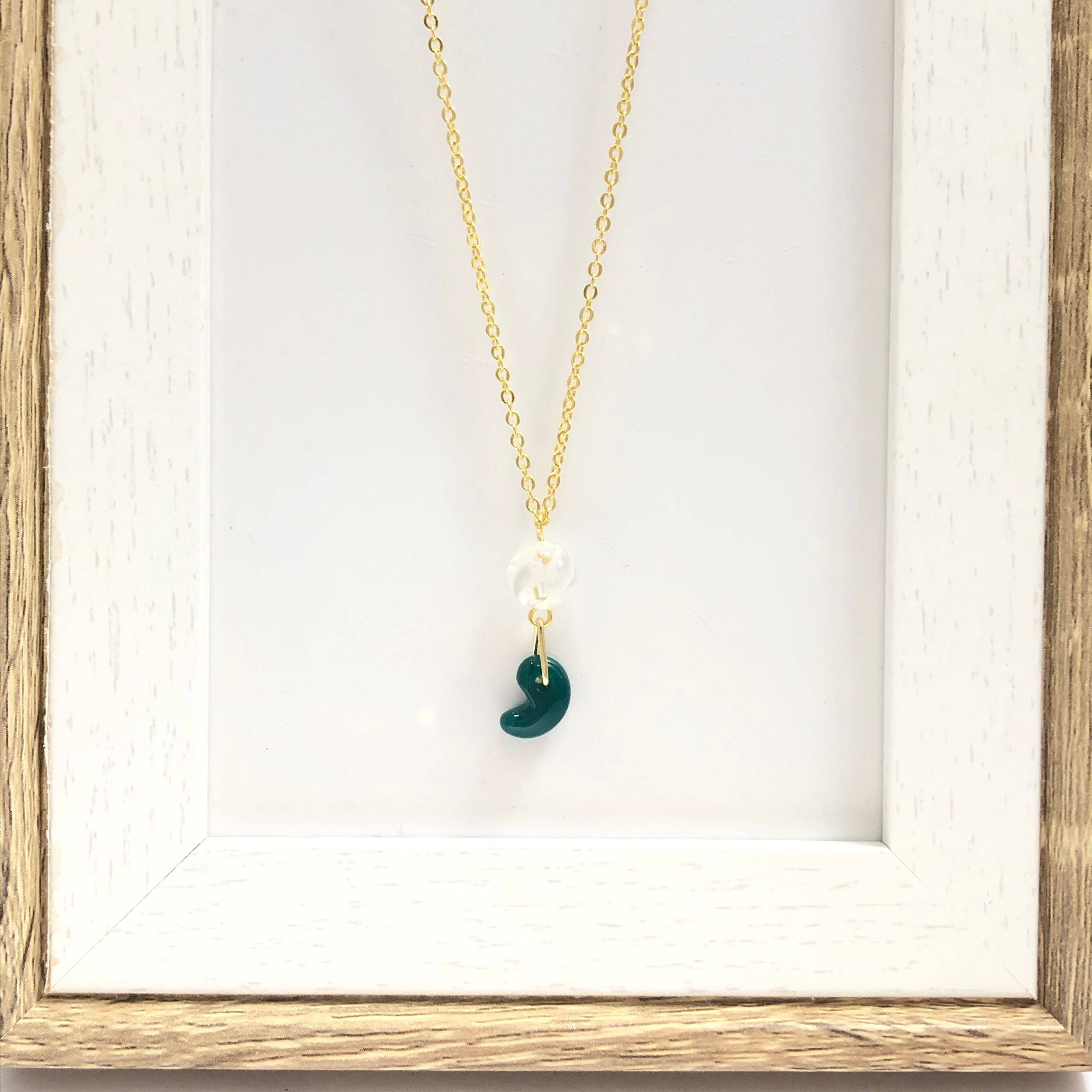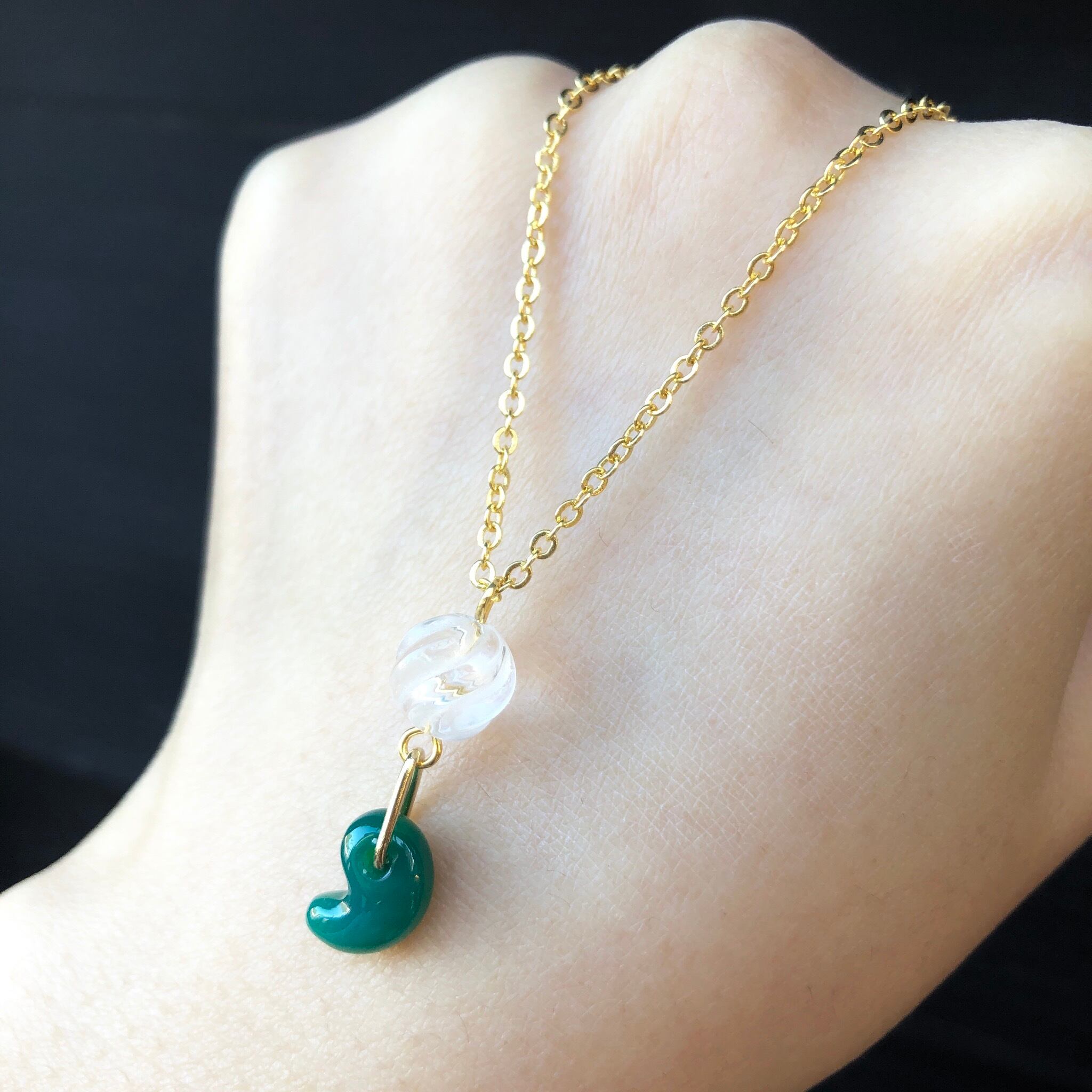 青めのう10mm(勾玉)、水晶8mm(ウェーブカット)