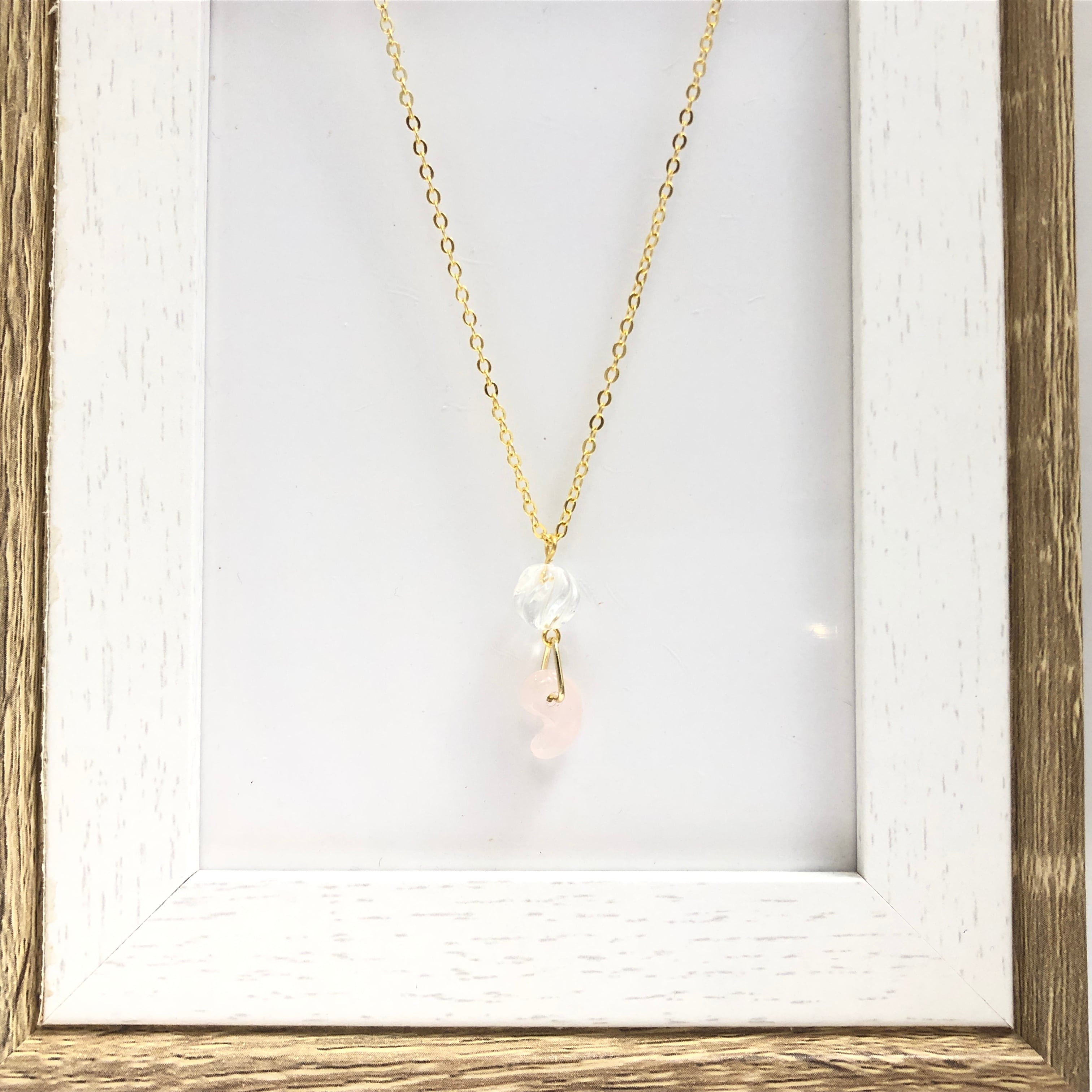 ローズクォーツ10mm(勾玉)、水晶8mm(ウェーブカット)