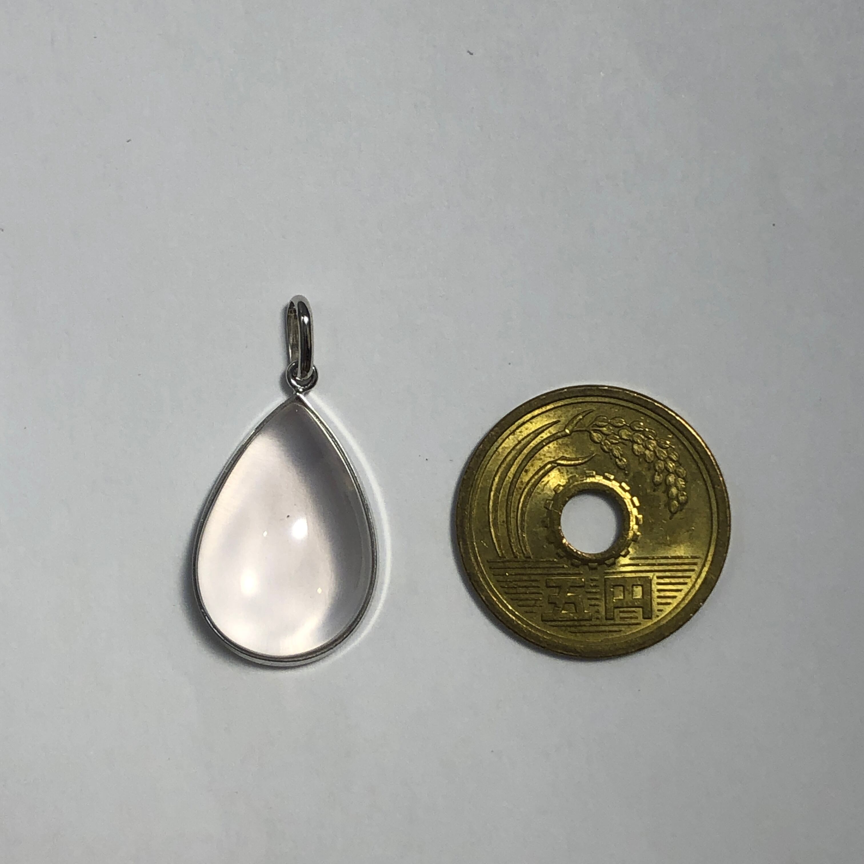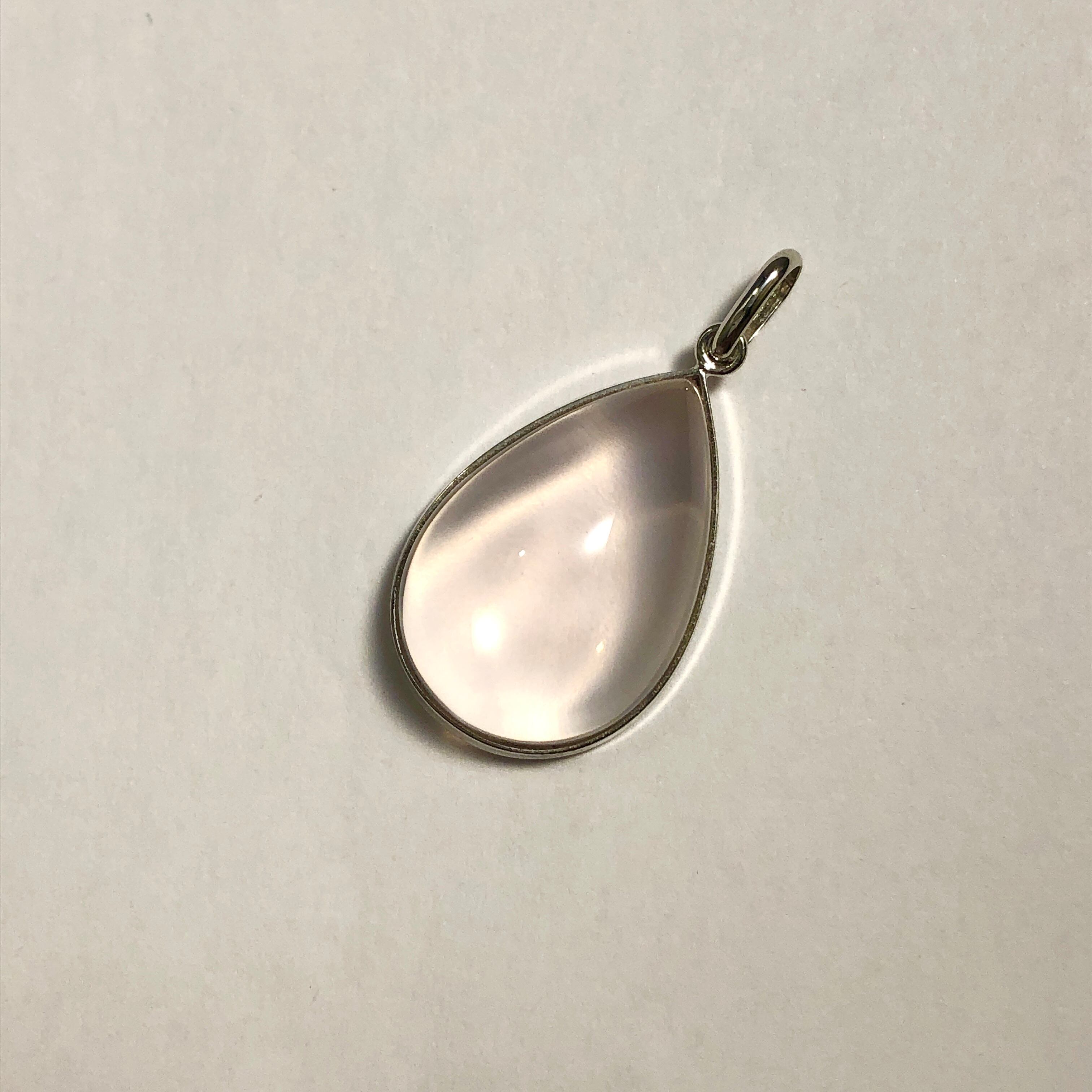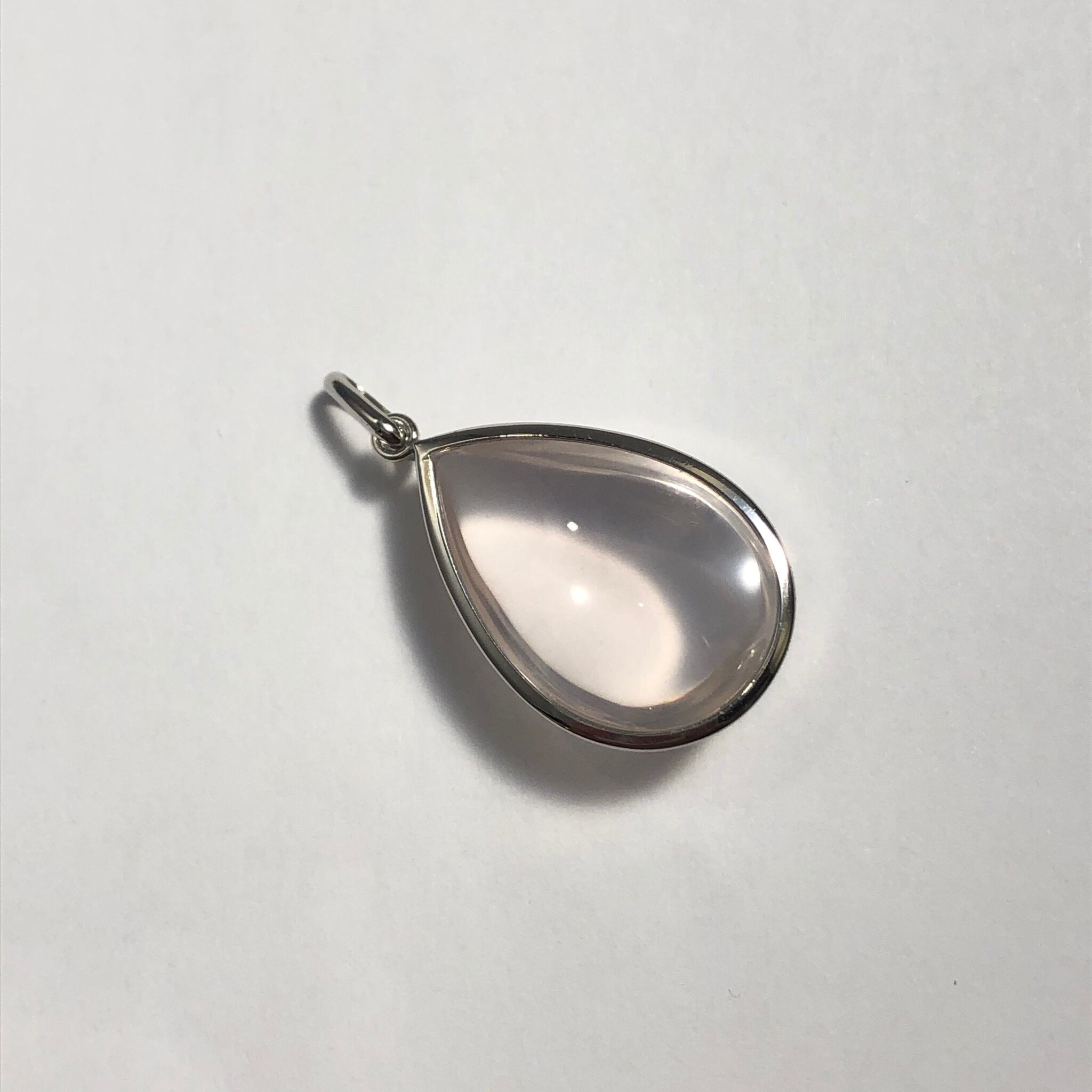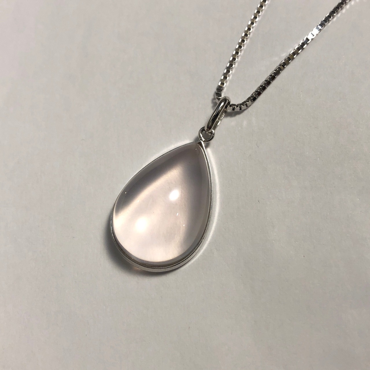 透明度が高くほんのり淡いピンク色のローズクォーツを、ぷっくりとした雫型にカットしたペンダントです。