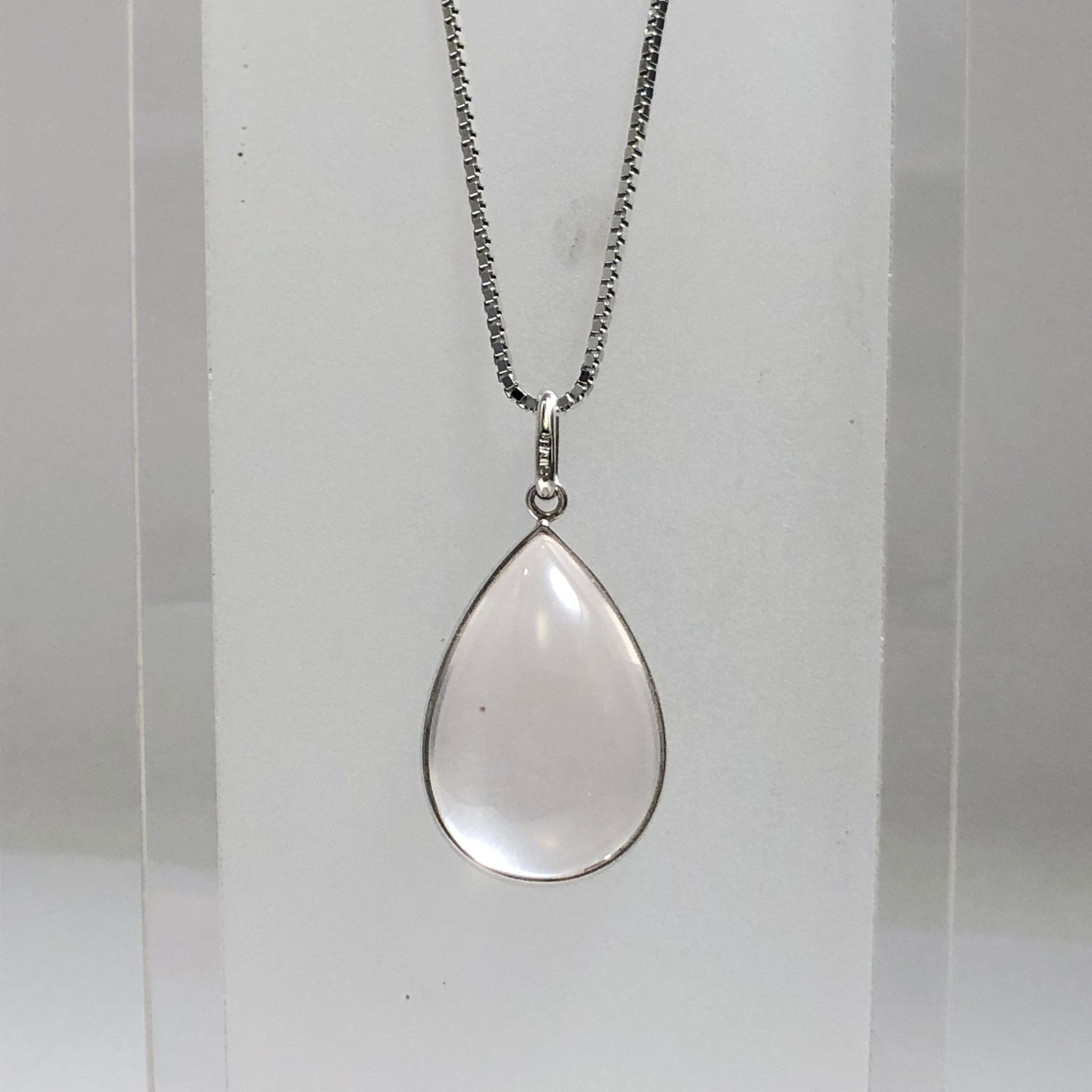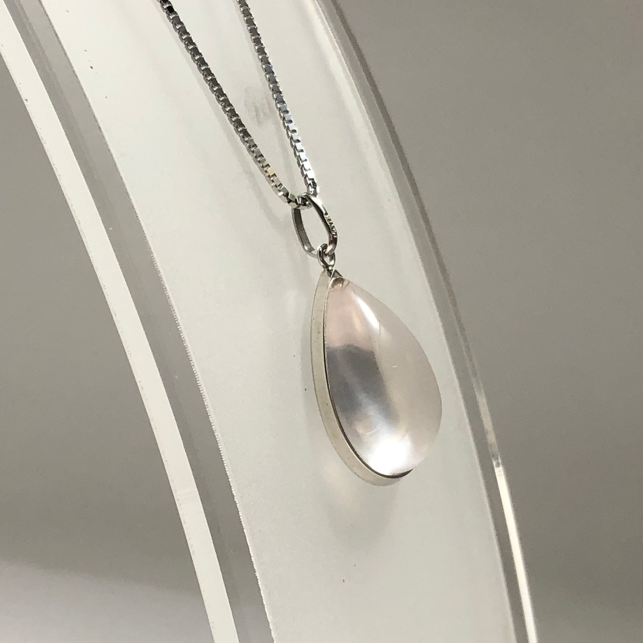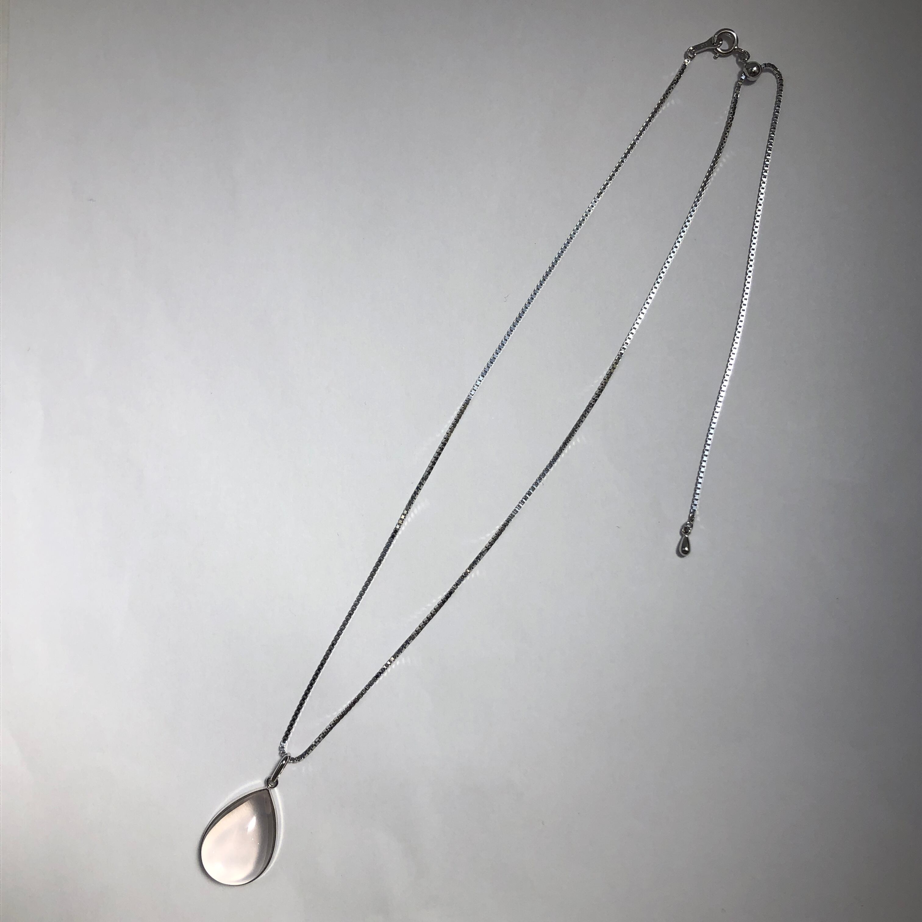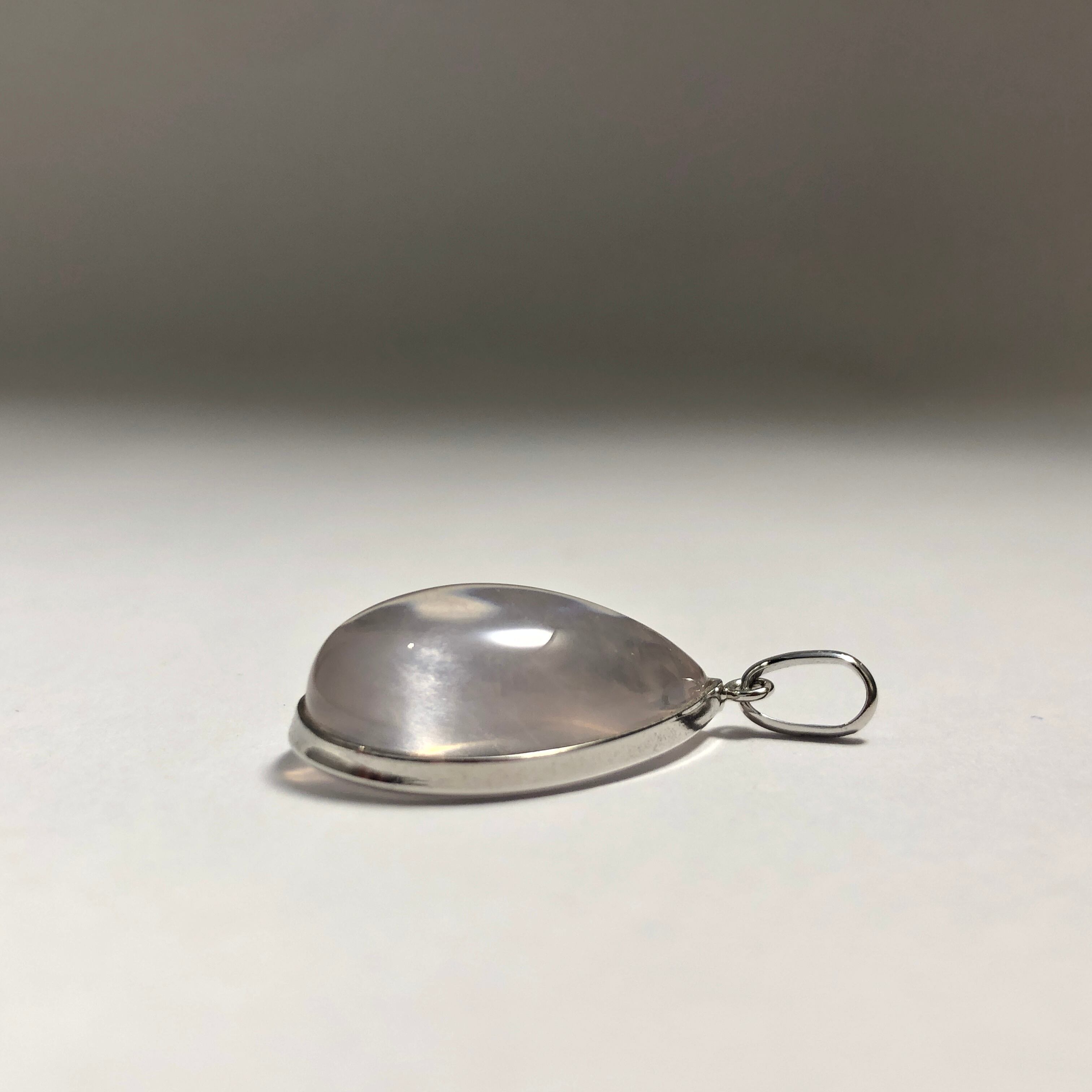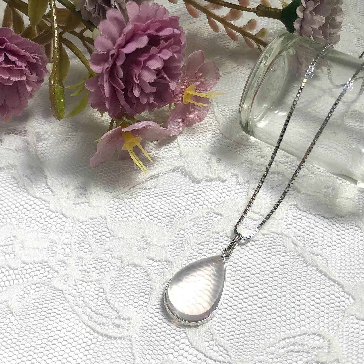 透明度が高くほんのり淡いピンク色のローズクォーツを、ぷっくりとした雫型にカットしたペンダントです。