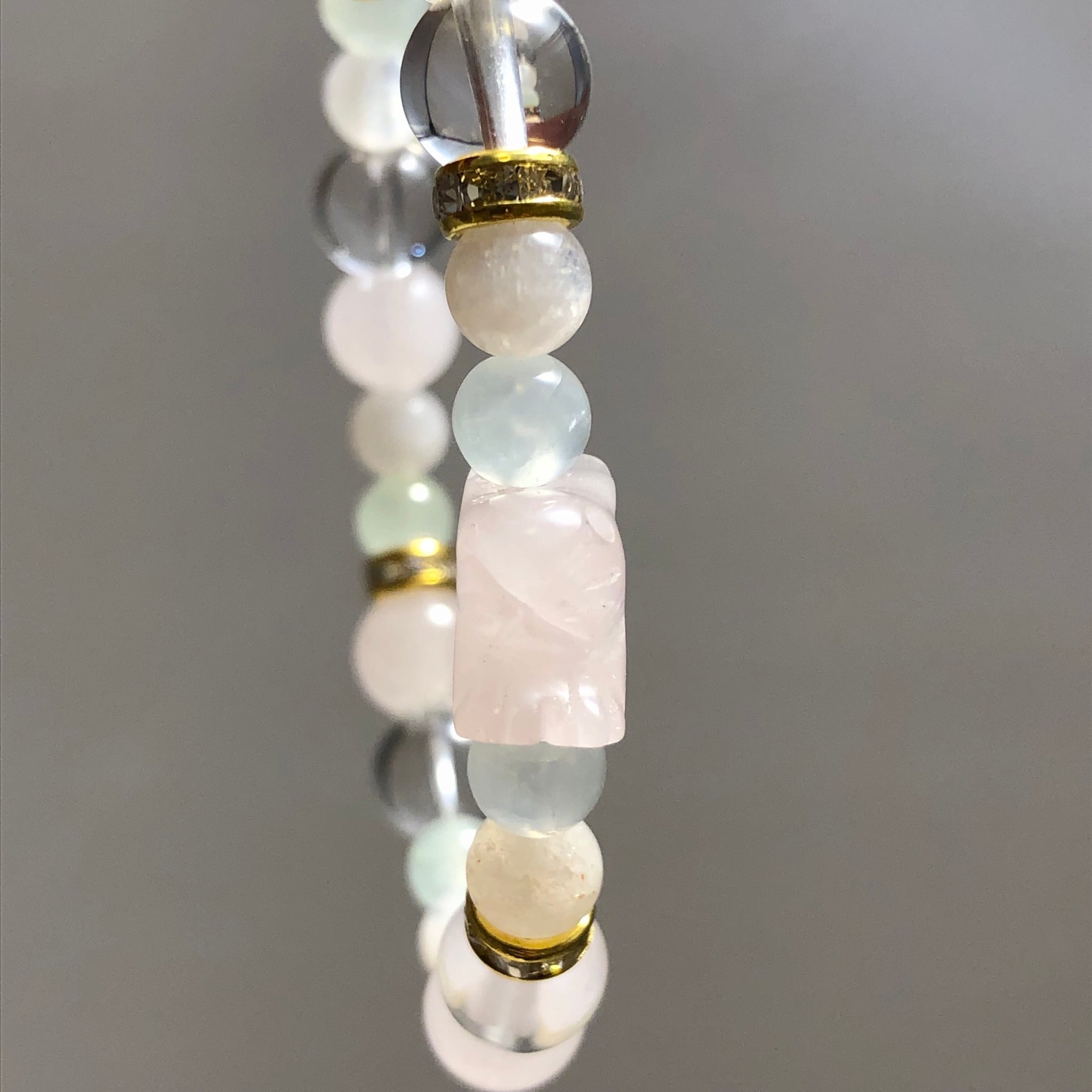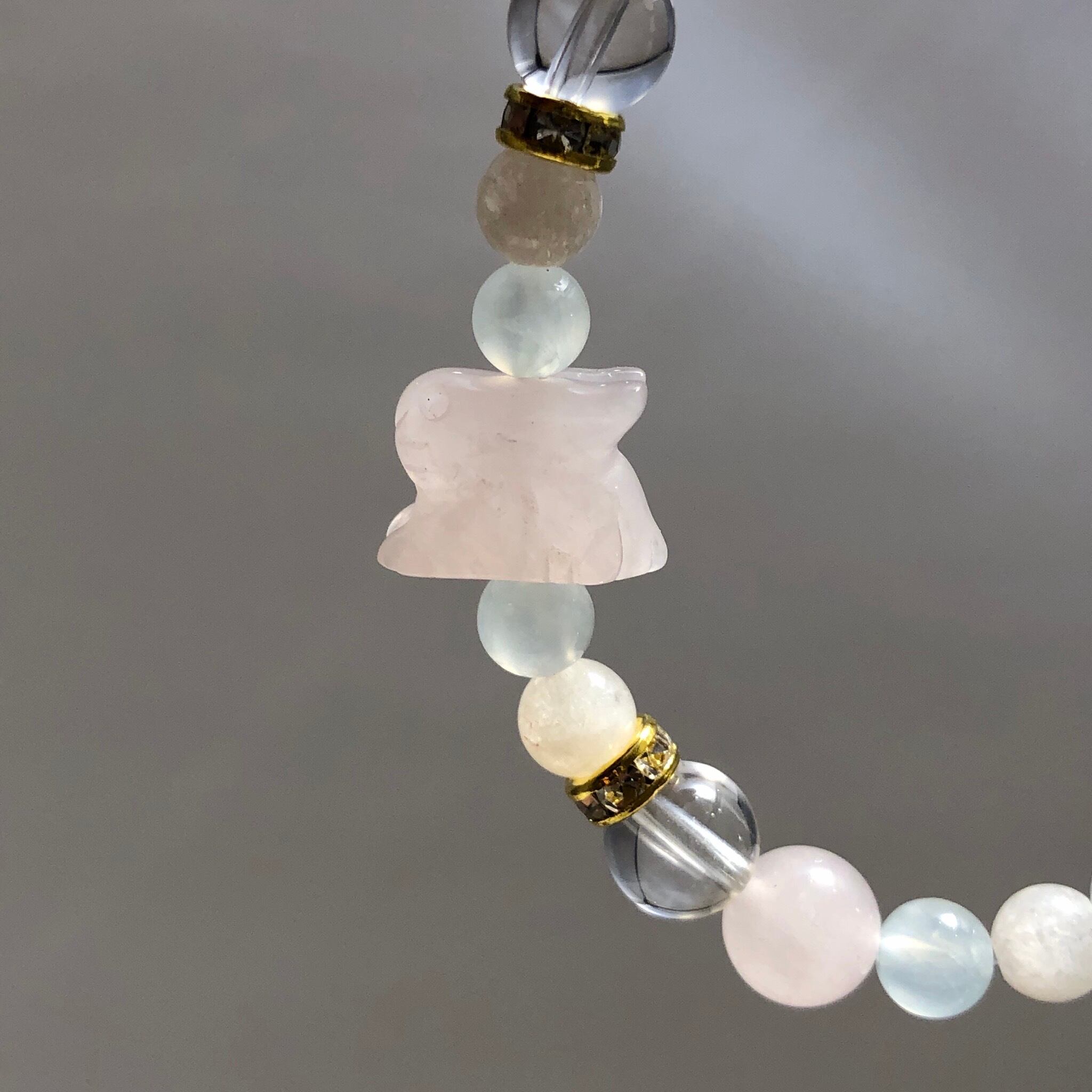 ■使用している石 ローズクォーツ(うさぎ)、ムーンストーン、ローズクォーツ、ミルキープレナイト、水晶、ロンデル(金具パーツ)