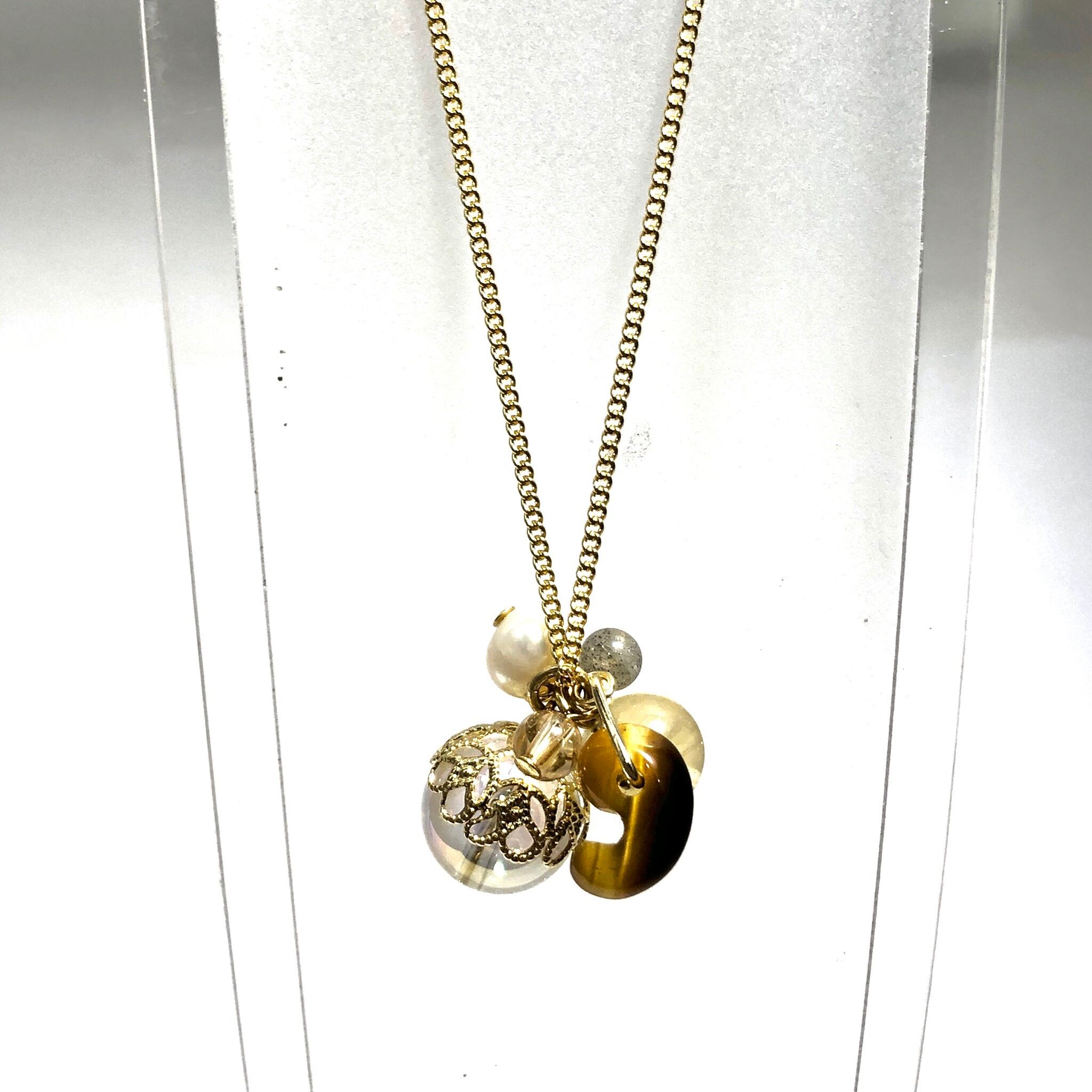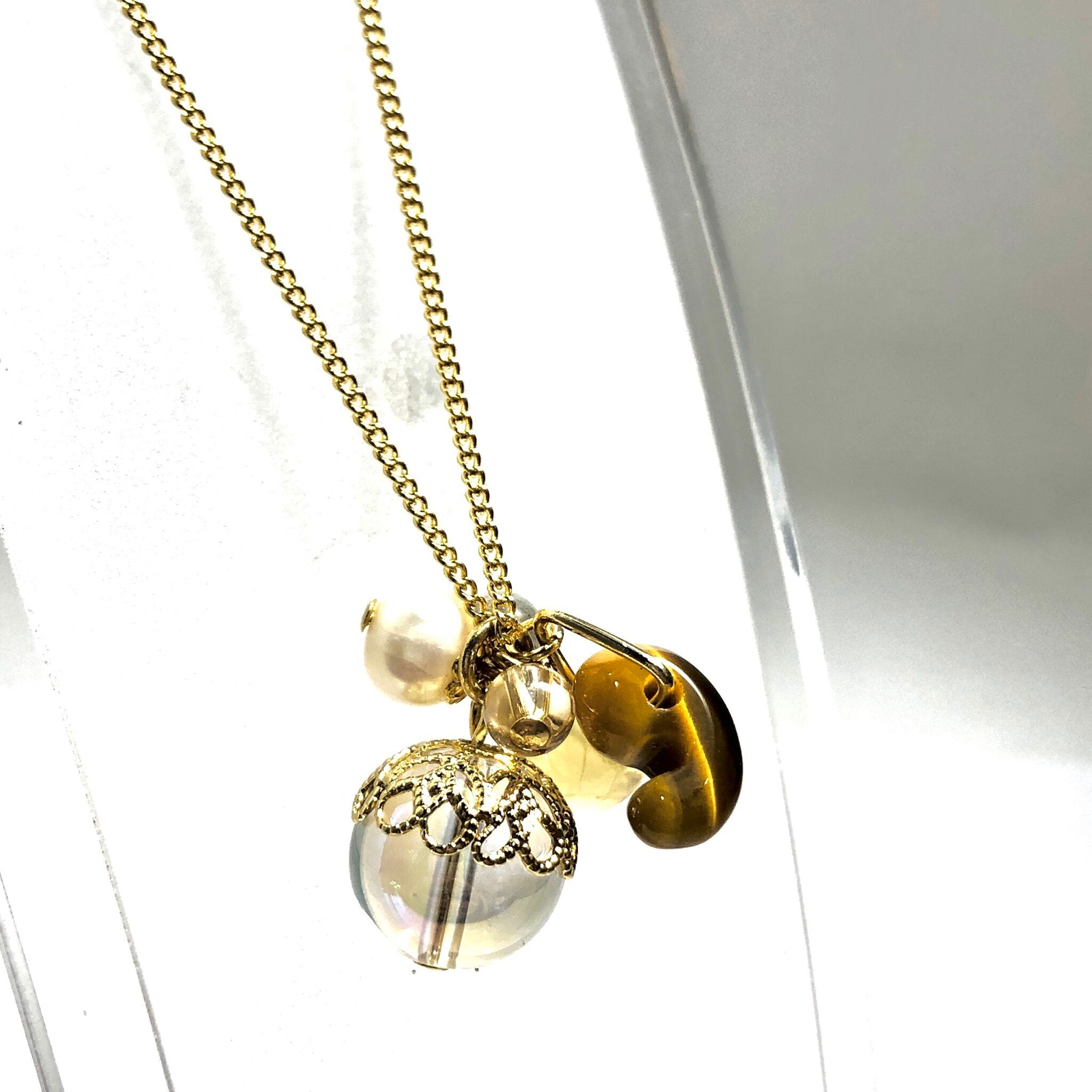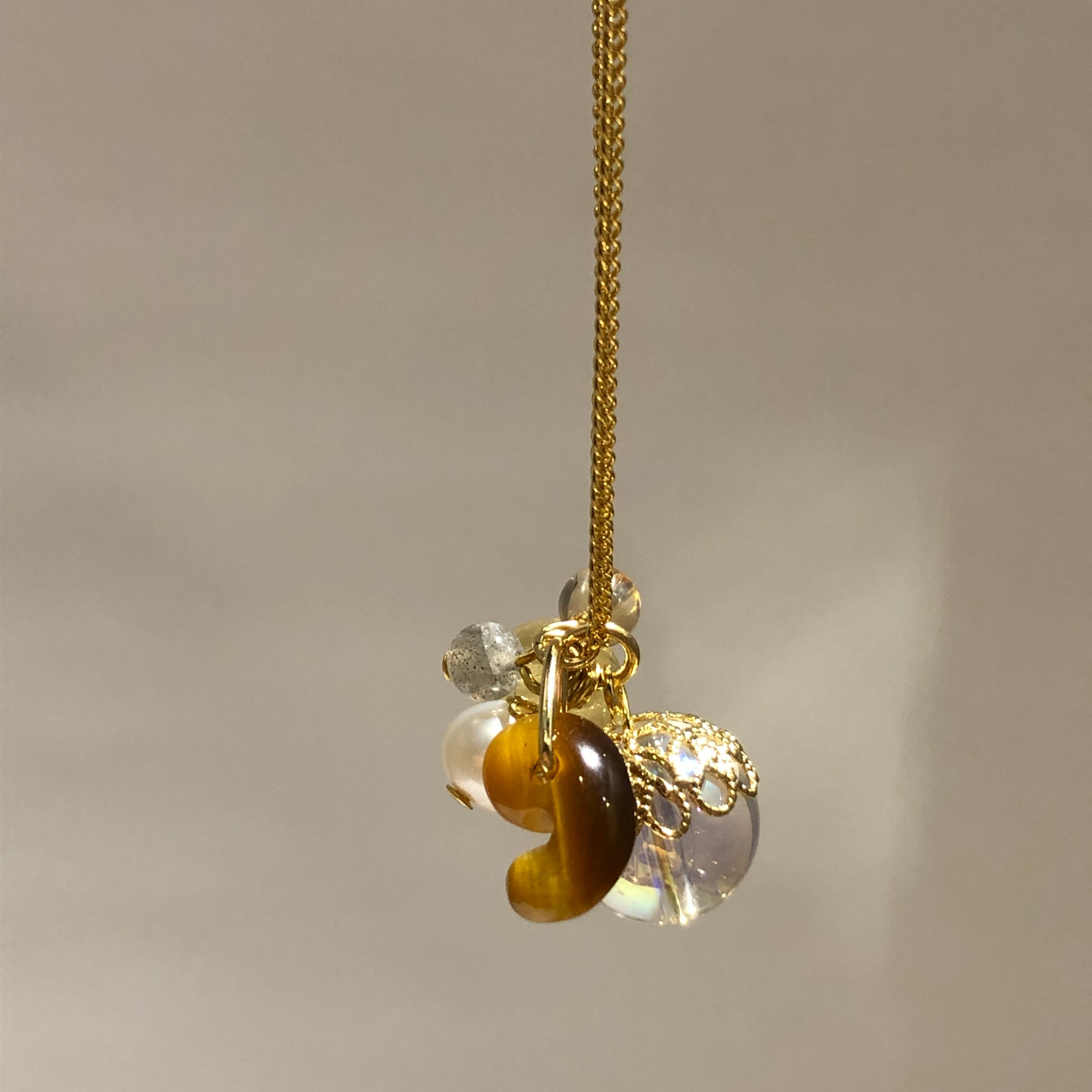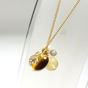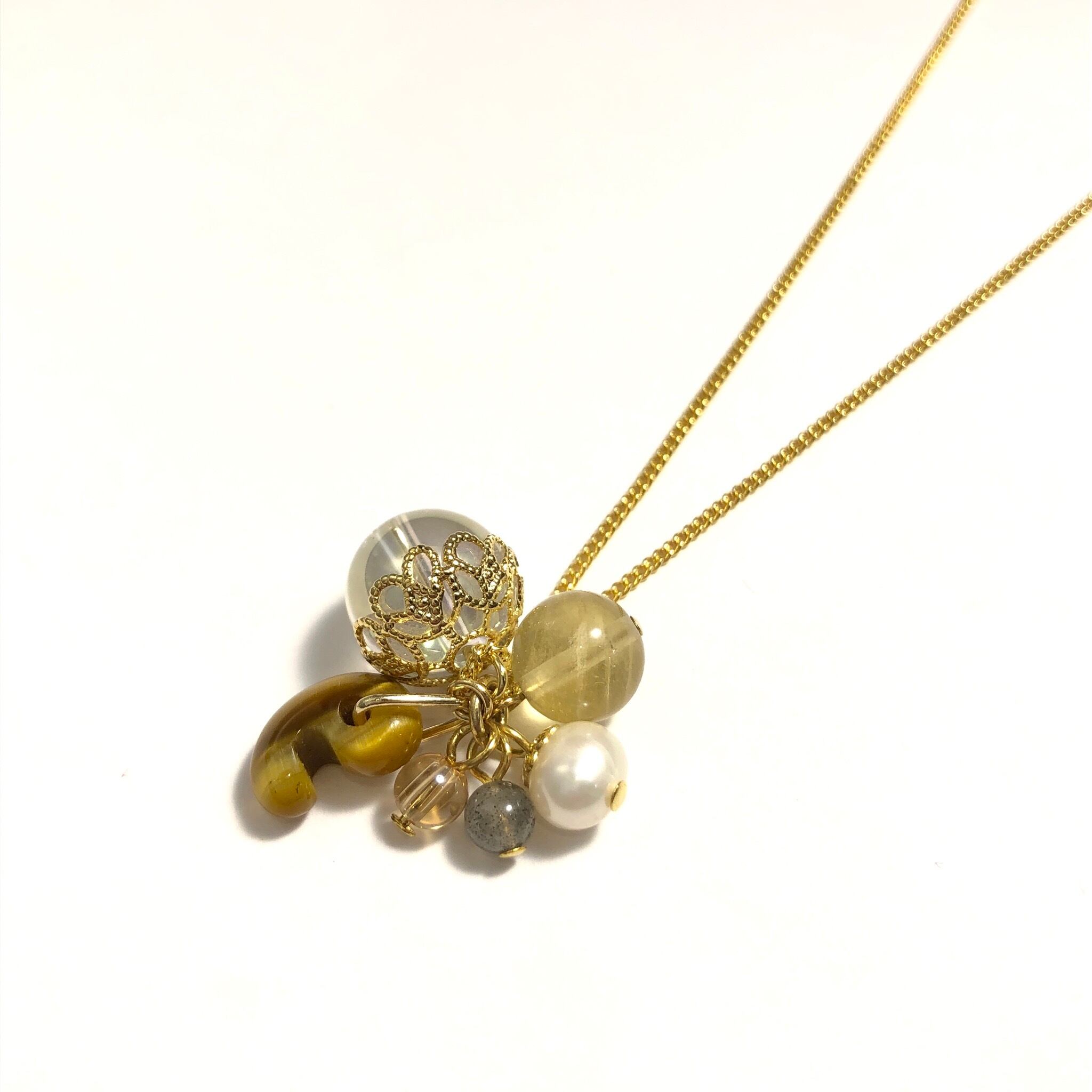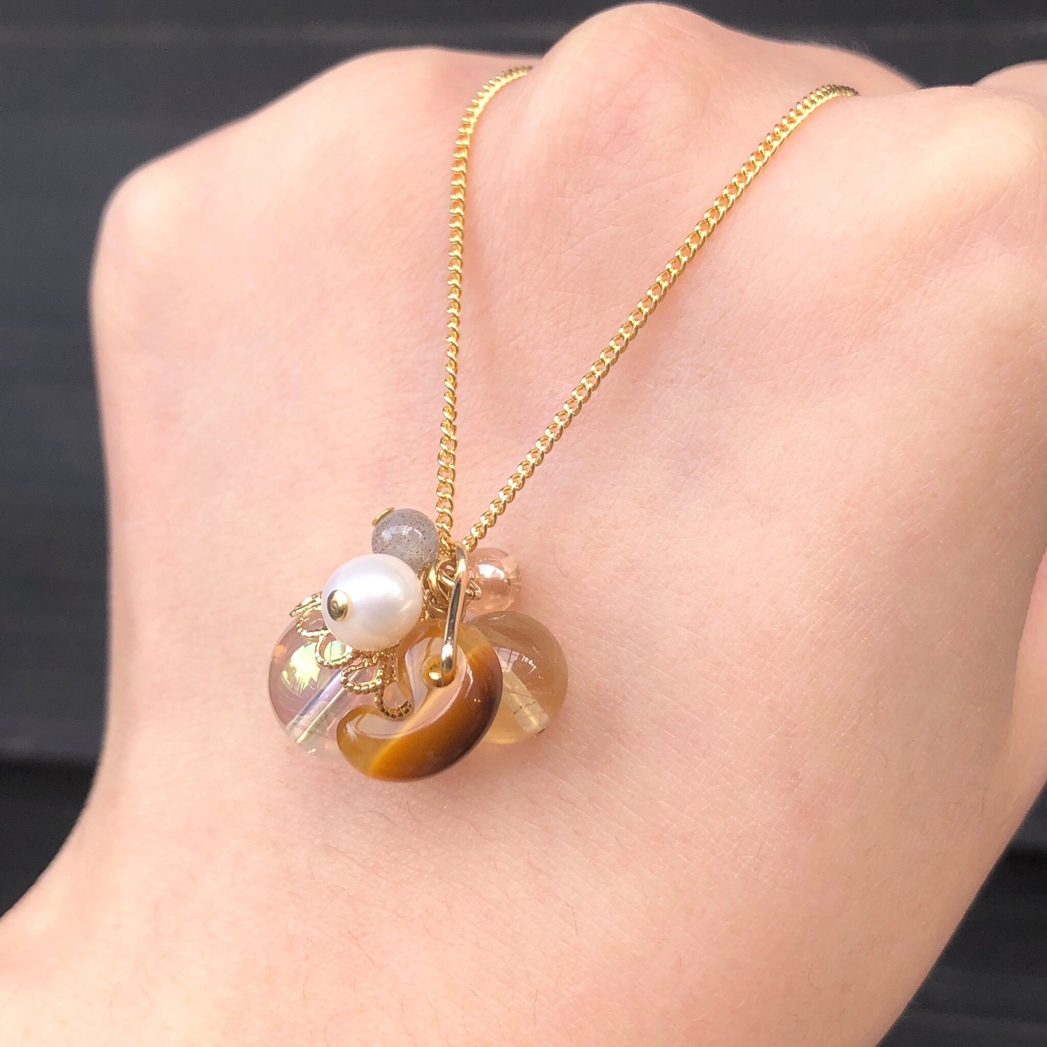 タイガーアイ(勾玉)、淡水パール、イエローフローライト、ゴールデンオーラ、ホワイトオーロラクォーツ、ラブラドライト