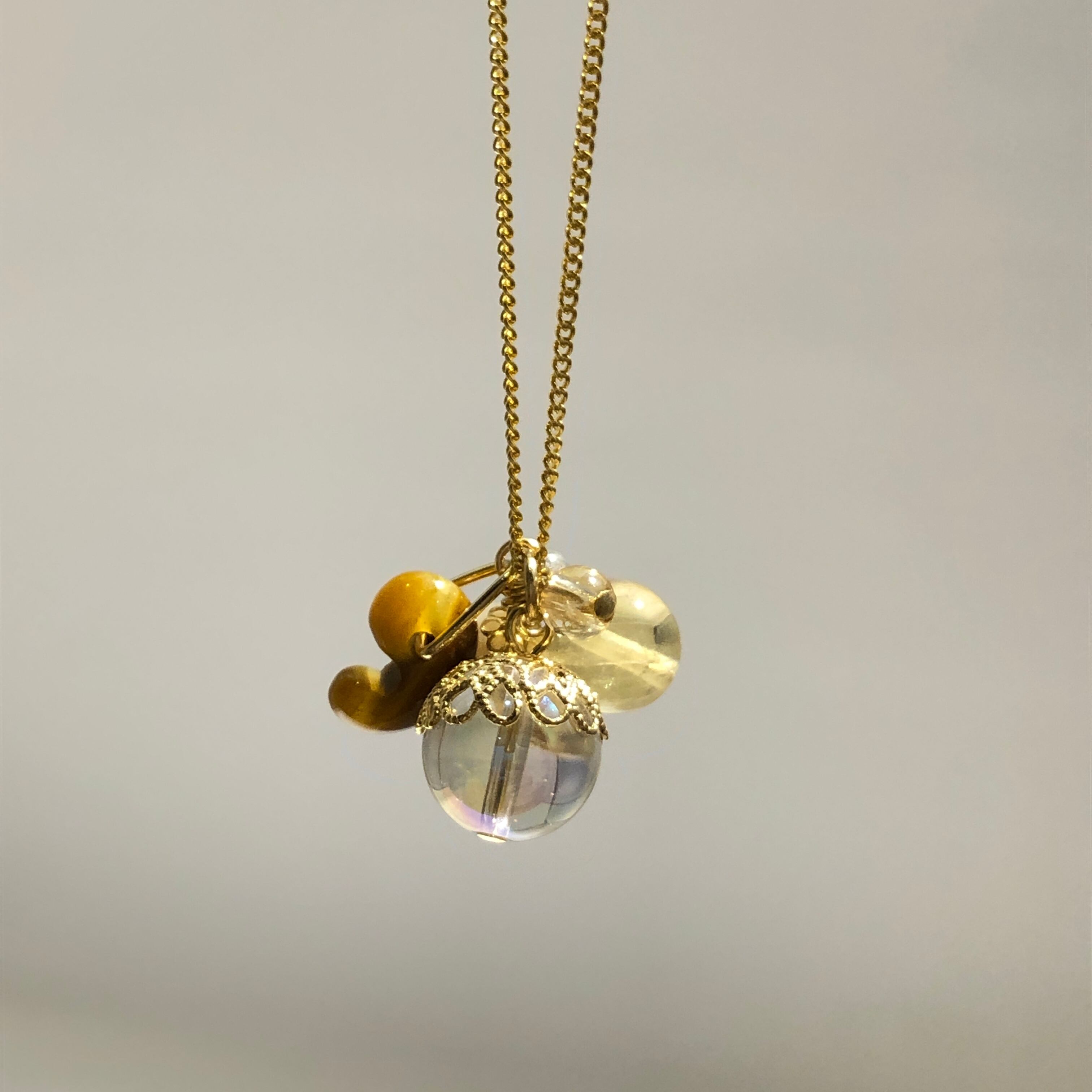 こちらは金運や仕事運を高めるといわれるタイガーアイの勾玉をはじめ、キラキラした天然石たちを組み合わせています。