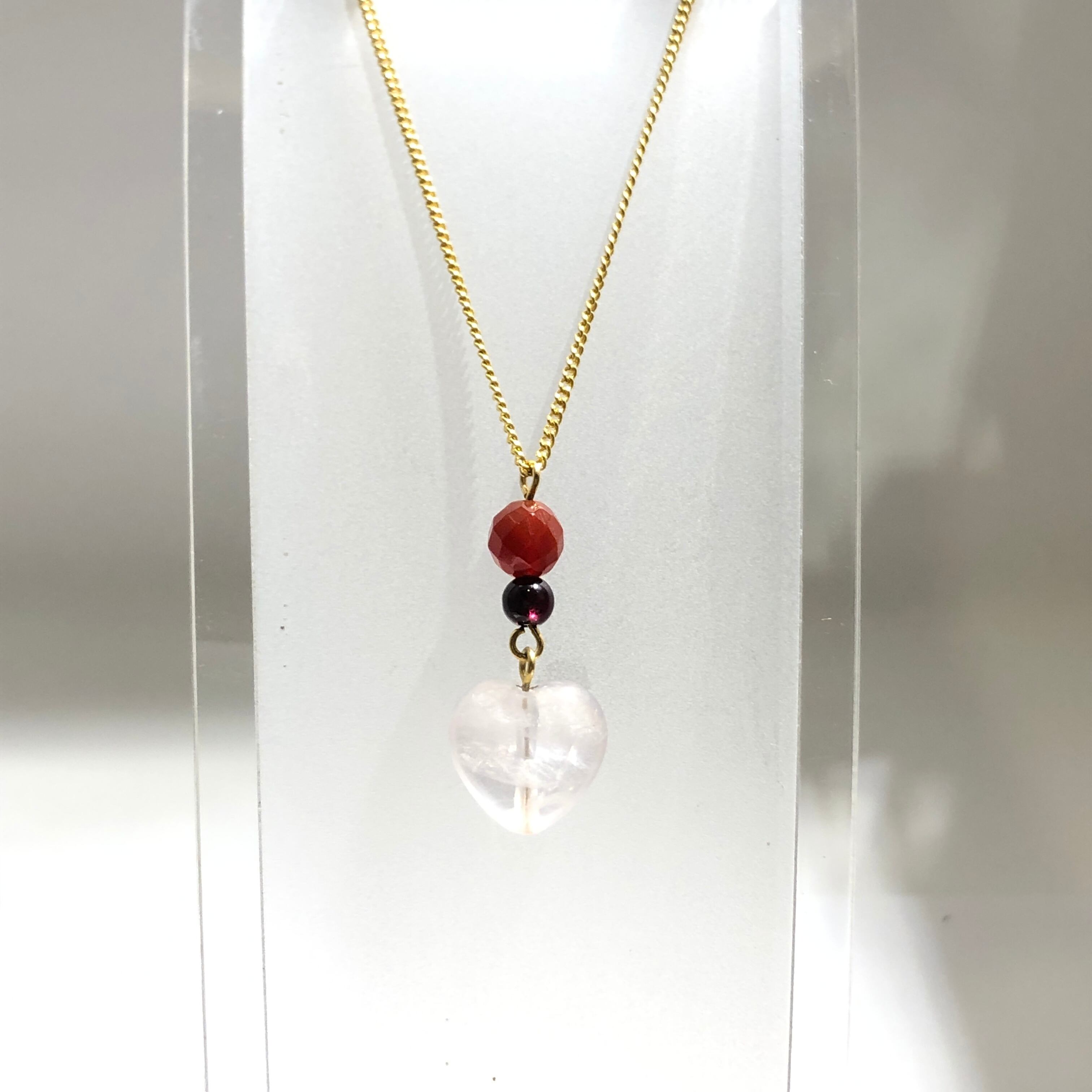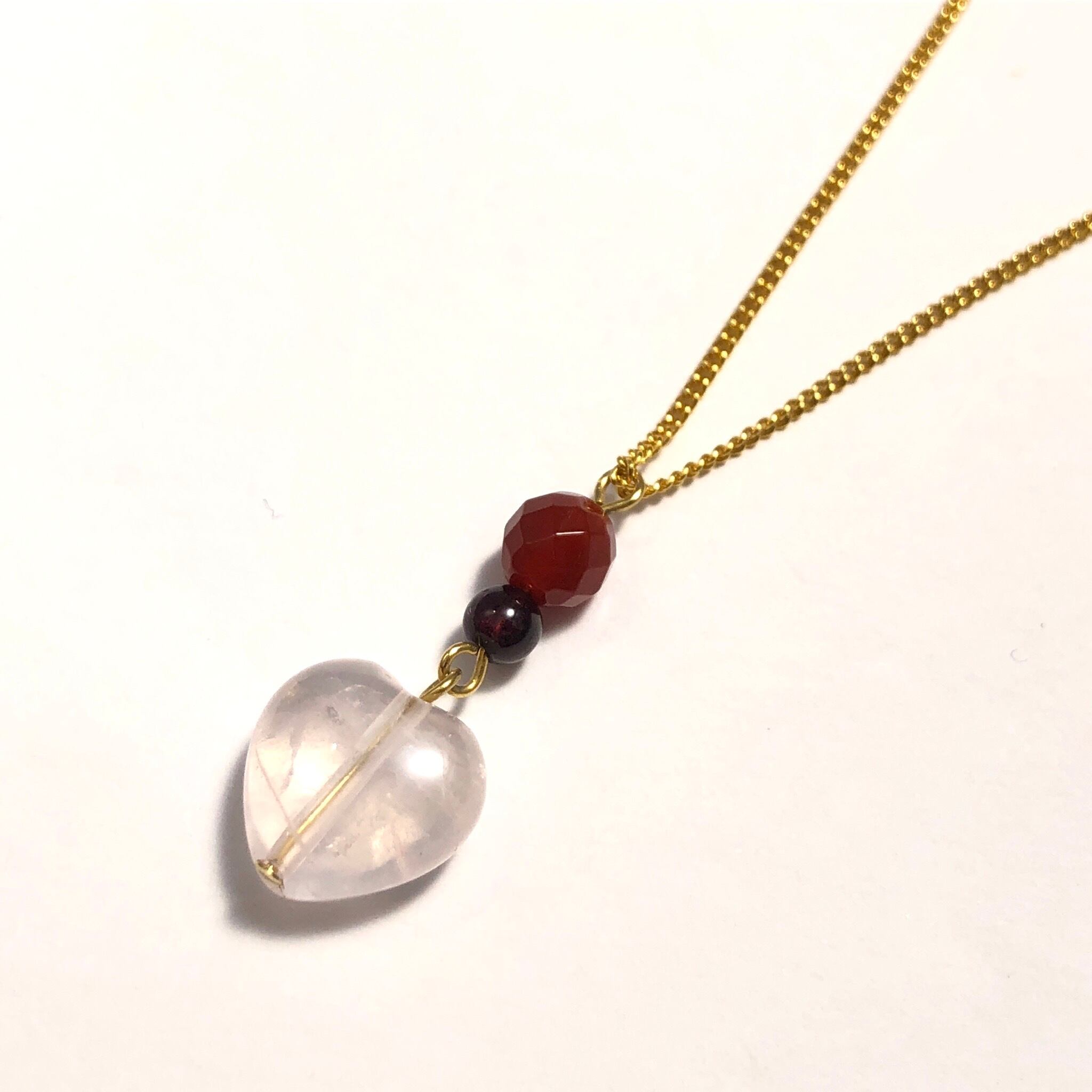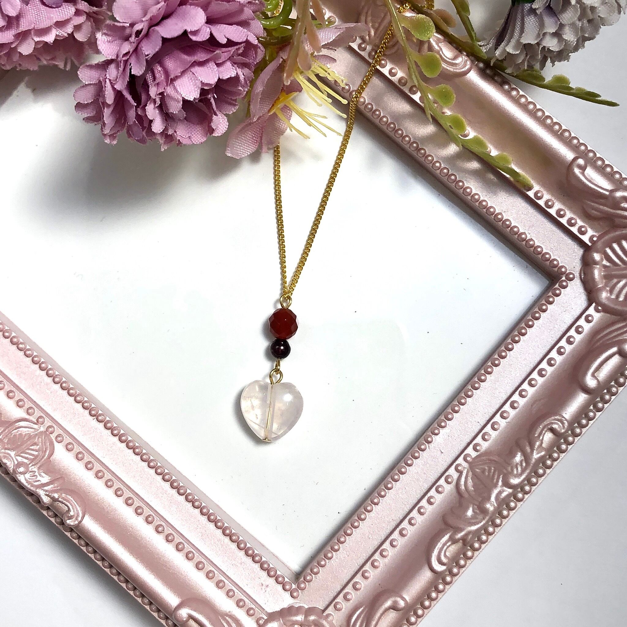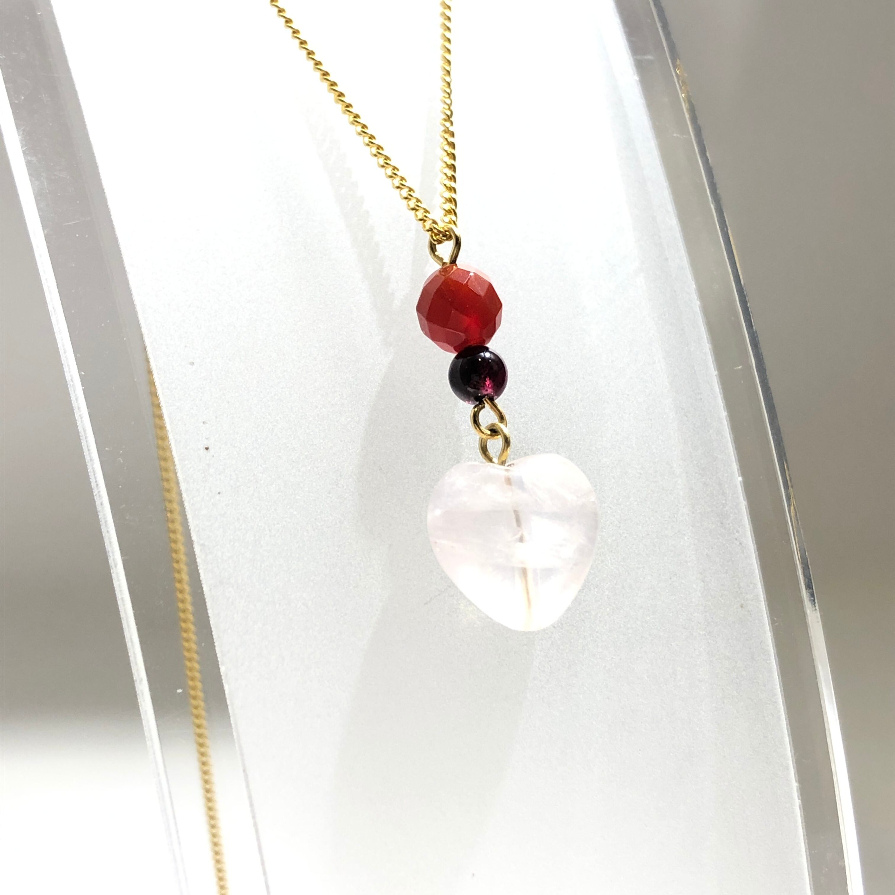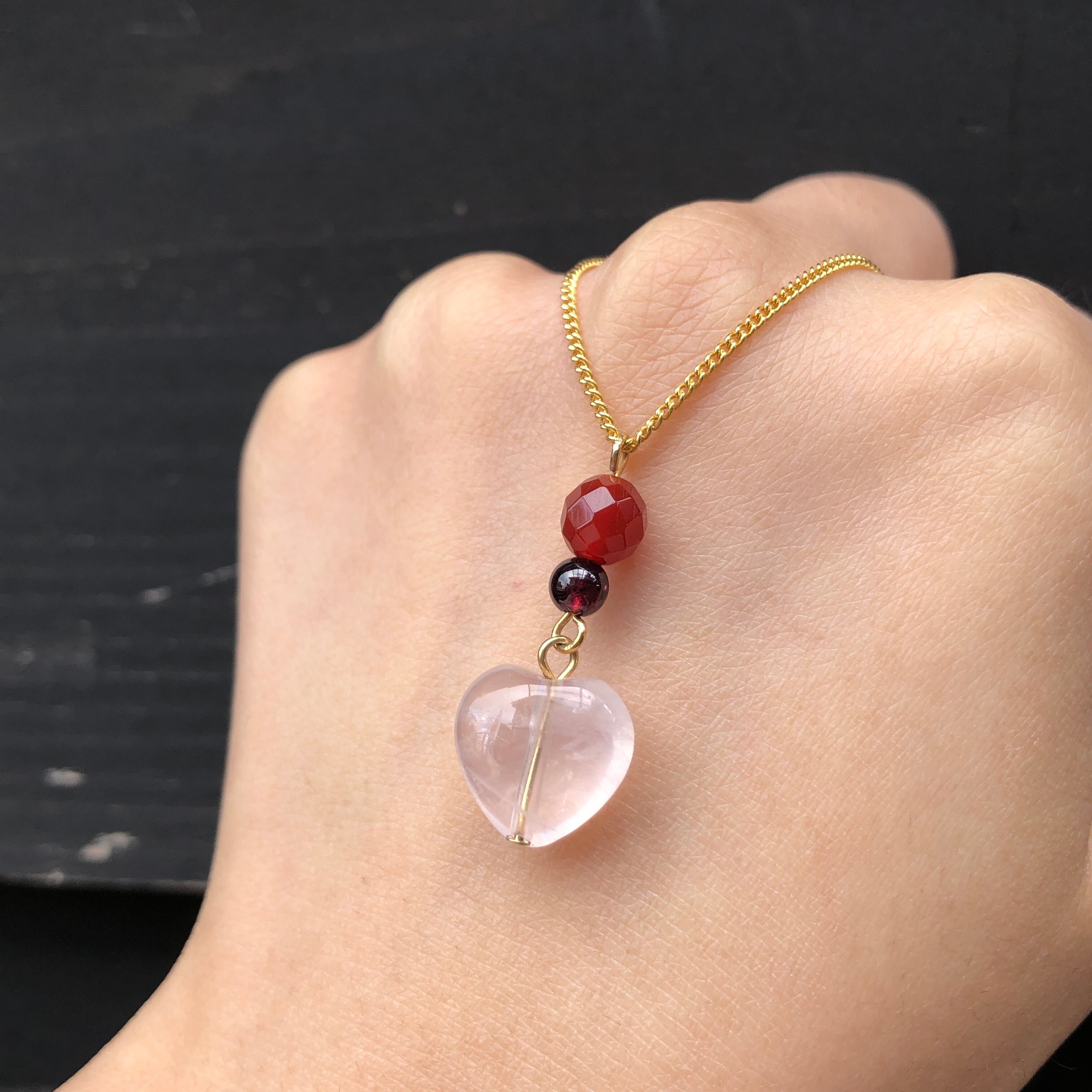 こちらはそんなローズクォーツのハートと、子宝安産の意味合いがある赤めのう、ガーネットを組み合わせたシンプルで使いやすいネックレスとなっております!