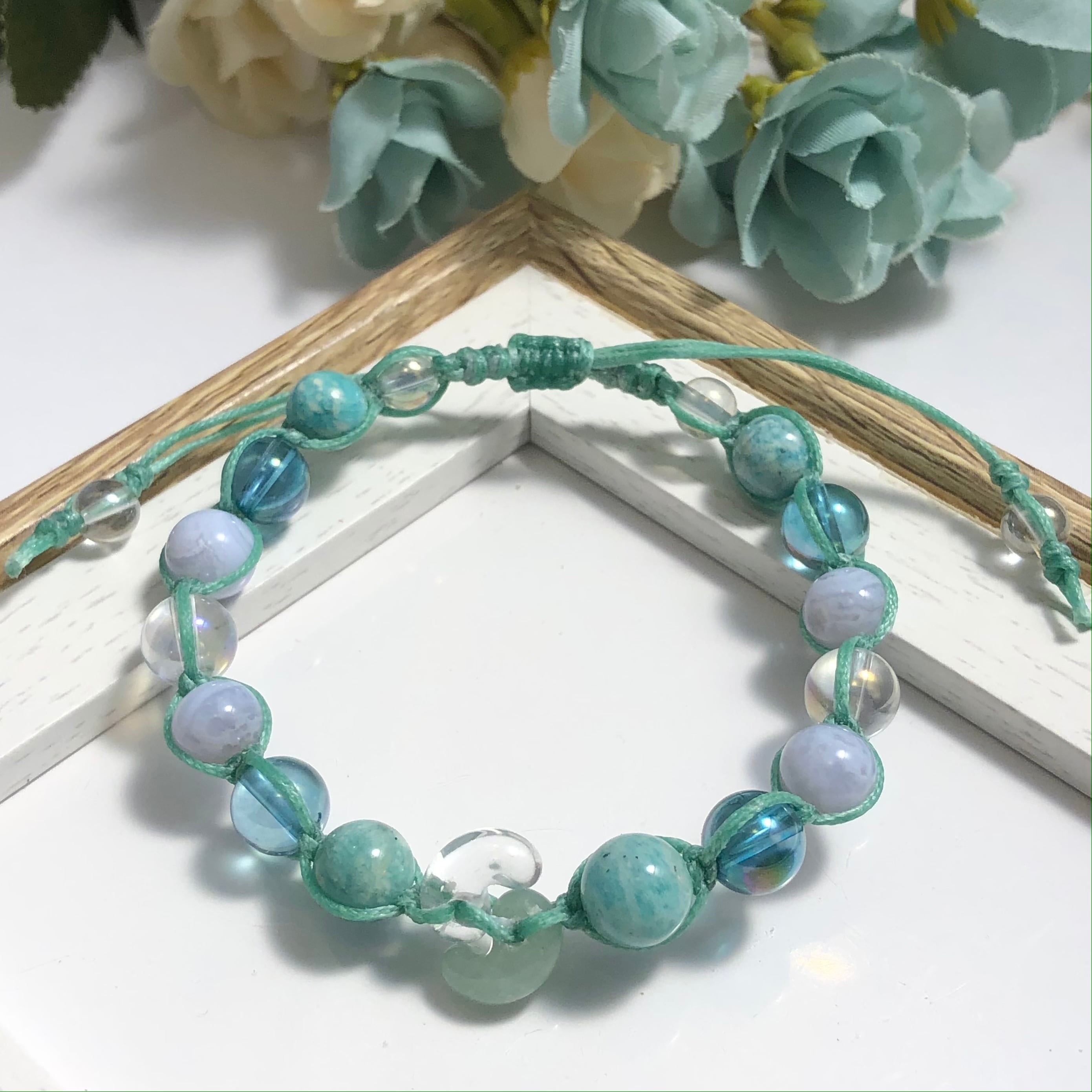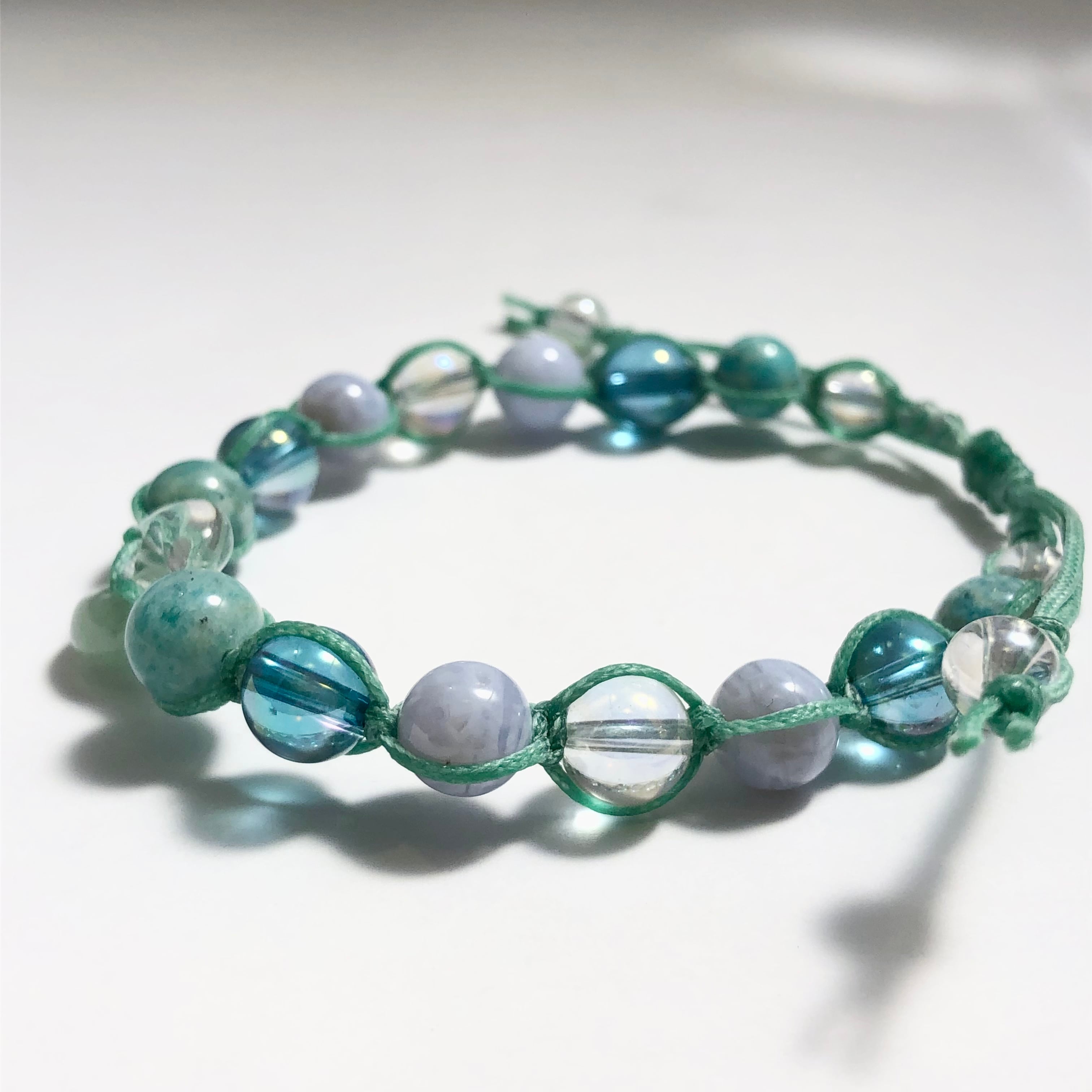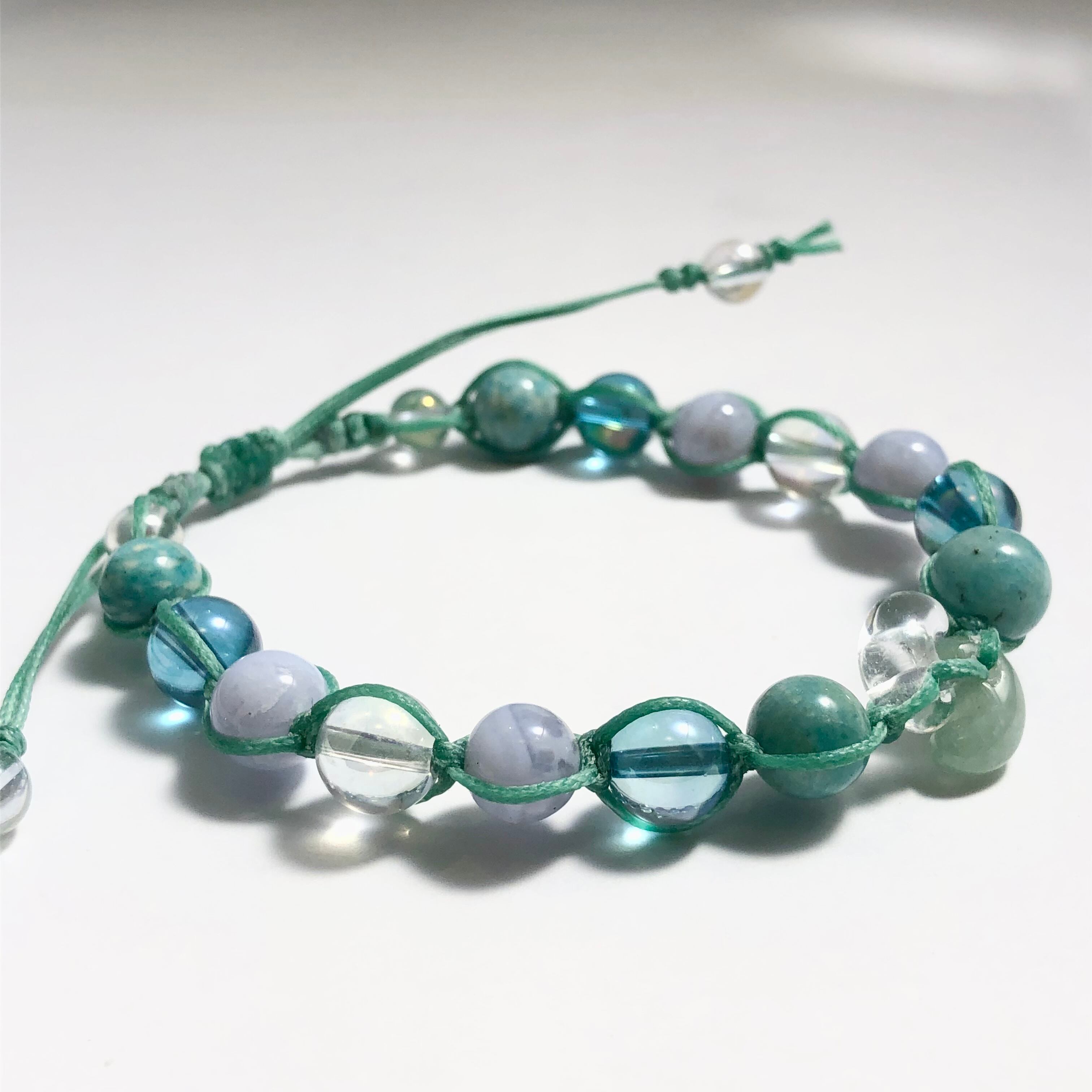 ■使用している石:水晶、アベンチュリン(勾玉)ブルーレースアゲート、アマゾナイト、アクアオーラ、ホワイトオーロラクォーツ
