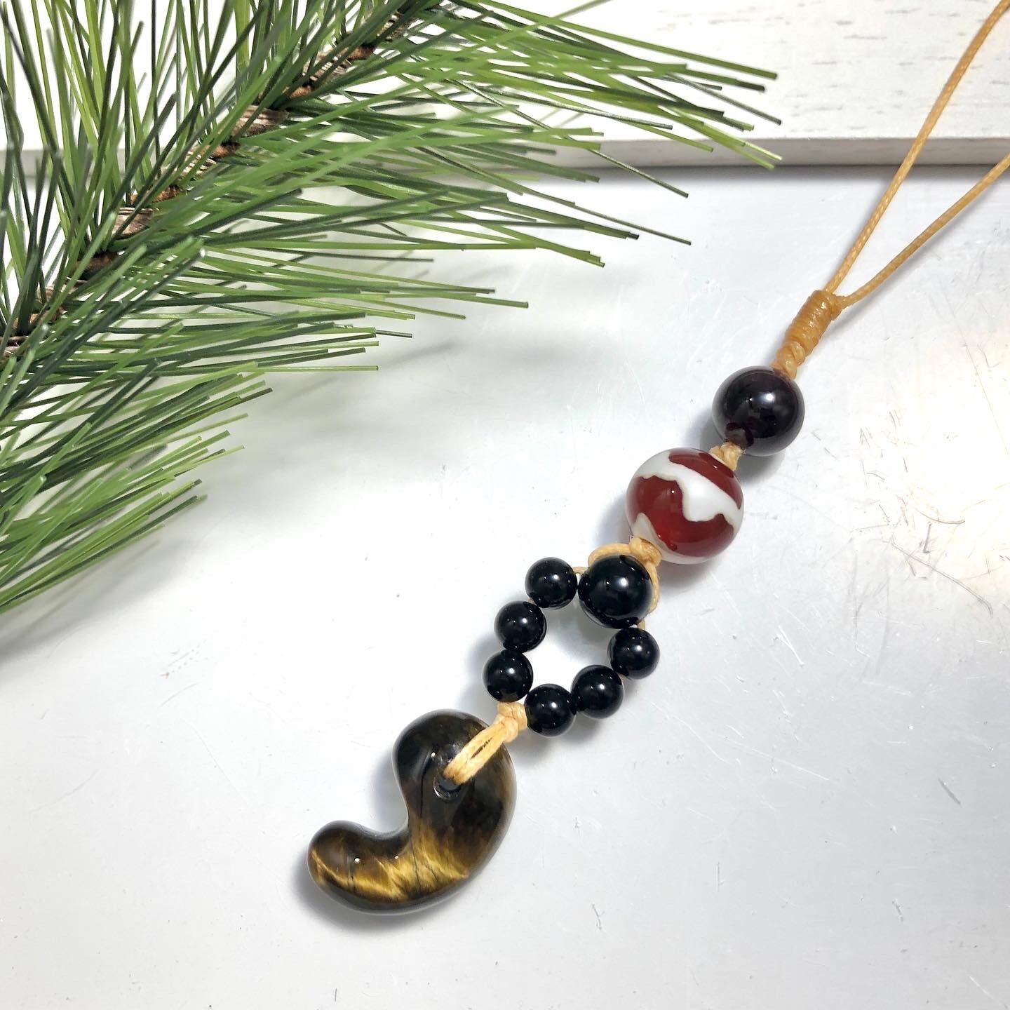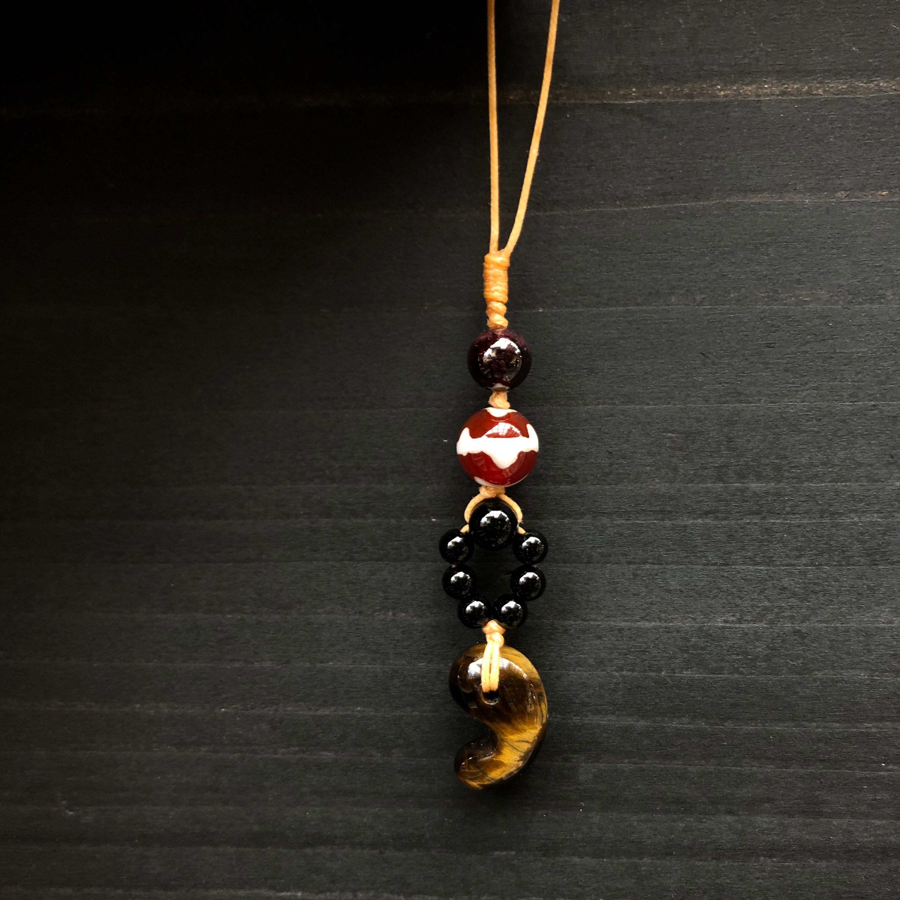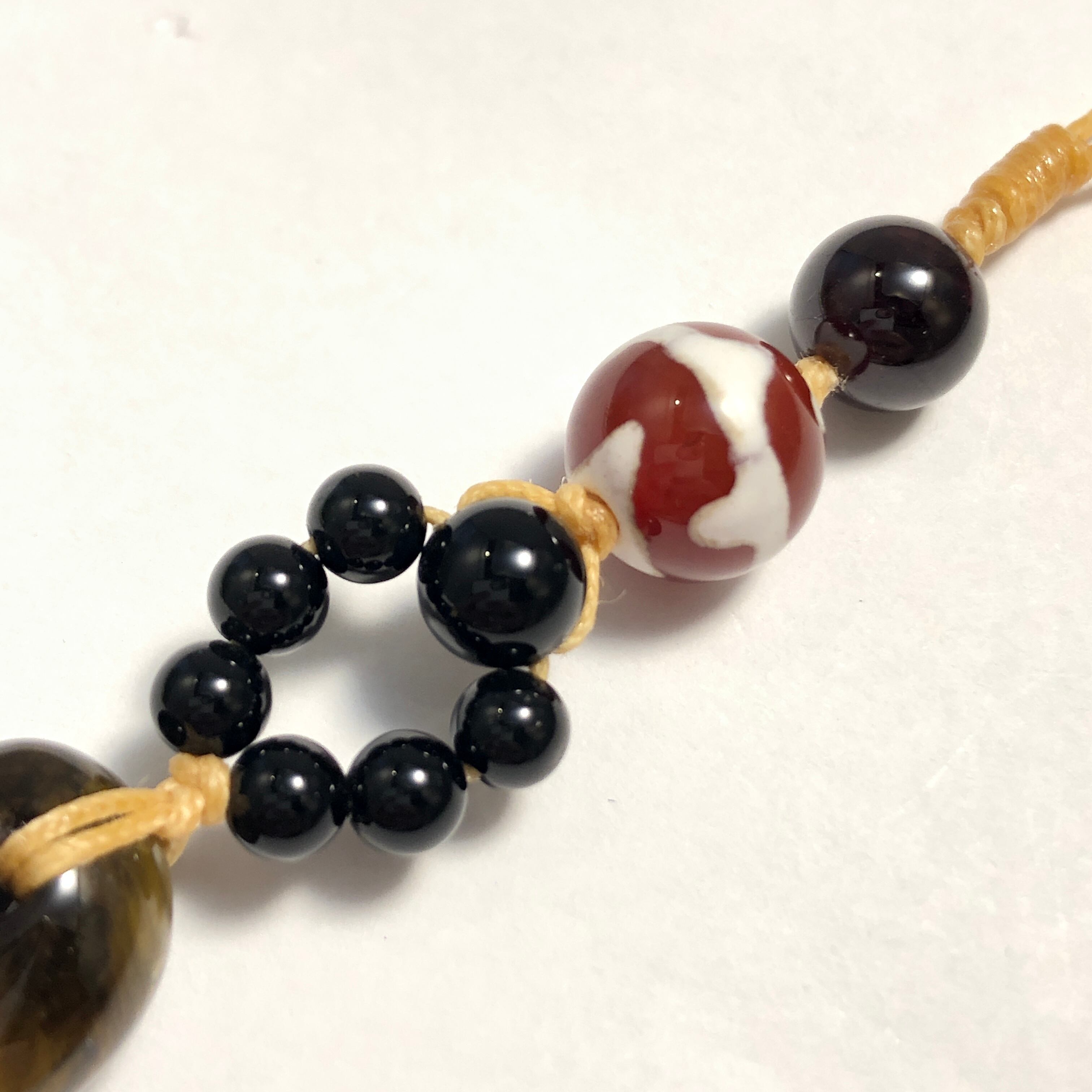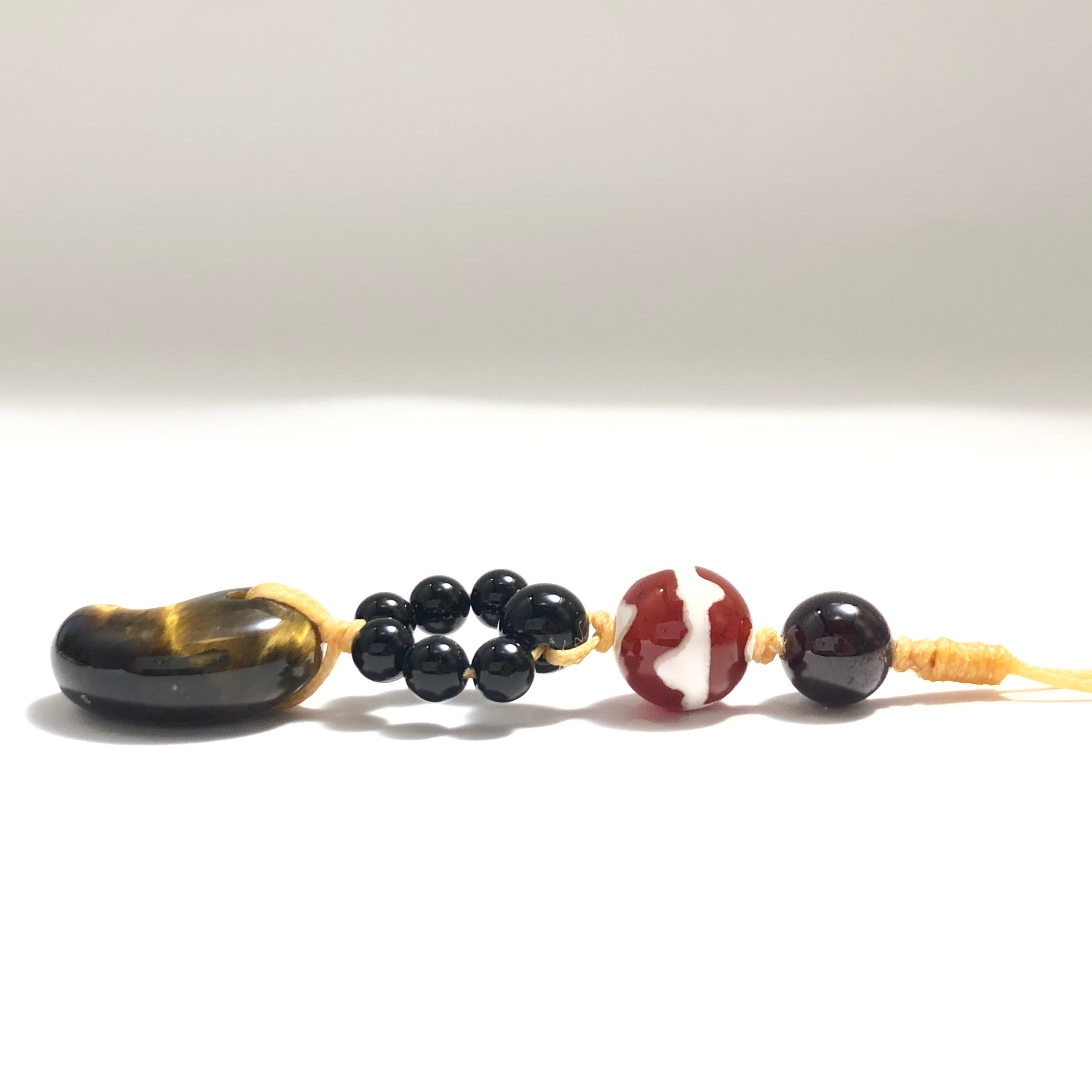 虎牙天珠(赤めのう)、タイガーアイ(勾玉)、ガーネット、オニキス