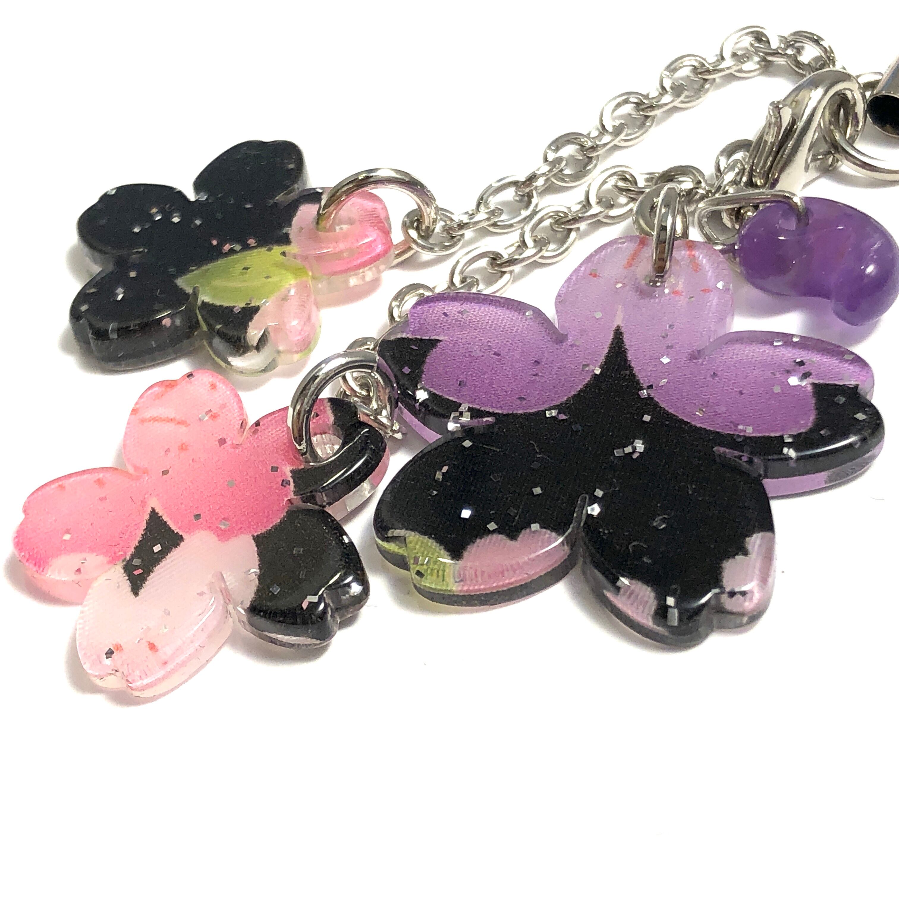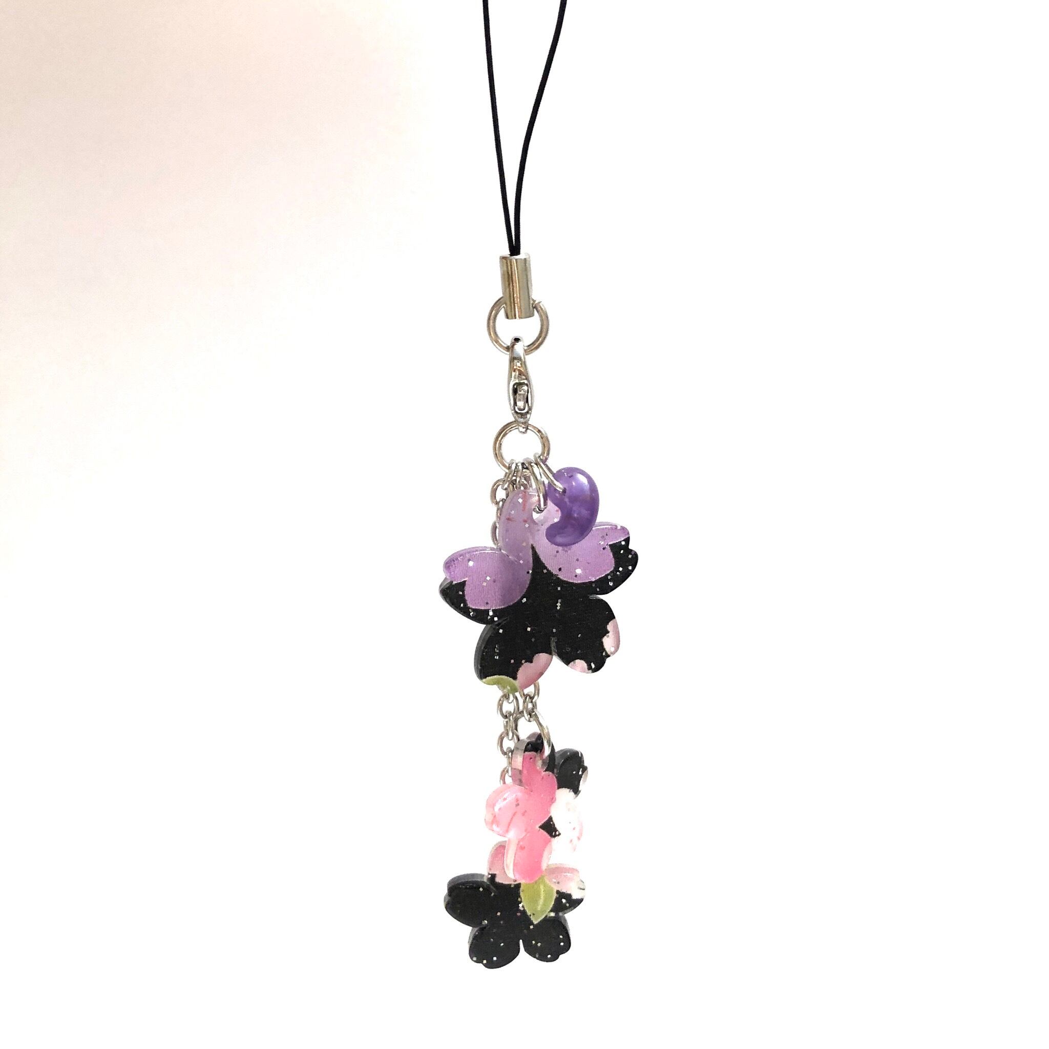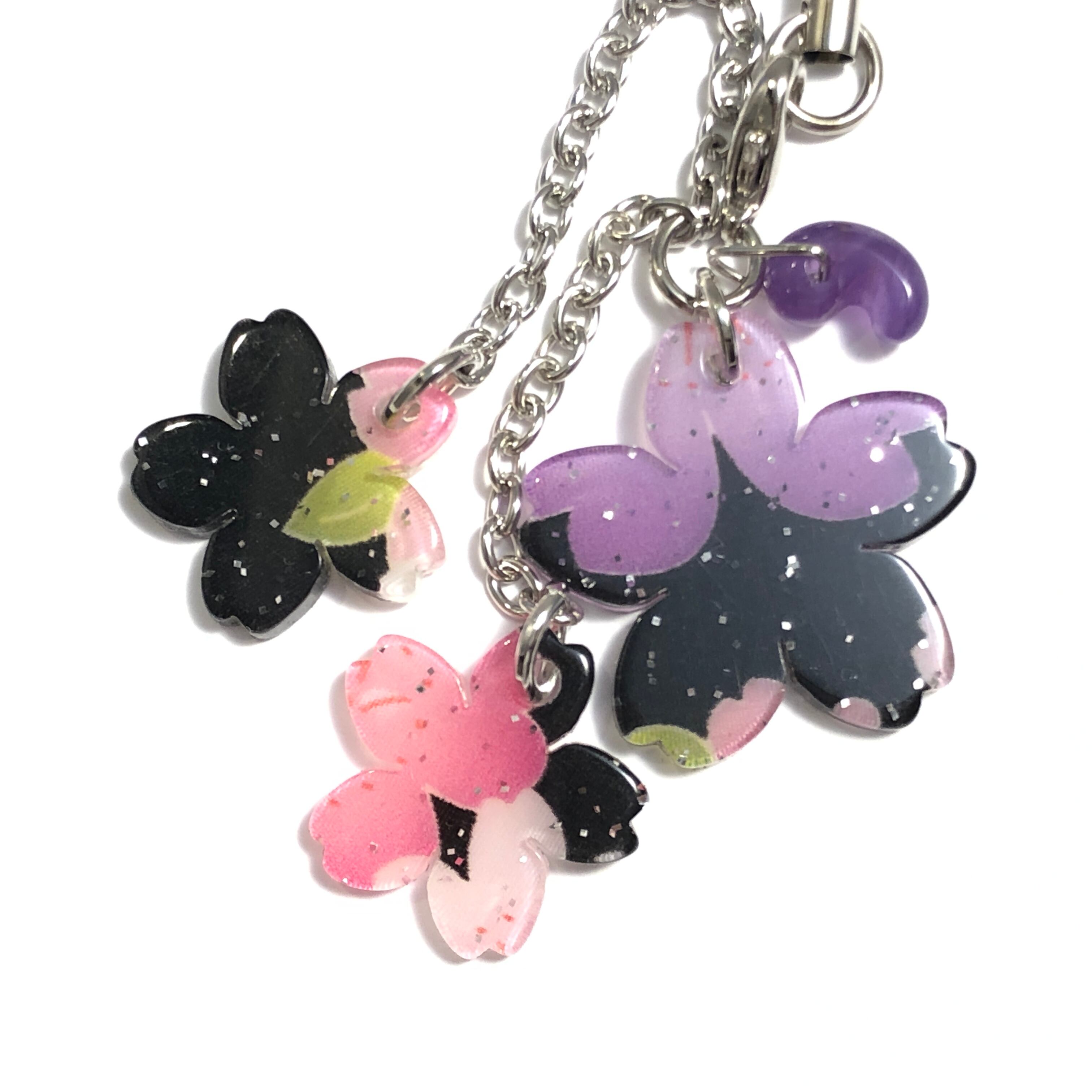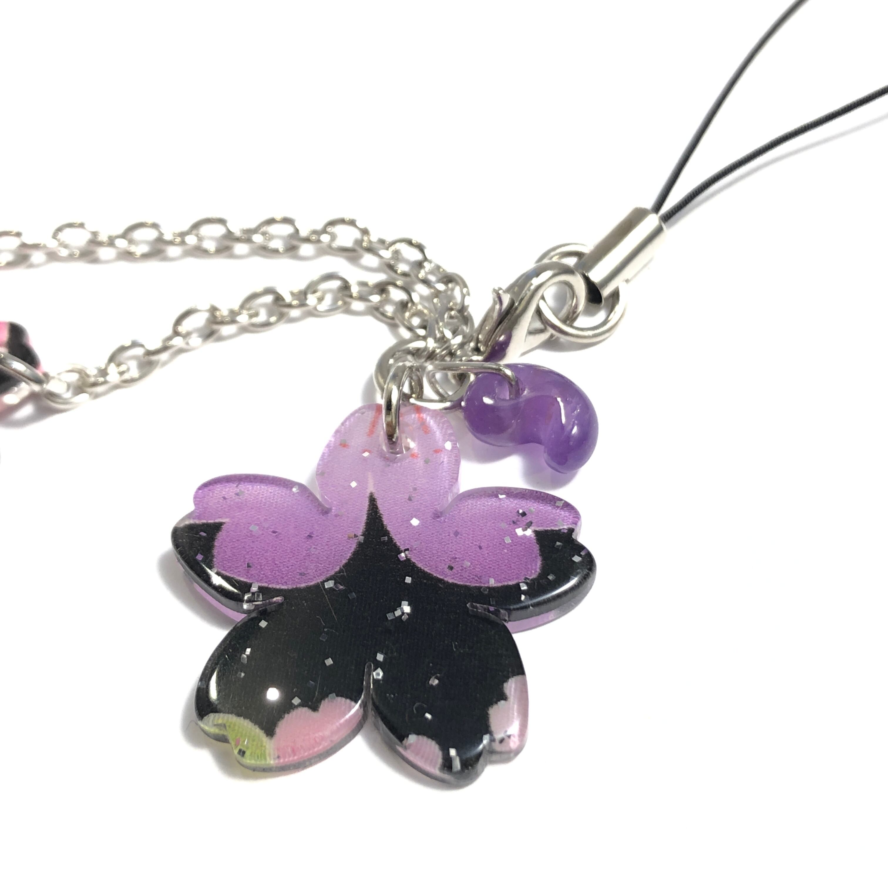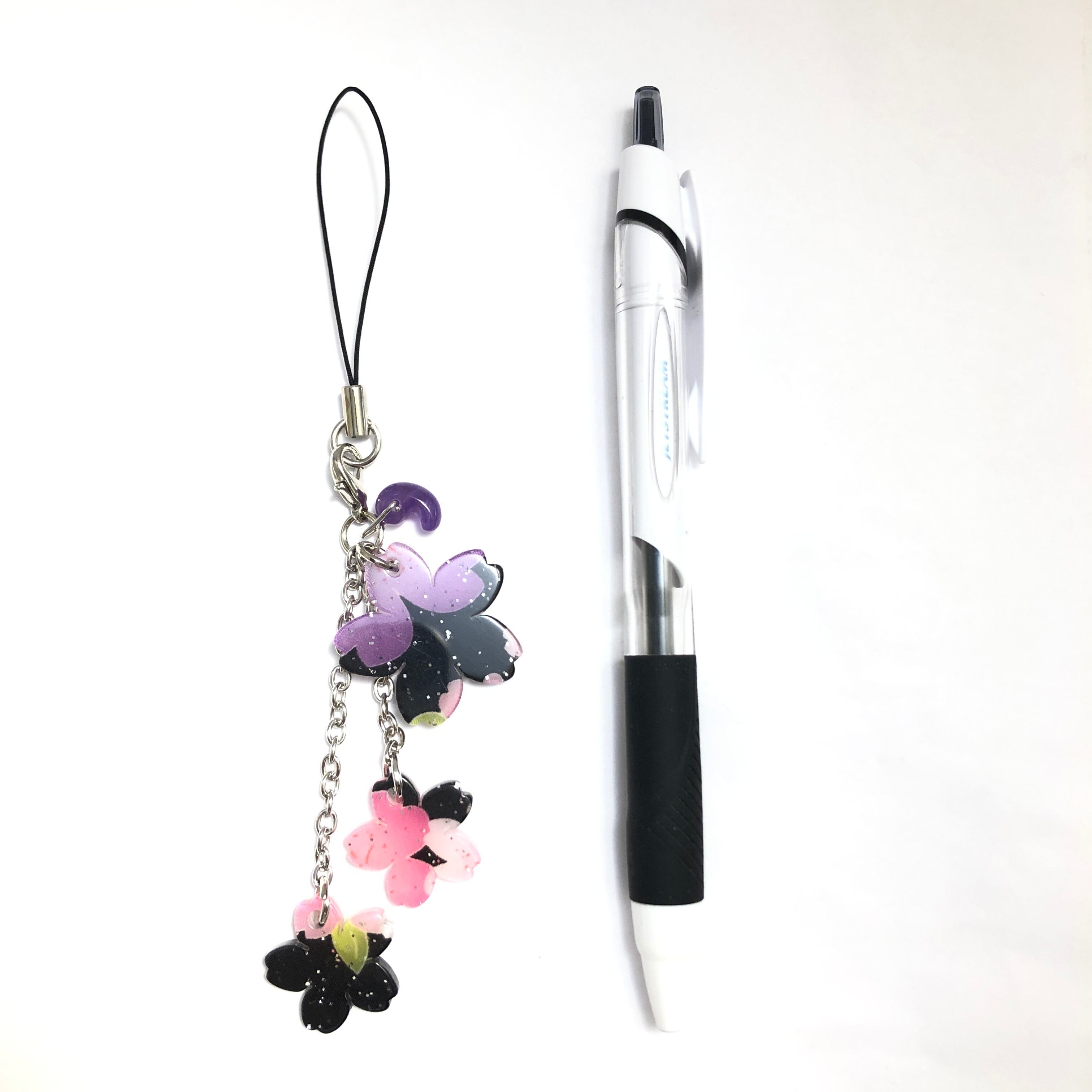 桜の花とキラキラしたラメが夜桜を思わせる、桜のストラップです。
