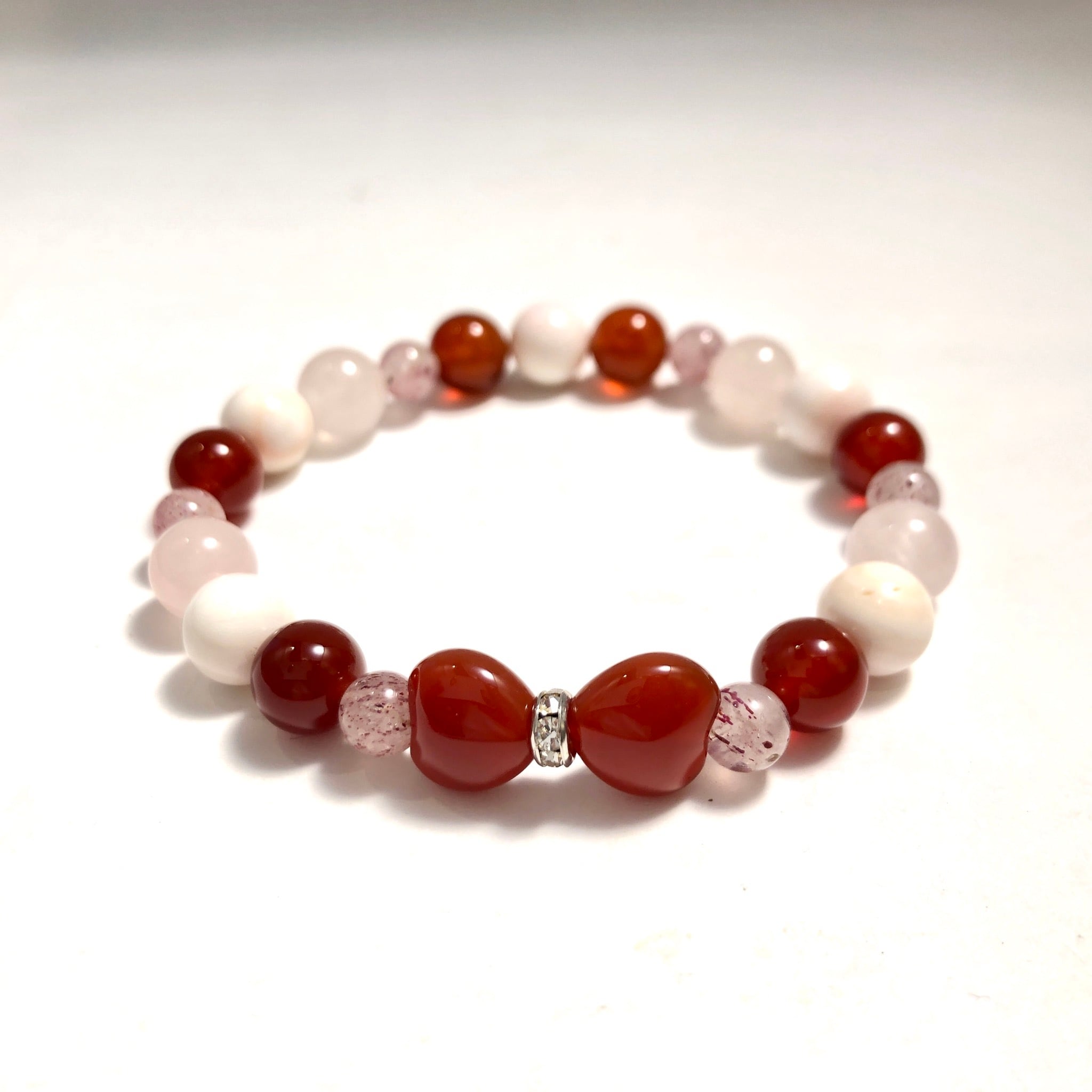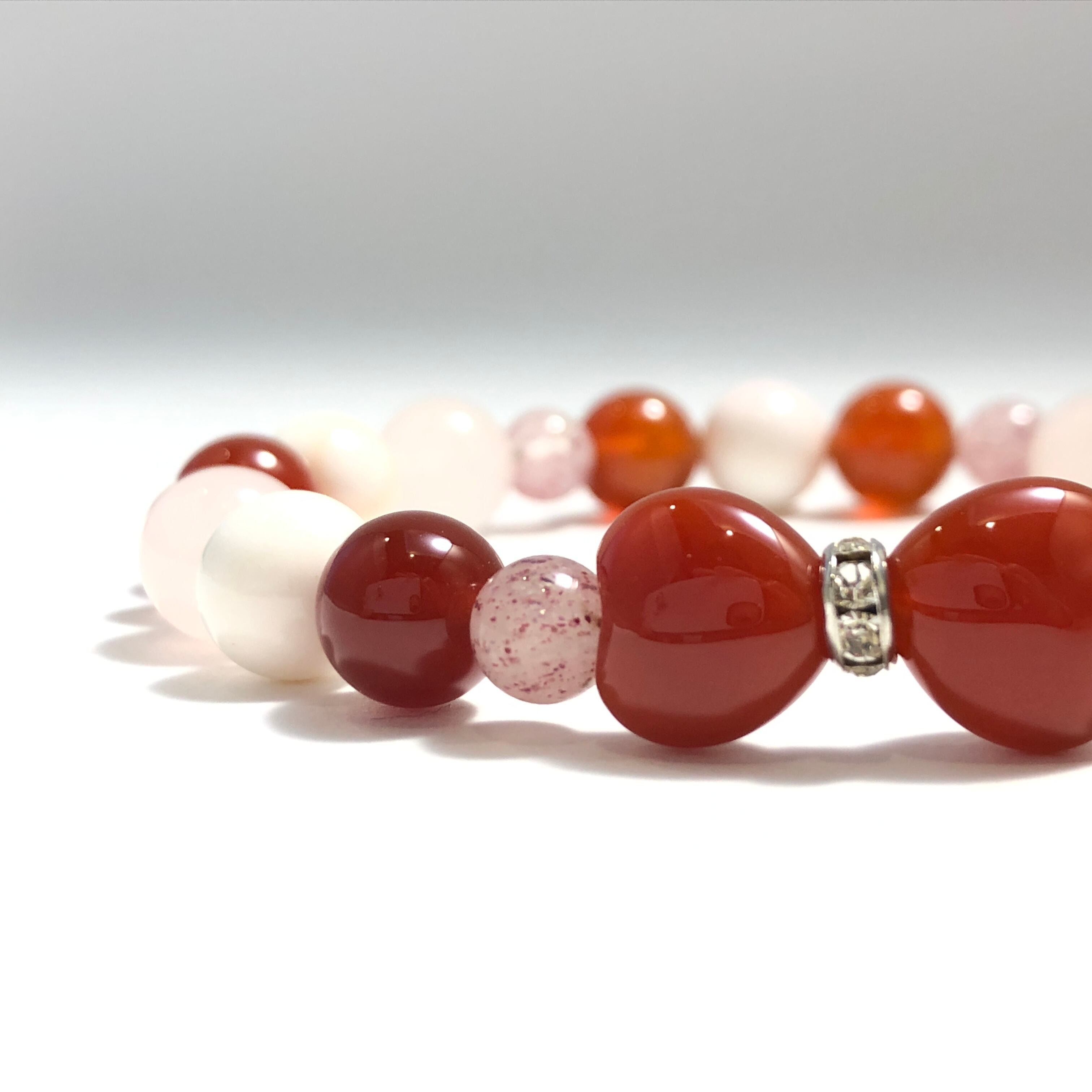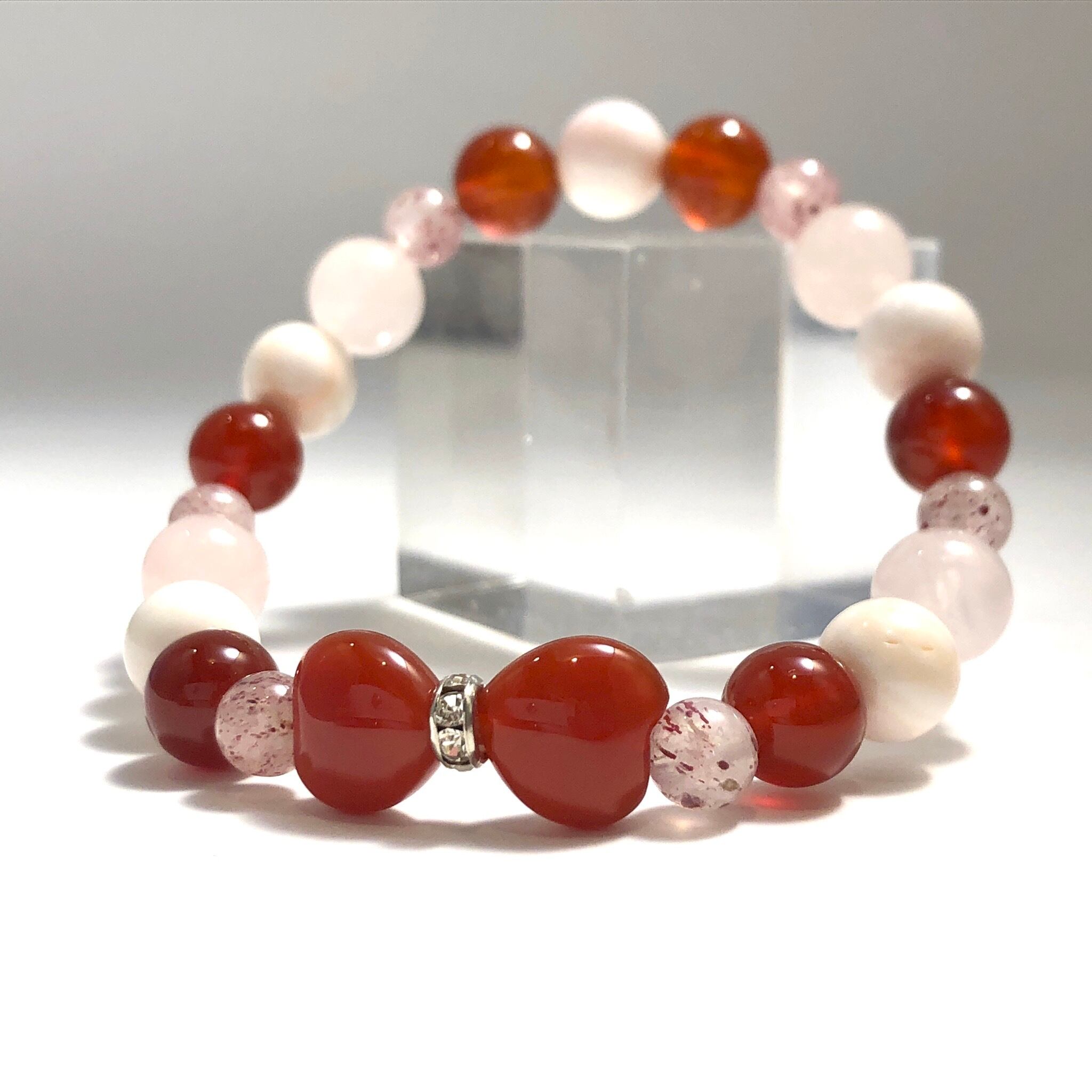 こちらのブレスレットは家族円満や対人運アップの意味がある赤めのうをはじめ、縁結びや魅力アップの石を組み合わせてお作りしました!