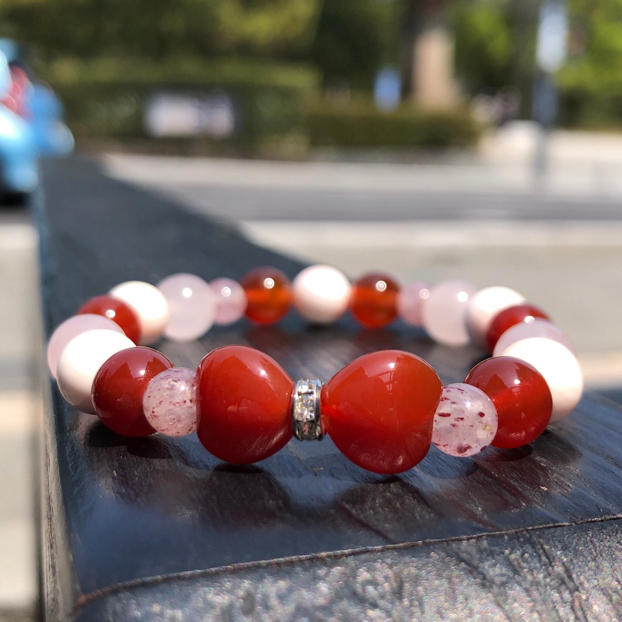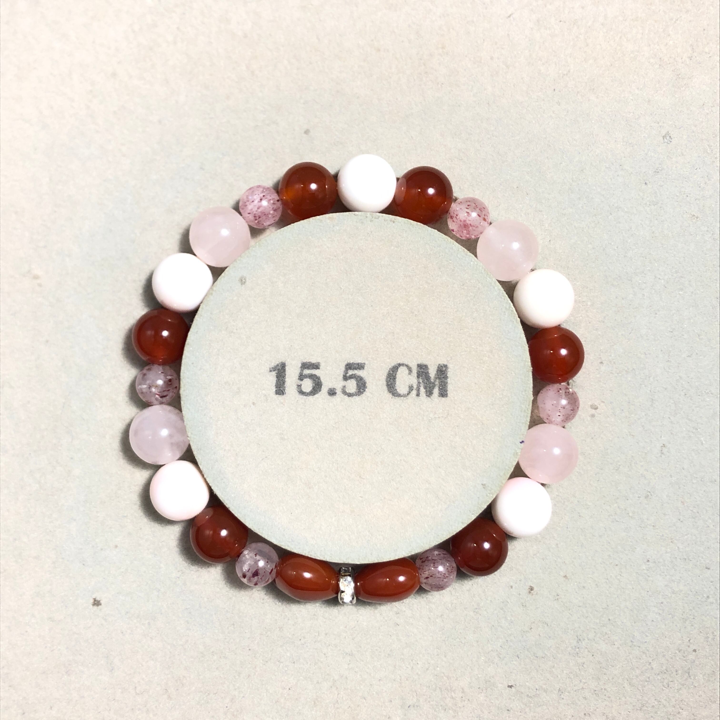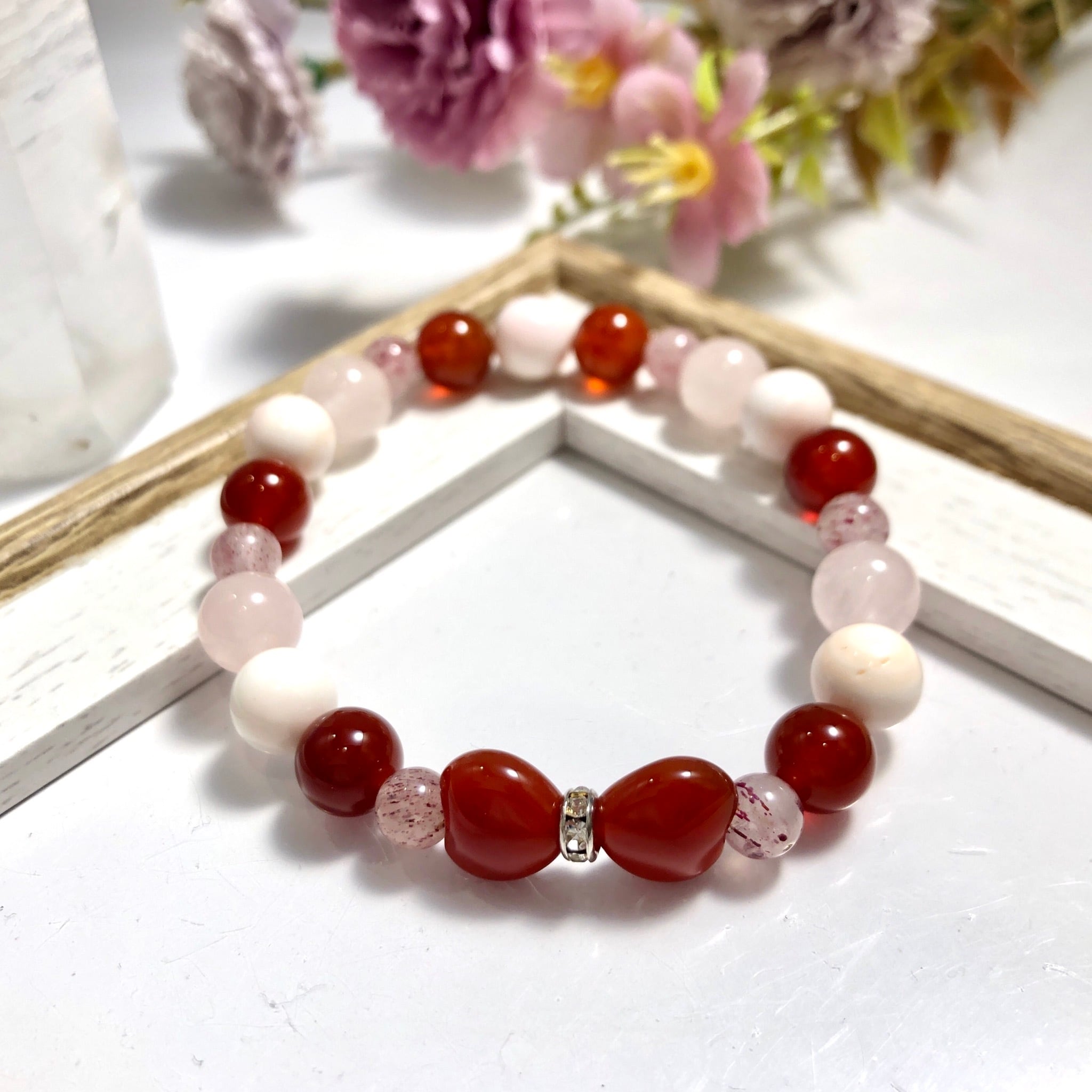 こちらのブレスレットは家族円満や対人運アップの意味がある赤めのうをはじめ、縁結びや魅力アップの石を組み合わせてお作りしました!