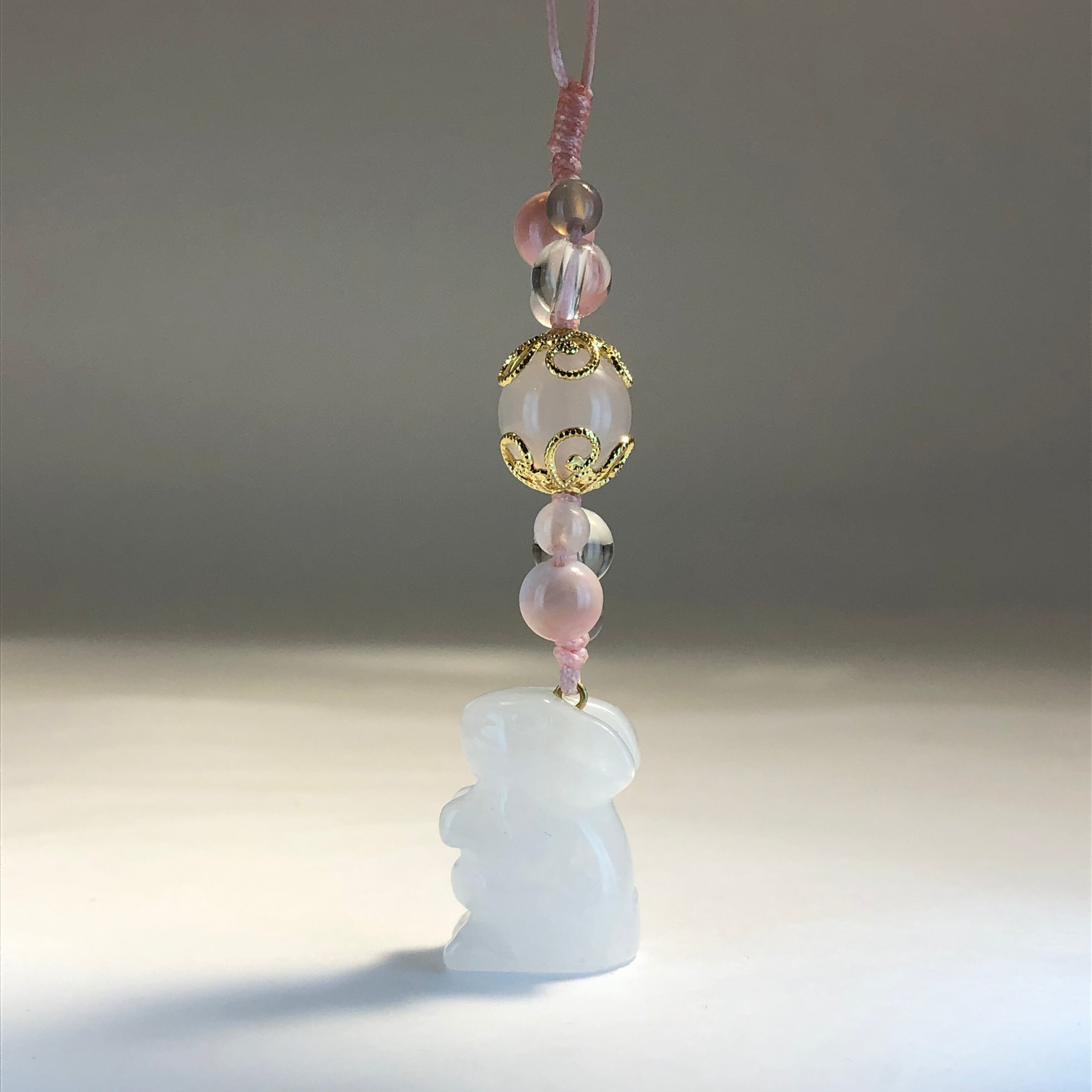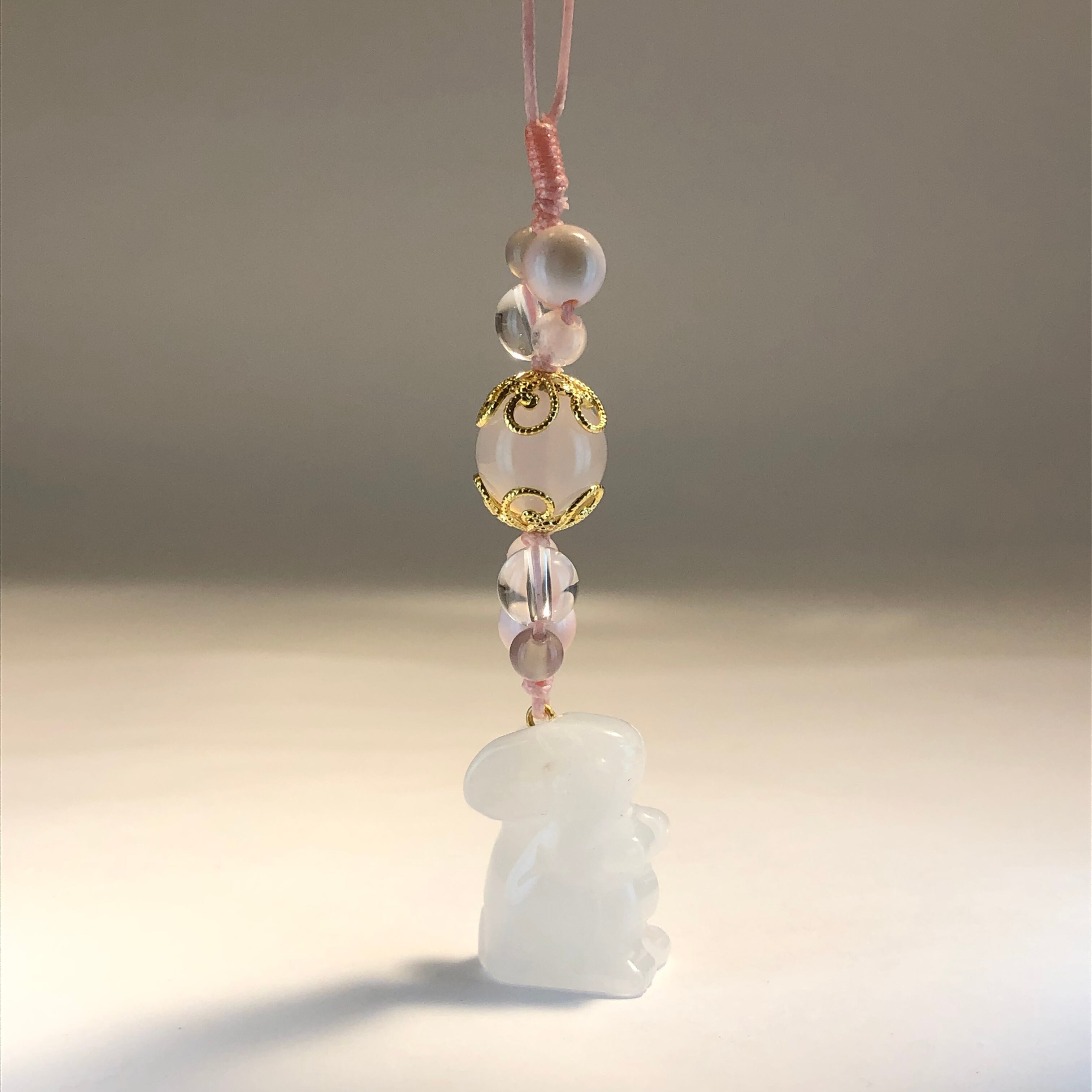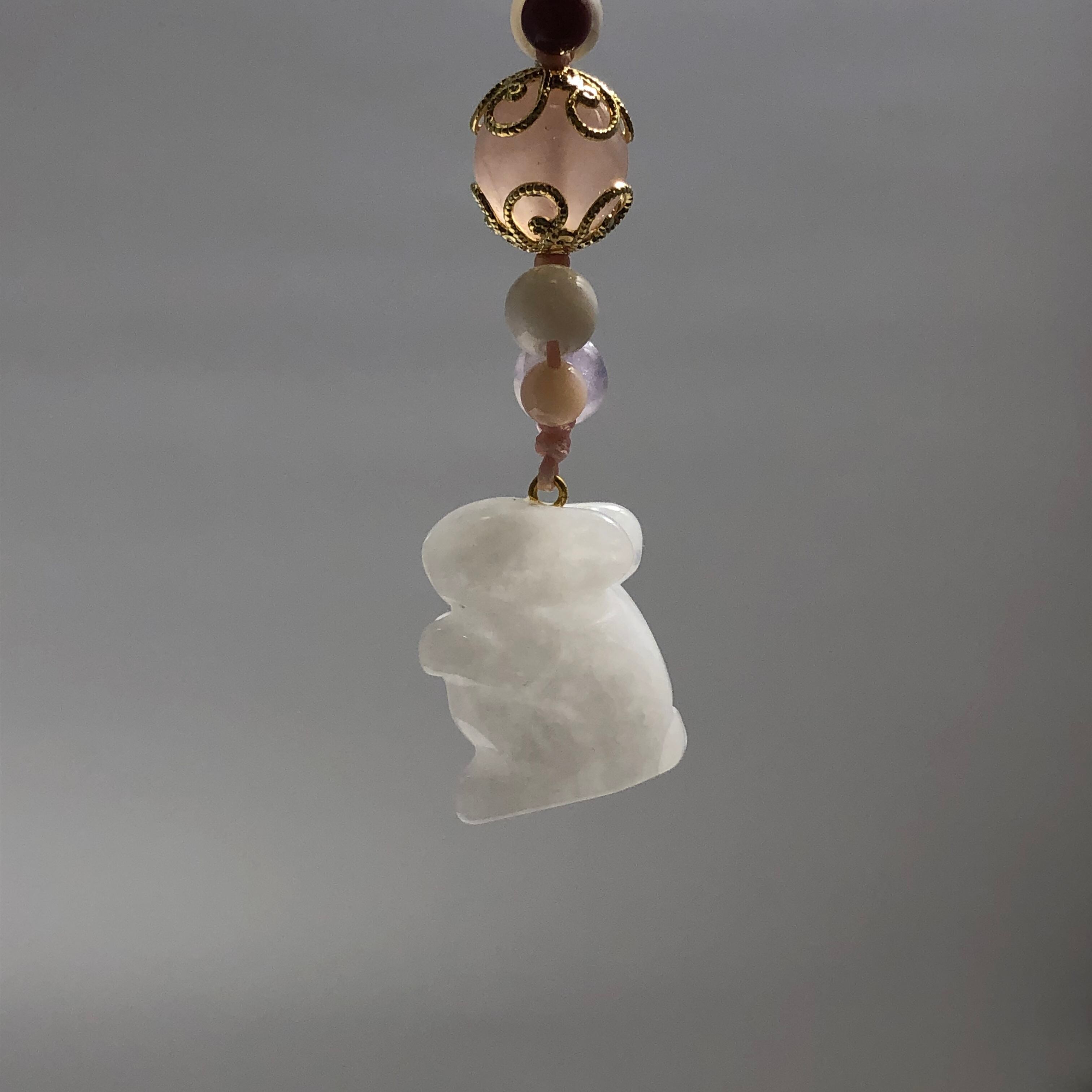 ホワイトジェード(うさぎ)ローズクォーツ、クィーンコンクシェル、白めのう、水晶、めのう
