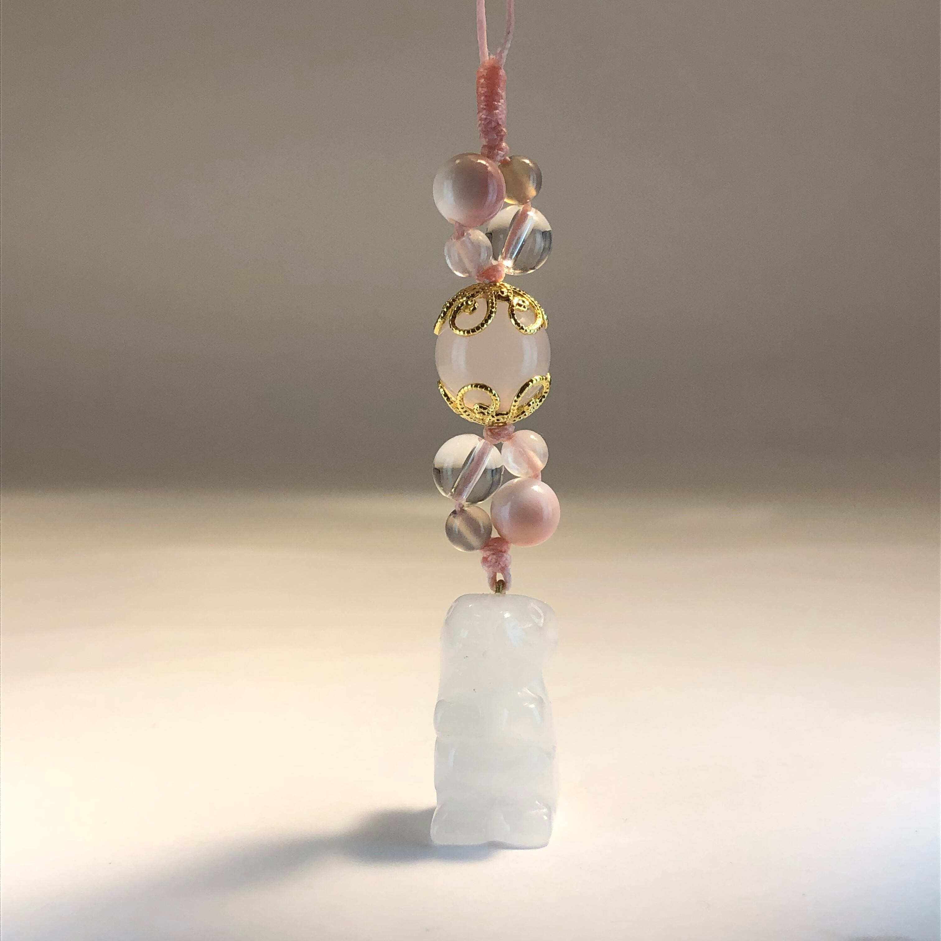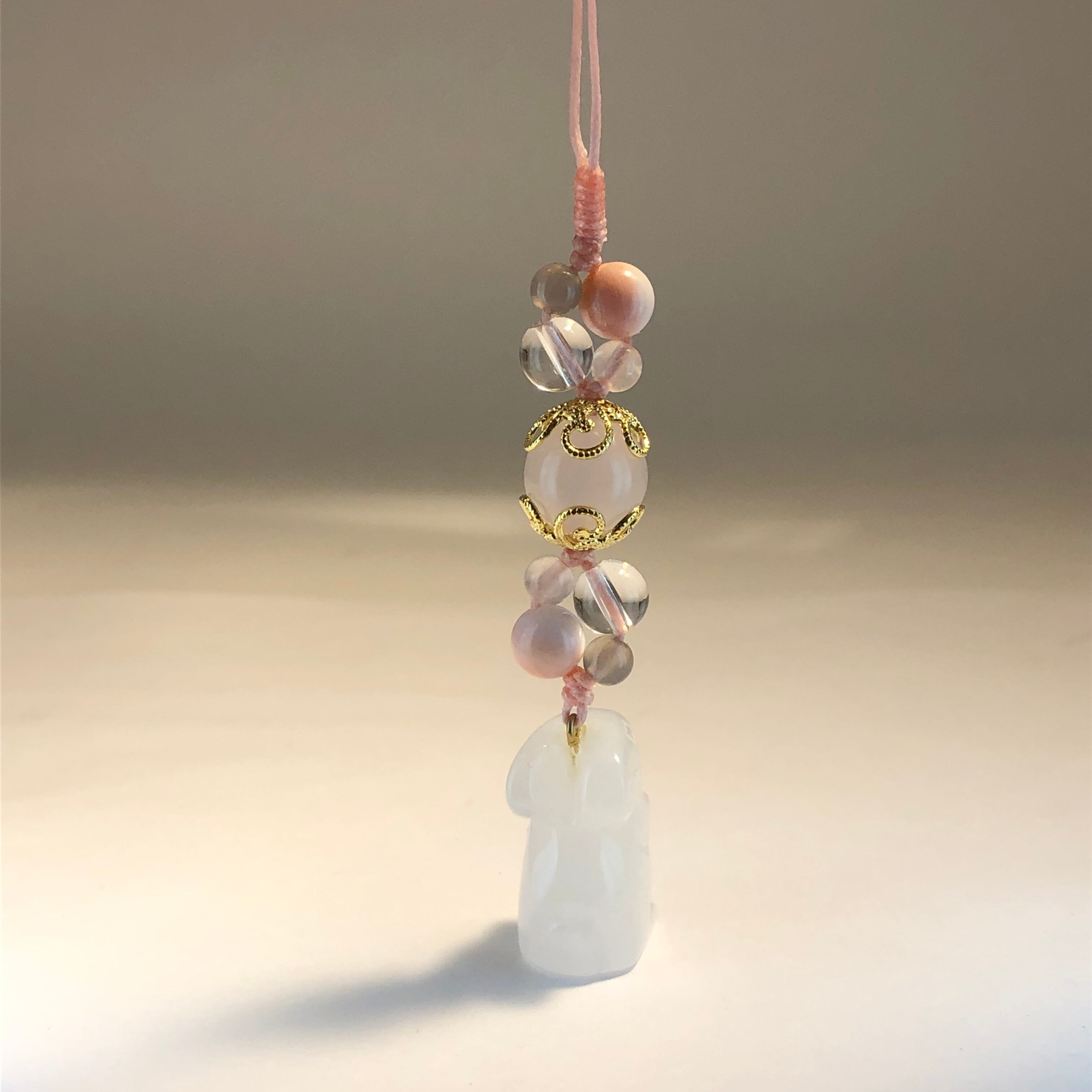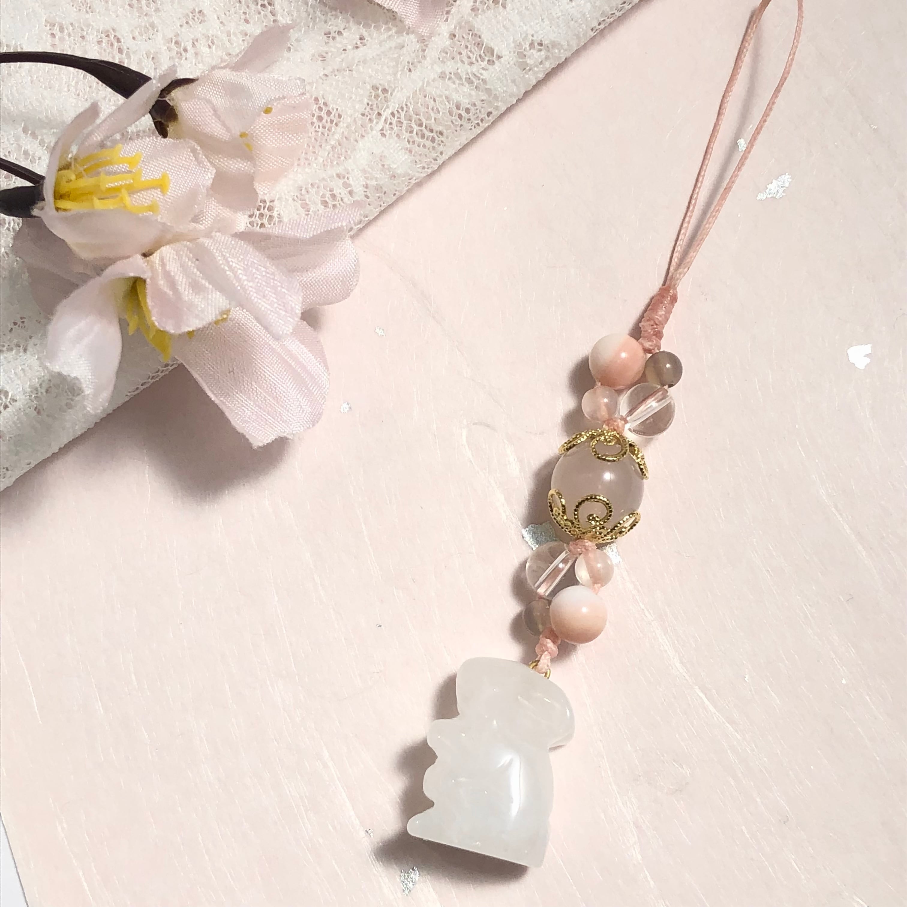 友情・愛情などの絆を深め、人間関係を円滑にするといわれているホワイトジェードをはじめ、優しさや愛情、魅力を高めてくれるような天然石を組み合わせ、とても可愛らしい印象のストラップに作り上げています♡