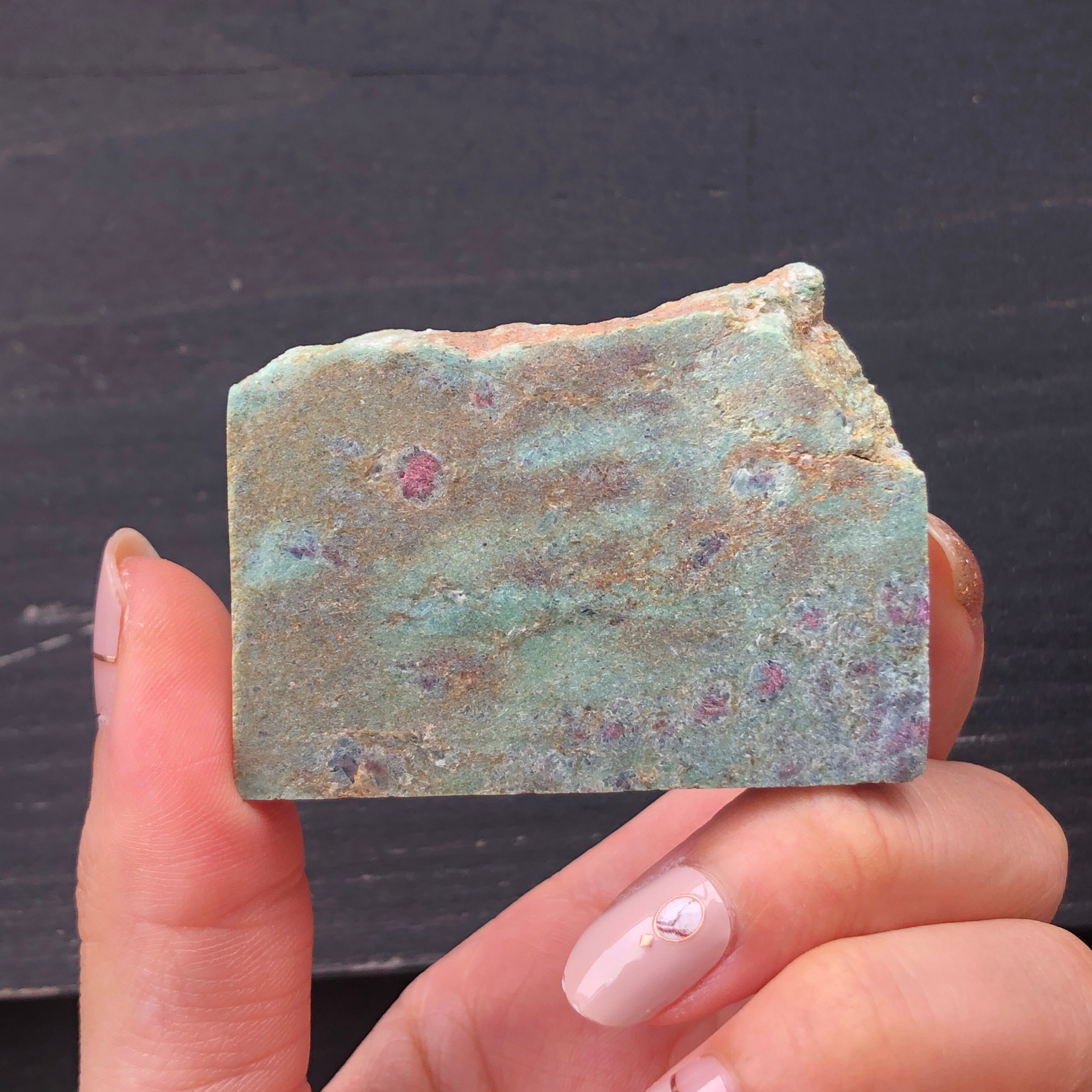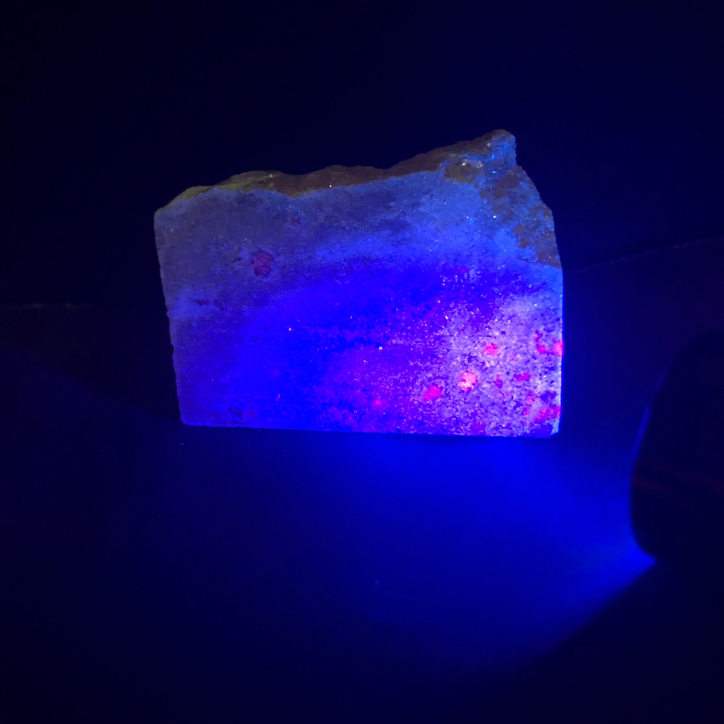 ルビーは蛍光するため、ブラックライトで照らすとルビーの部分だけ鮮やかに輝き、とても綺麗ですよ♪