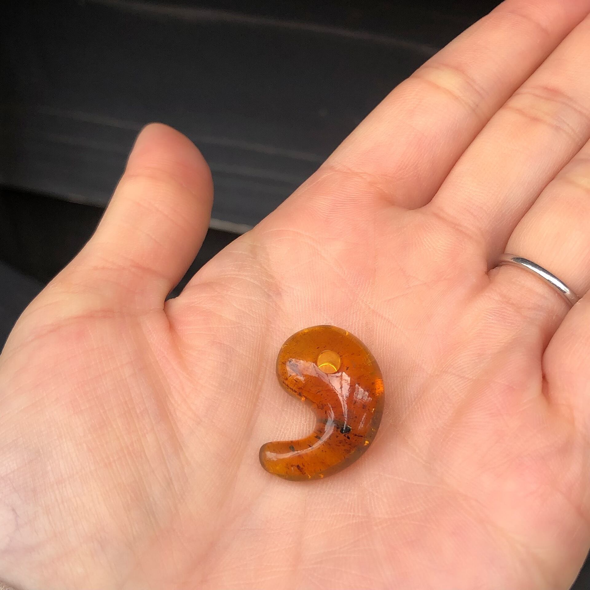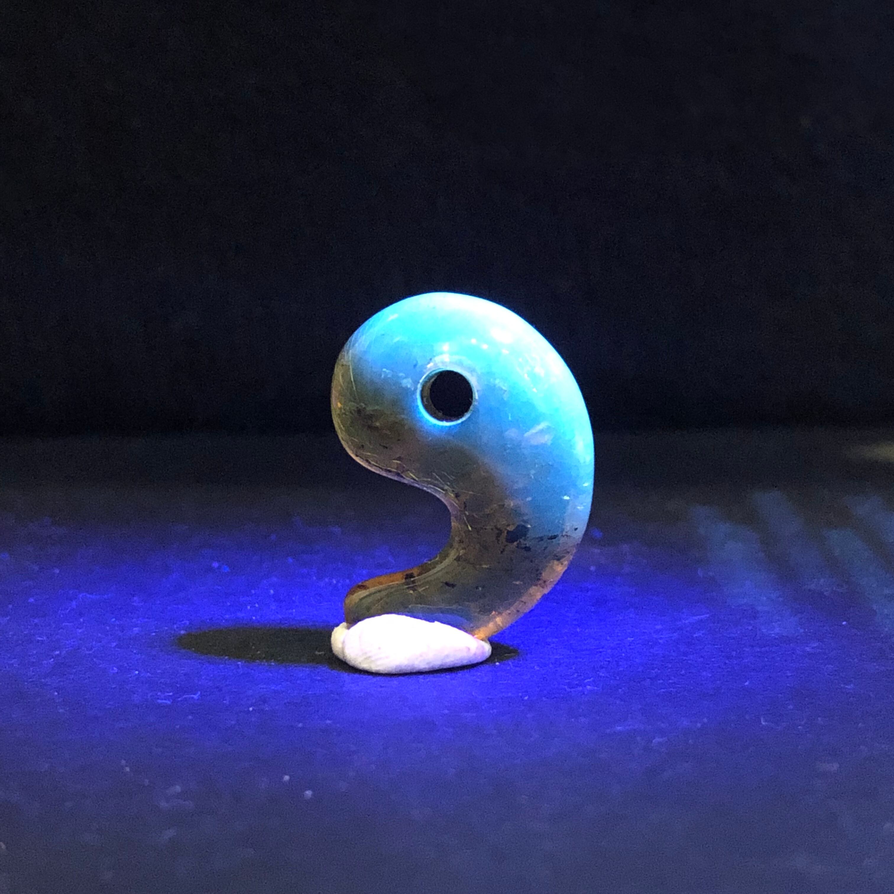見た目は普通のアンバーのような琥珀色ですが、太陽光やブラックライトなどの紫外線が当たると発色します。