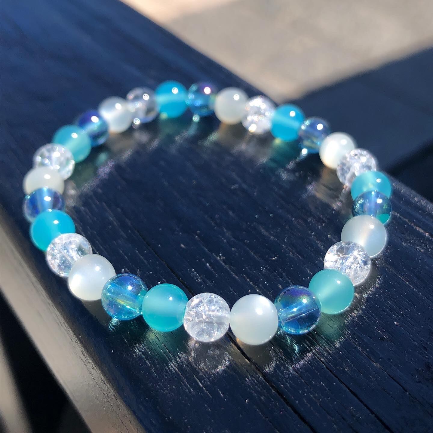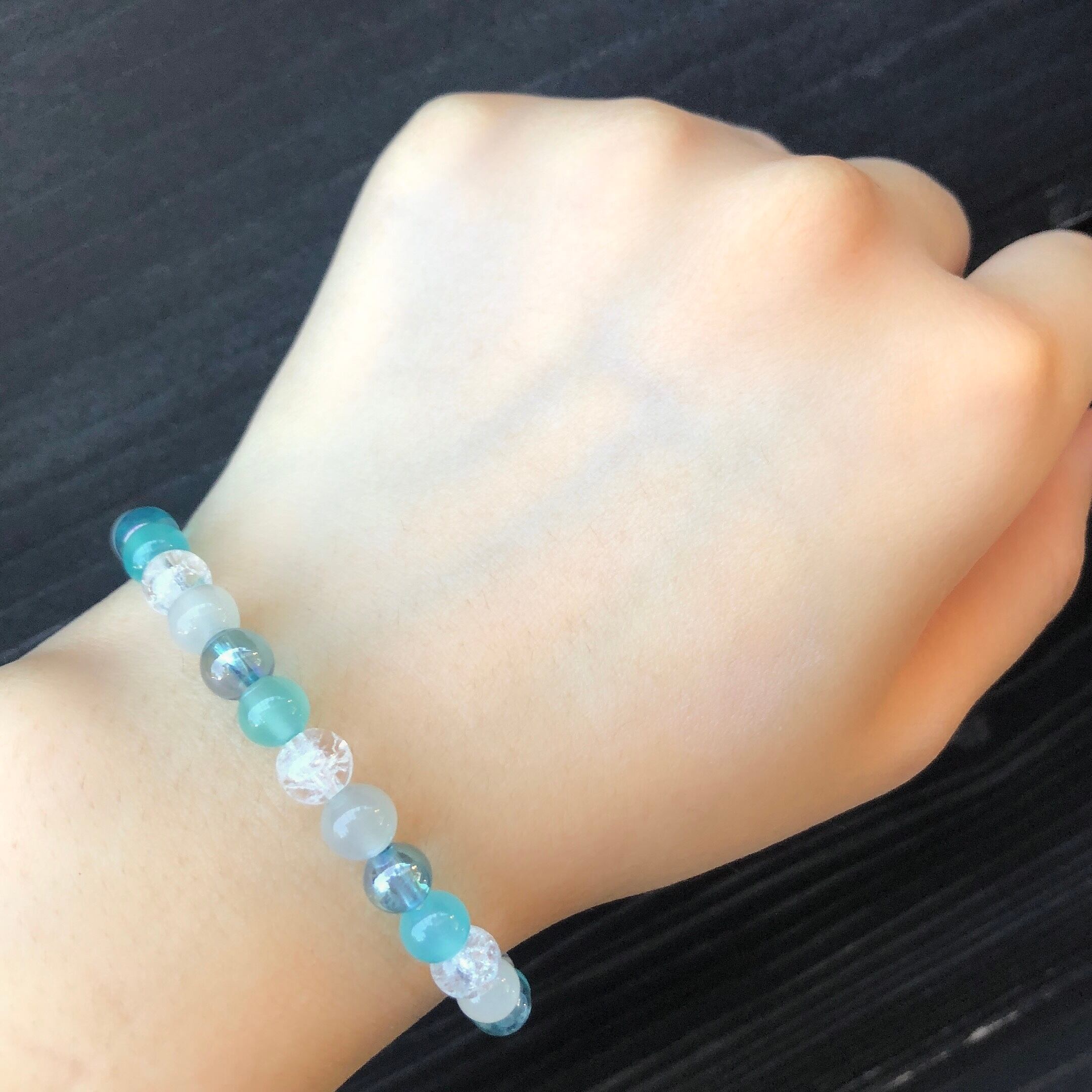 爽やかな色味の天然石たちと組み合わせたブレスレットなので、見ているだけでも涼しくなりますよね♪