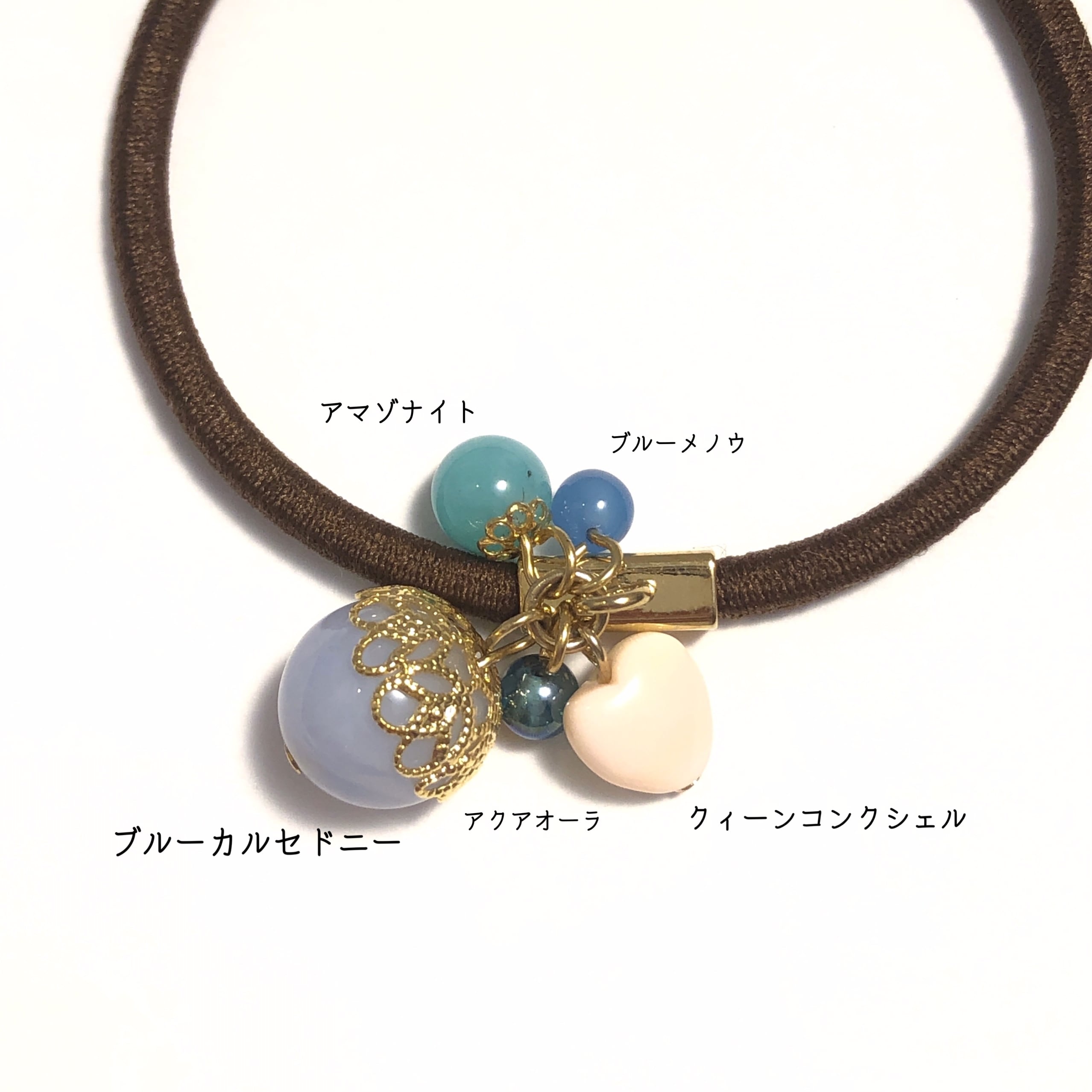 クィーンコンクシェルのハートと、沢山の天然石が付いたヘアゴムです。