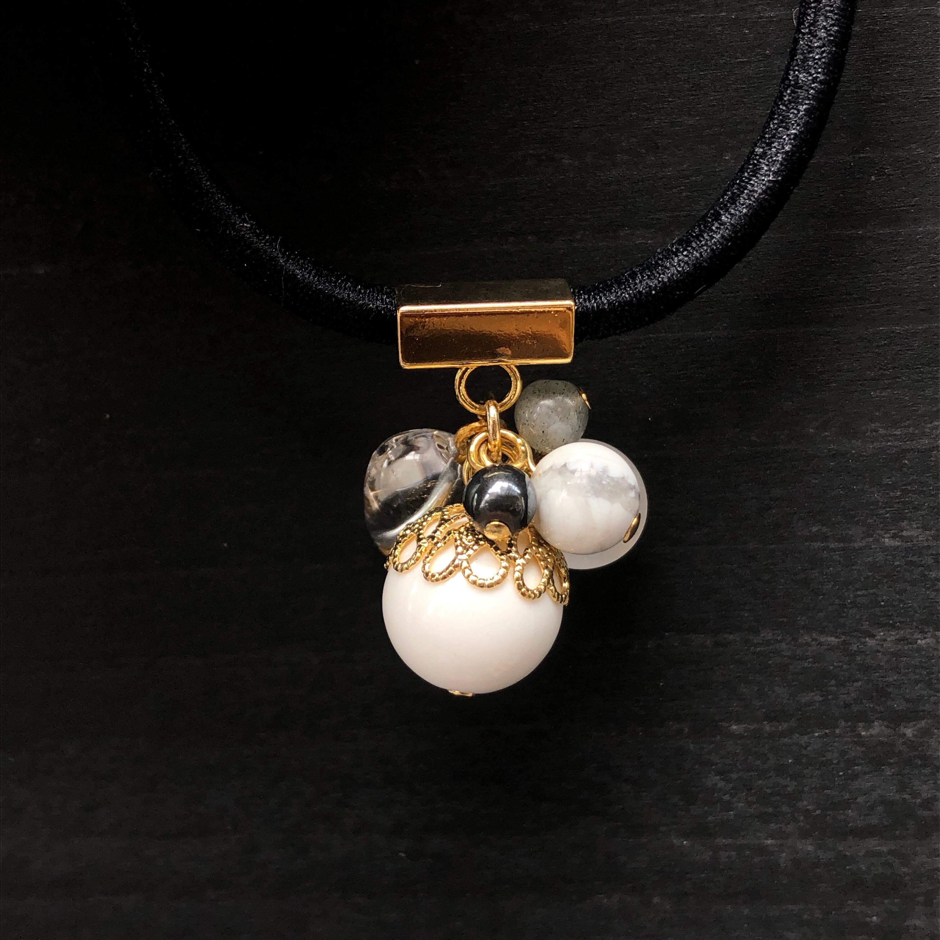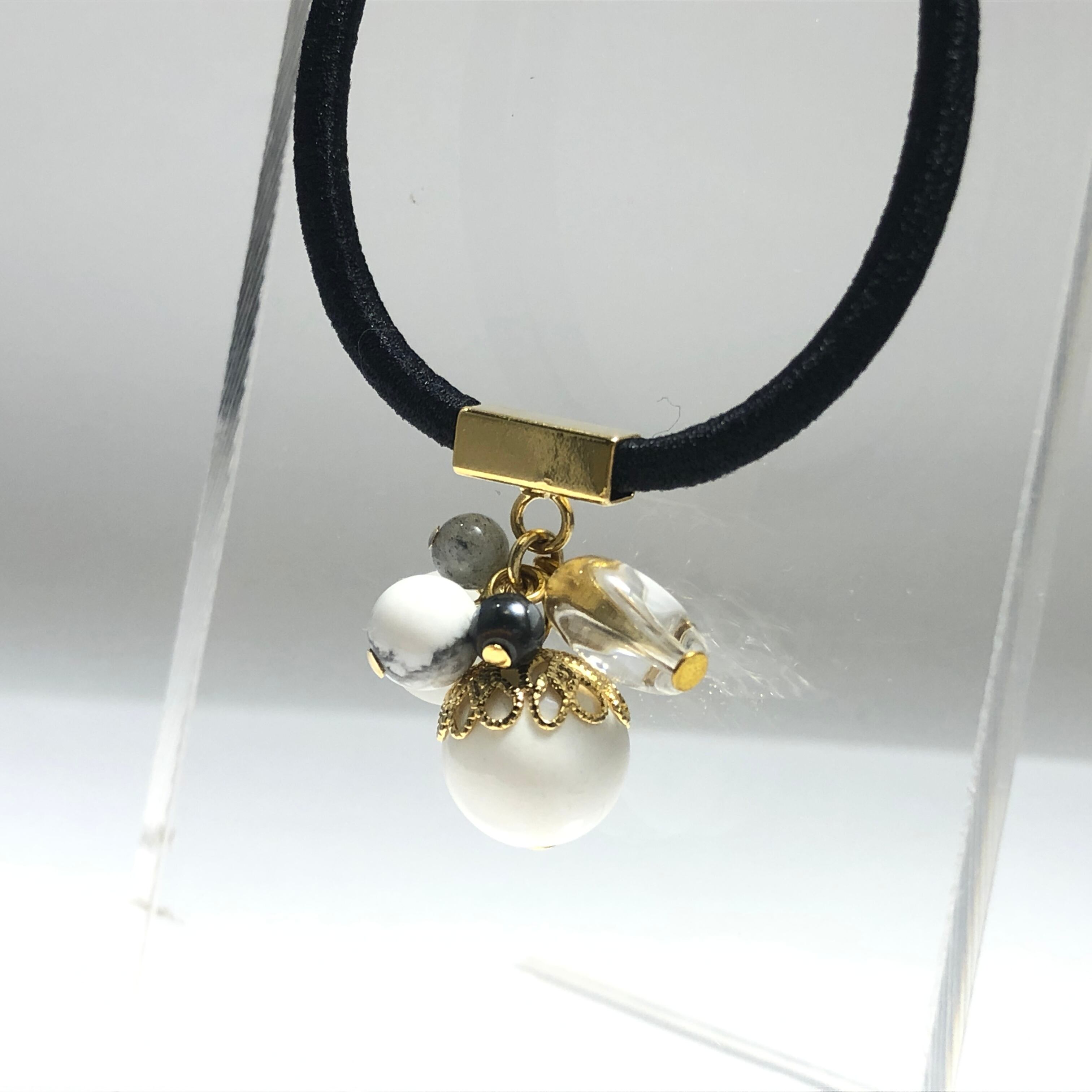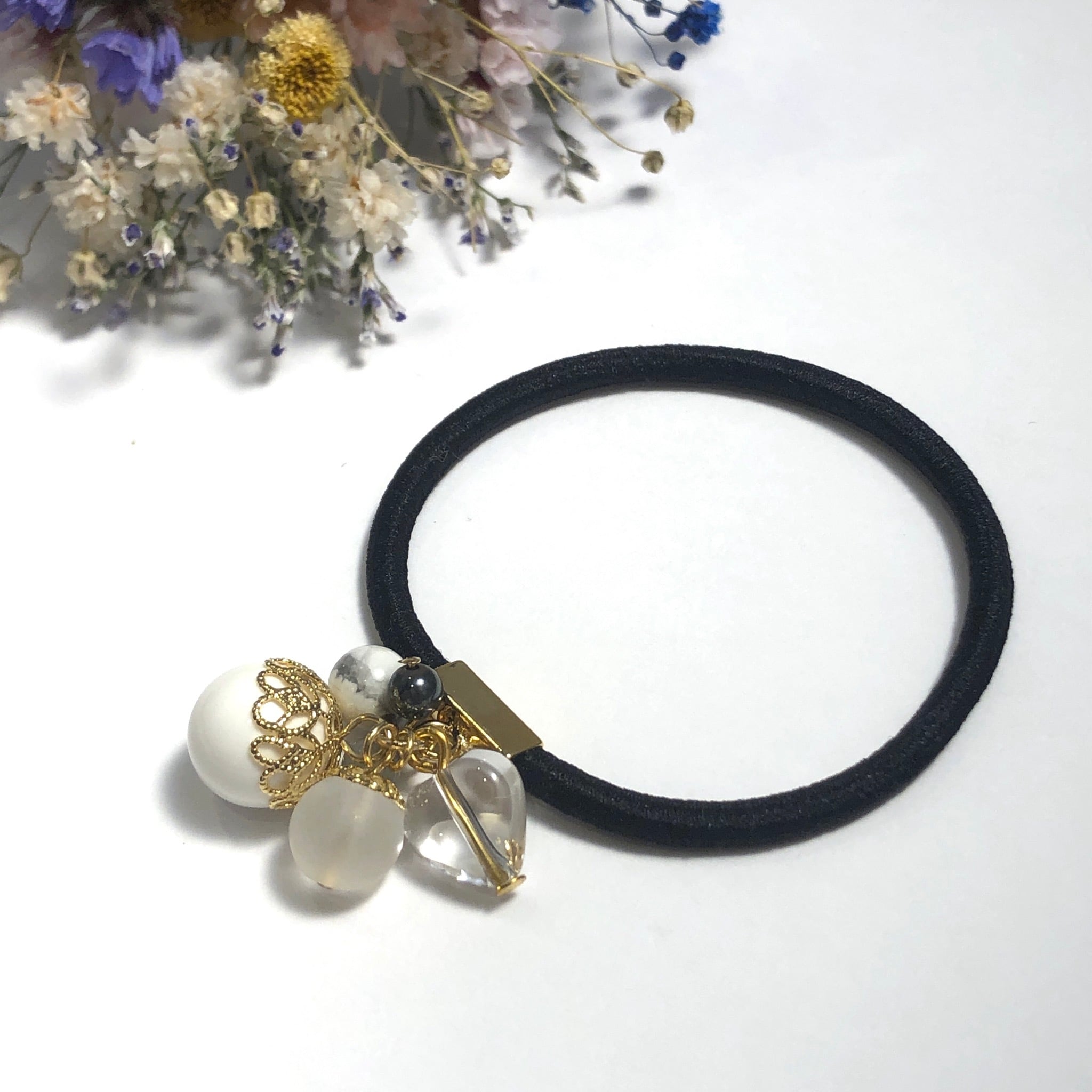 水晶のハートと、沢山の天然石が付いたヘアゴムです。