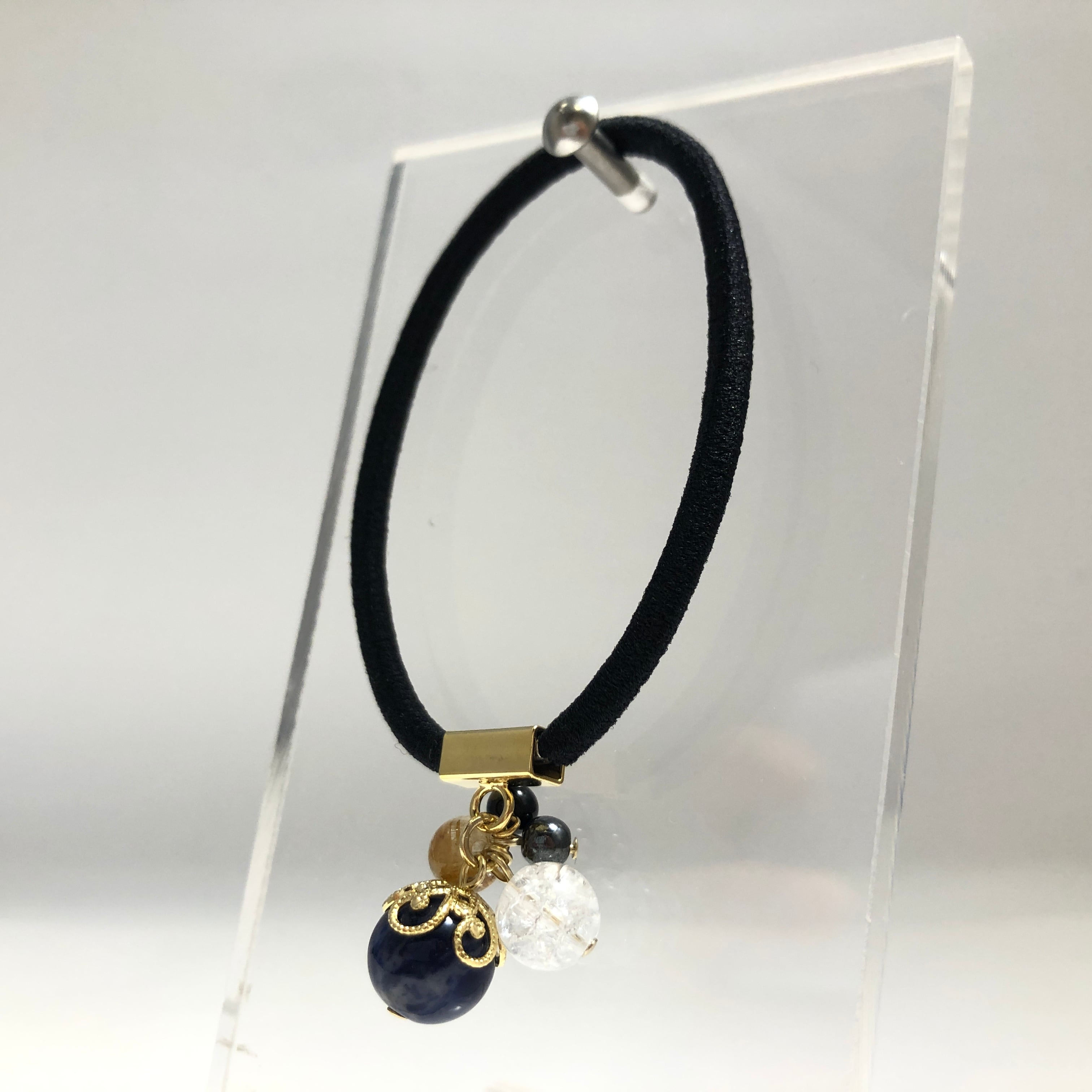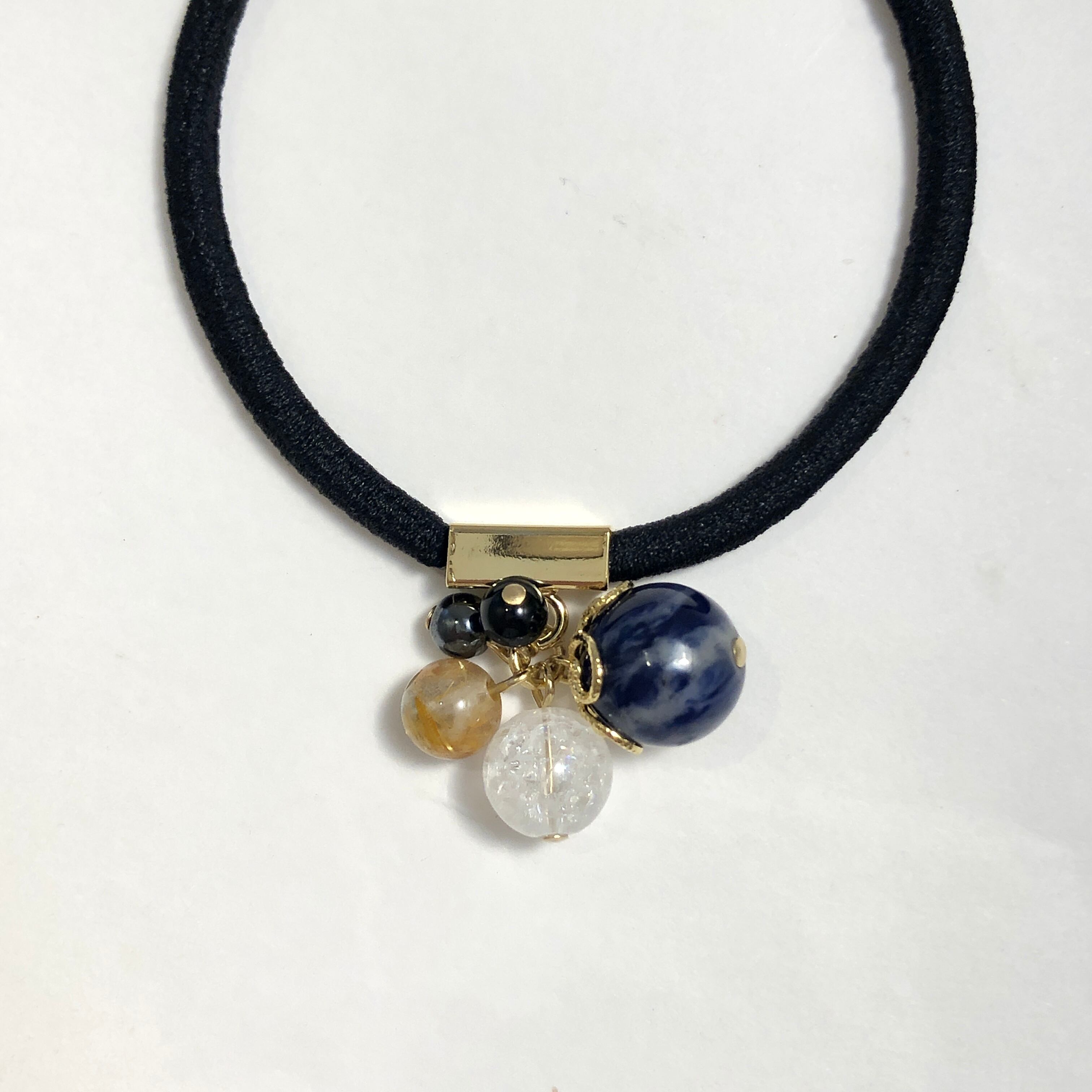 こちらは青や黒の格好いい色合いの中で、キラキラしたクラック水晶が映えるヘアゴムに仕上がっています♪