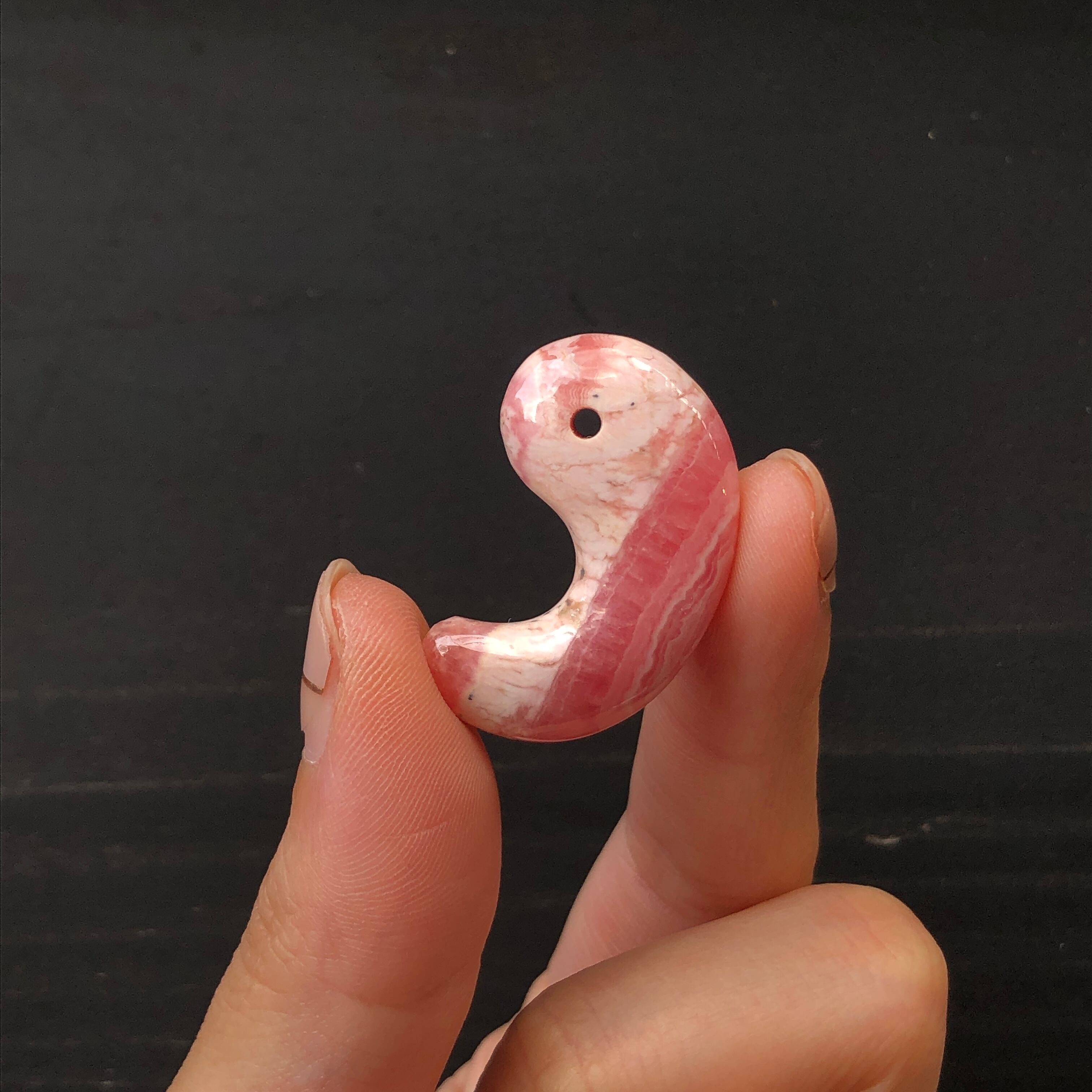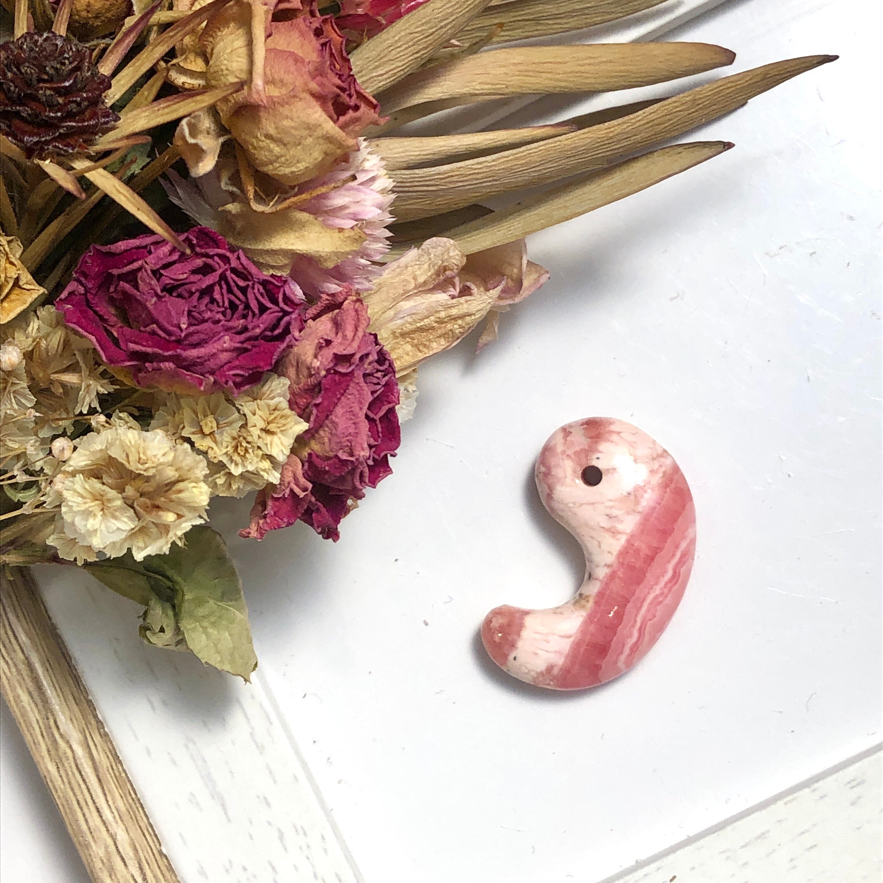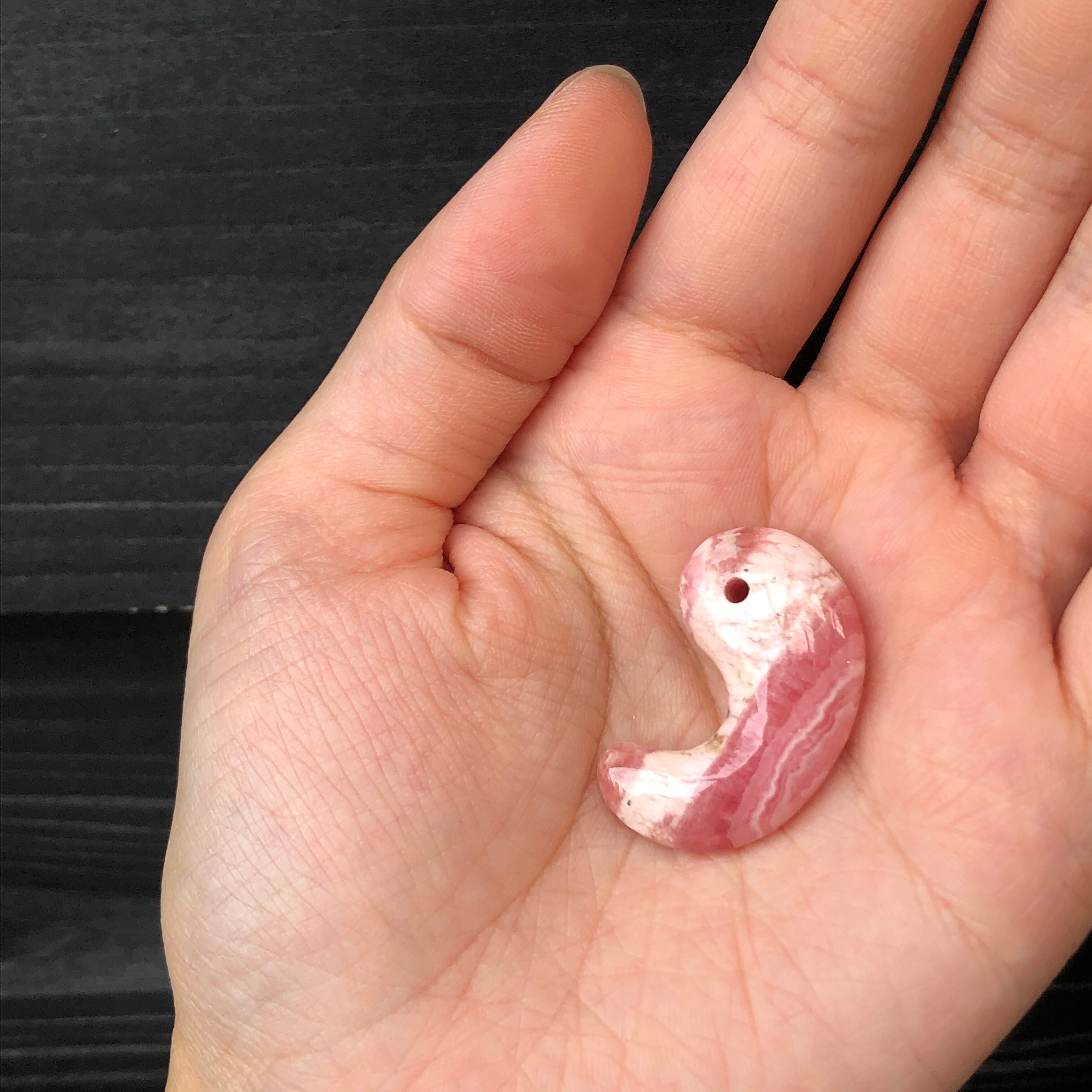 ピンクと白からなる模様が特徴的なロードクロサイトの勾玉を