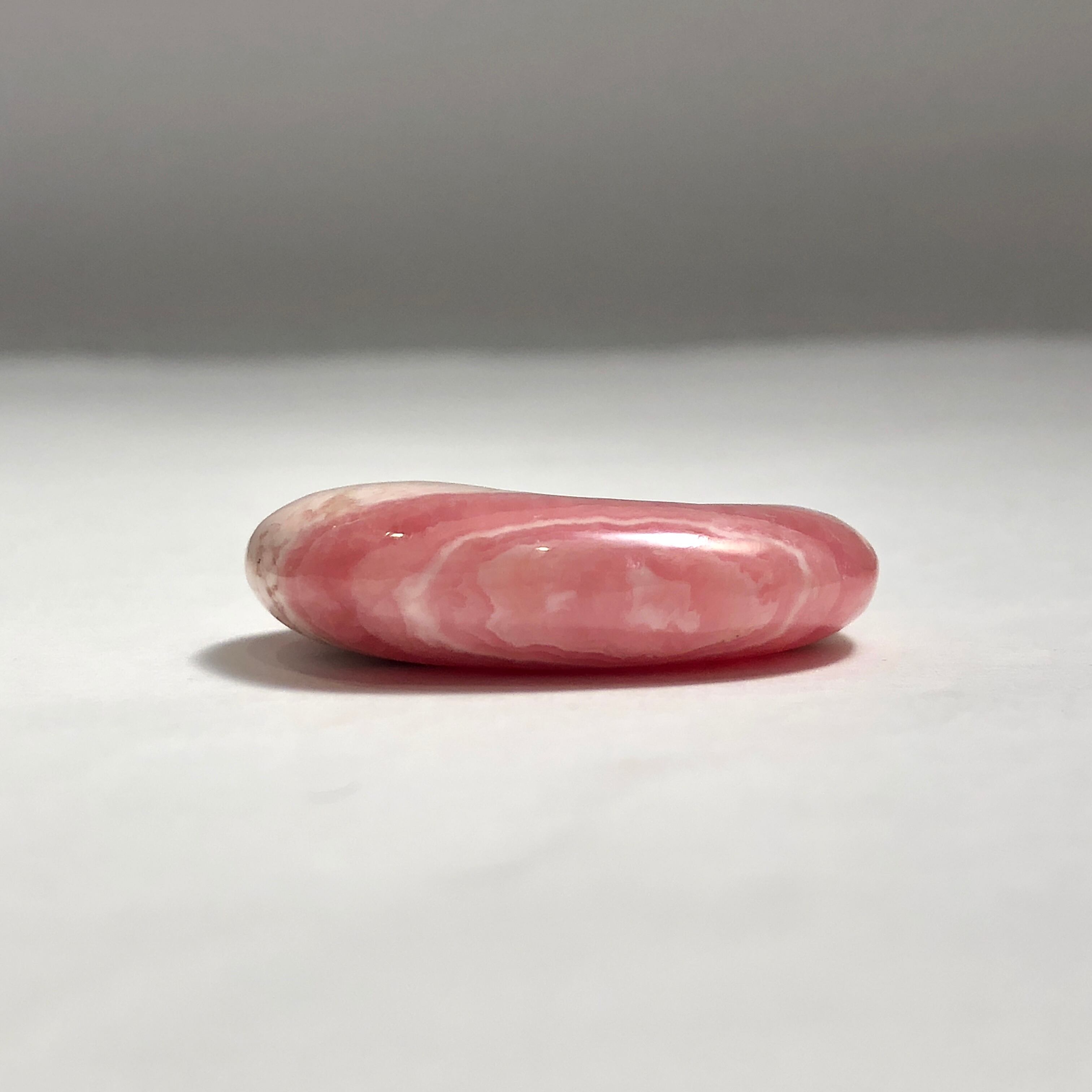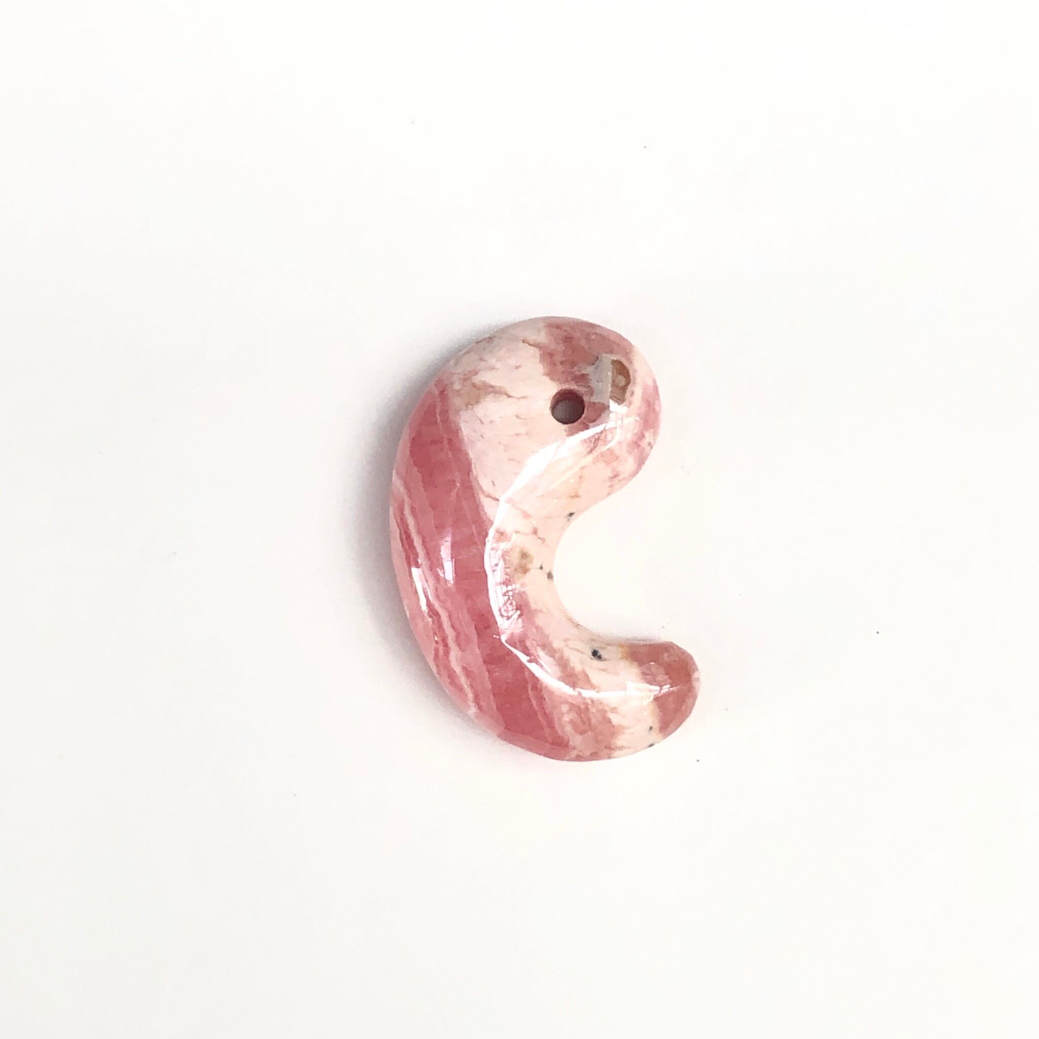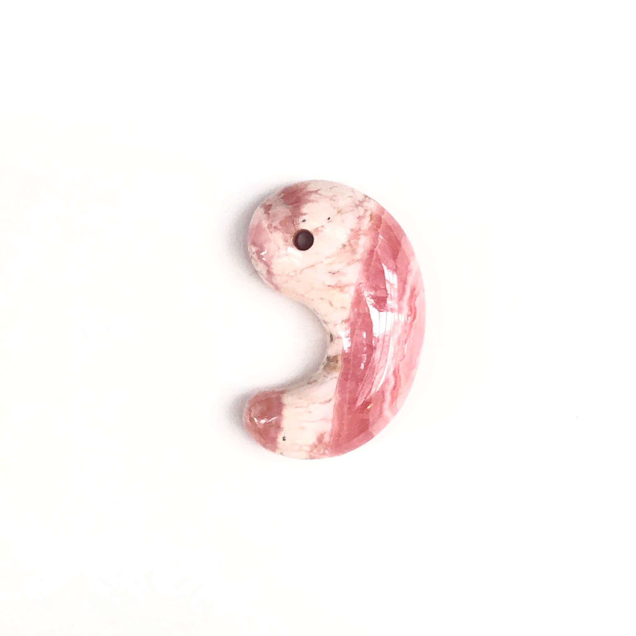 ピンクと白からなる模様が特徴的なロードクロサイトの勾玉を