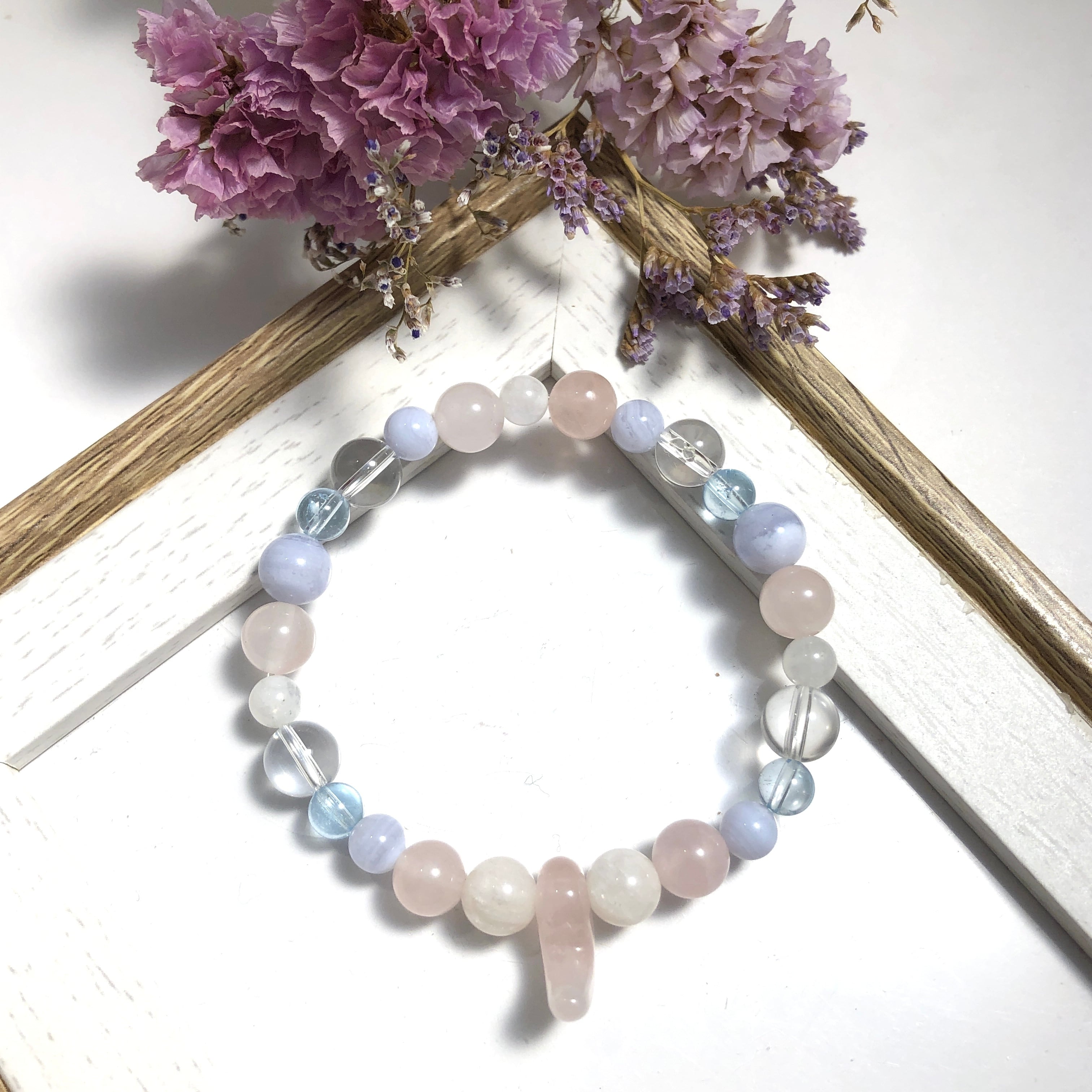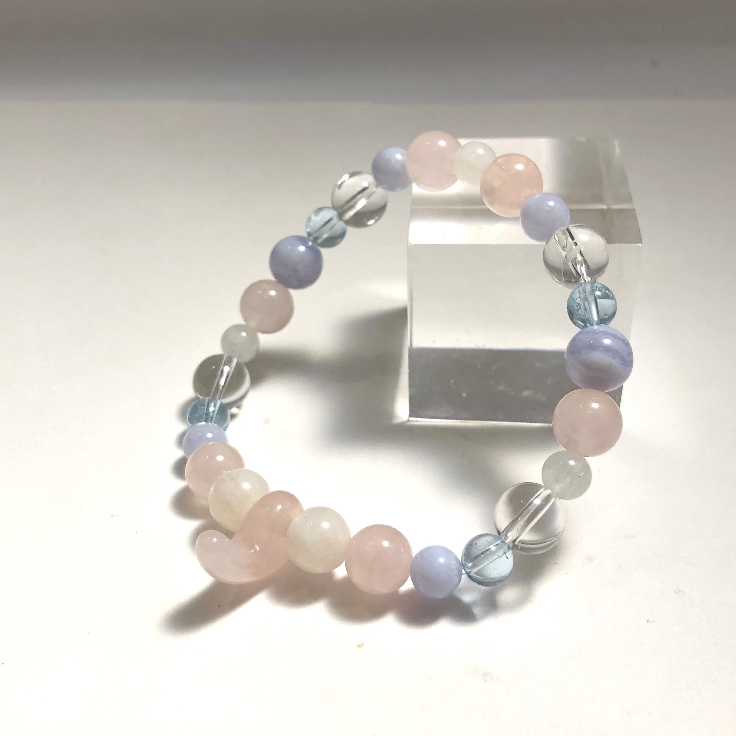 ■使用している石 ローズクォーツ(勾玉)、ブルーレースアゲート、ブルートパーズ、ローズクォーツ、ムーンストーン、水晶