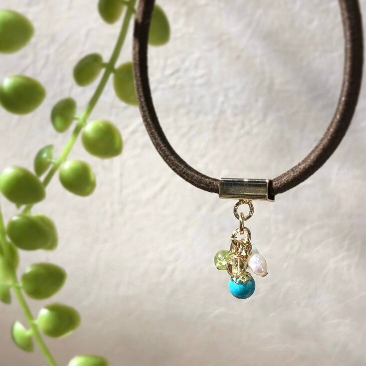 小さい天然石がたくさんついた可愛らしいヘアゴムを