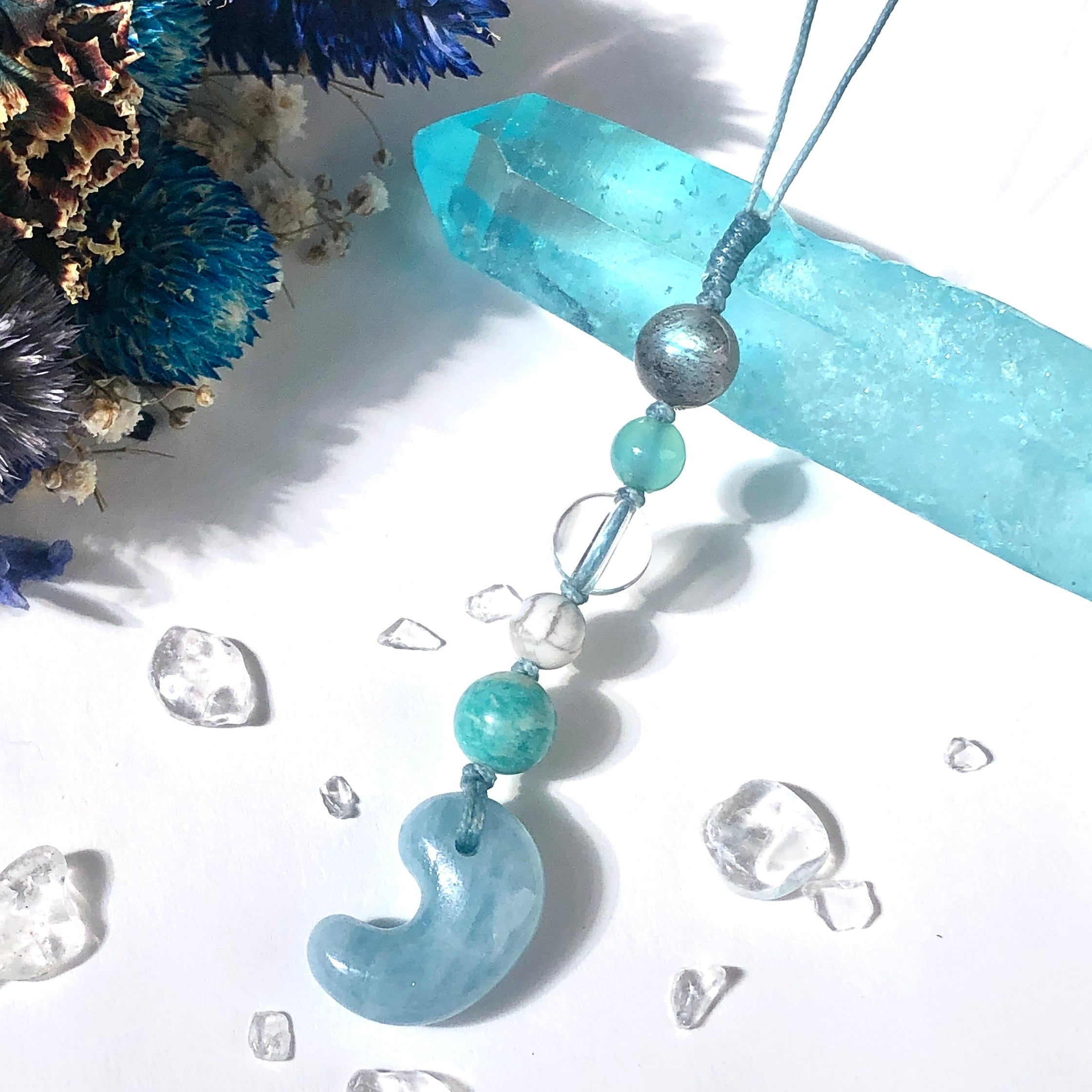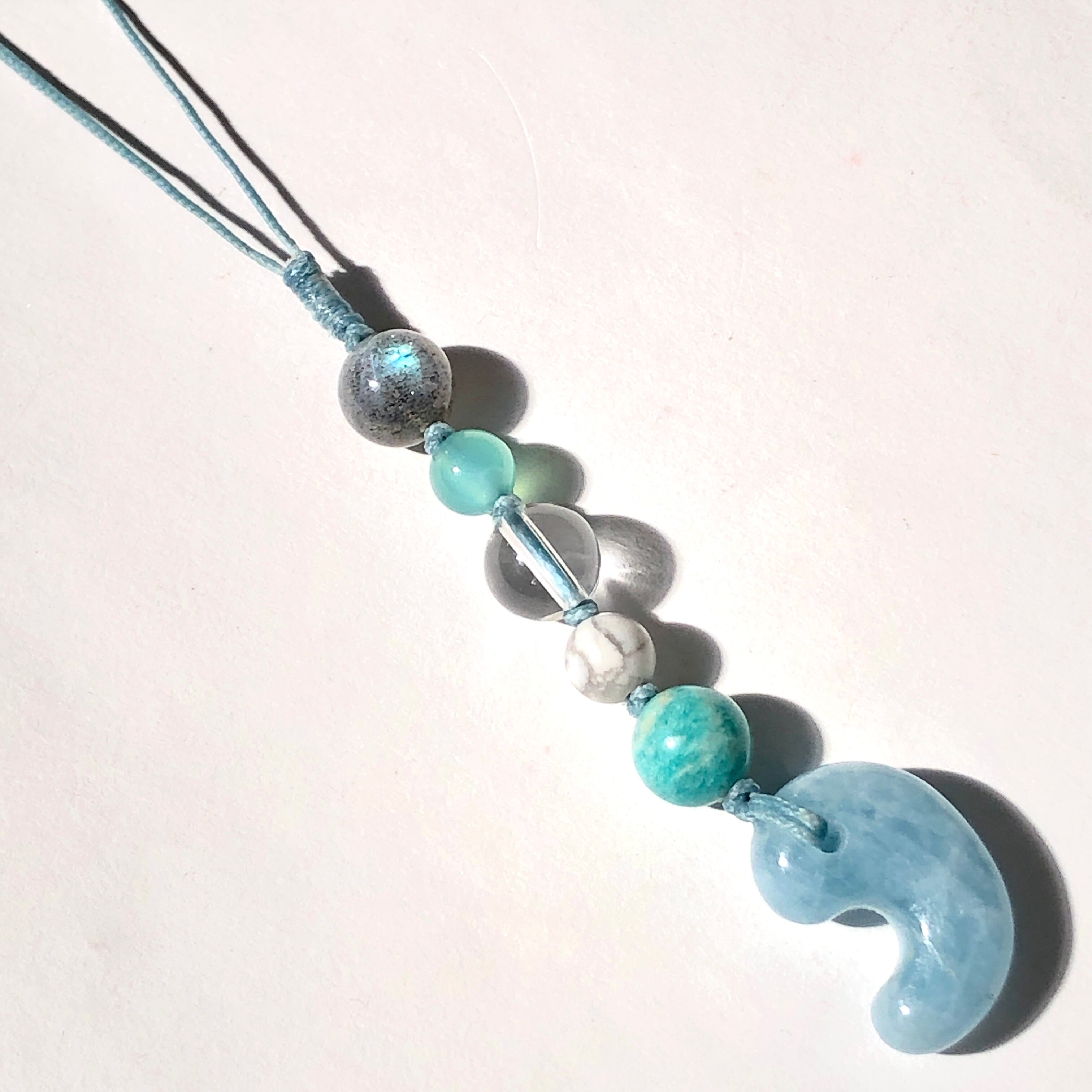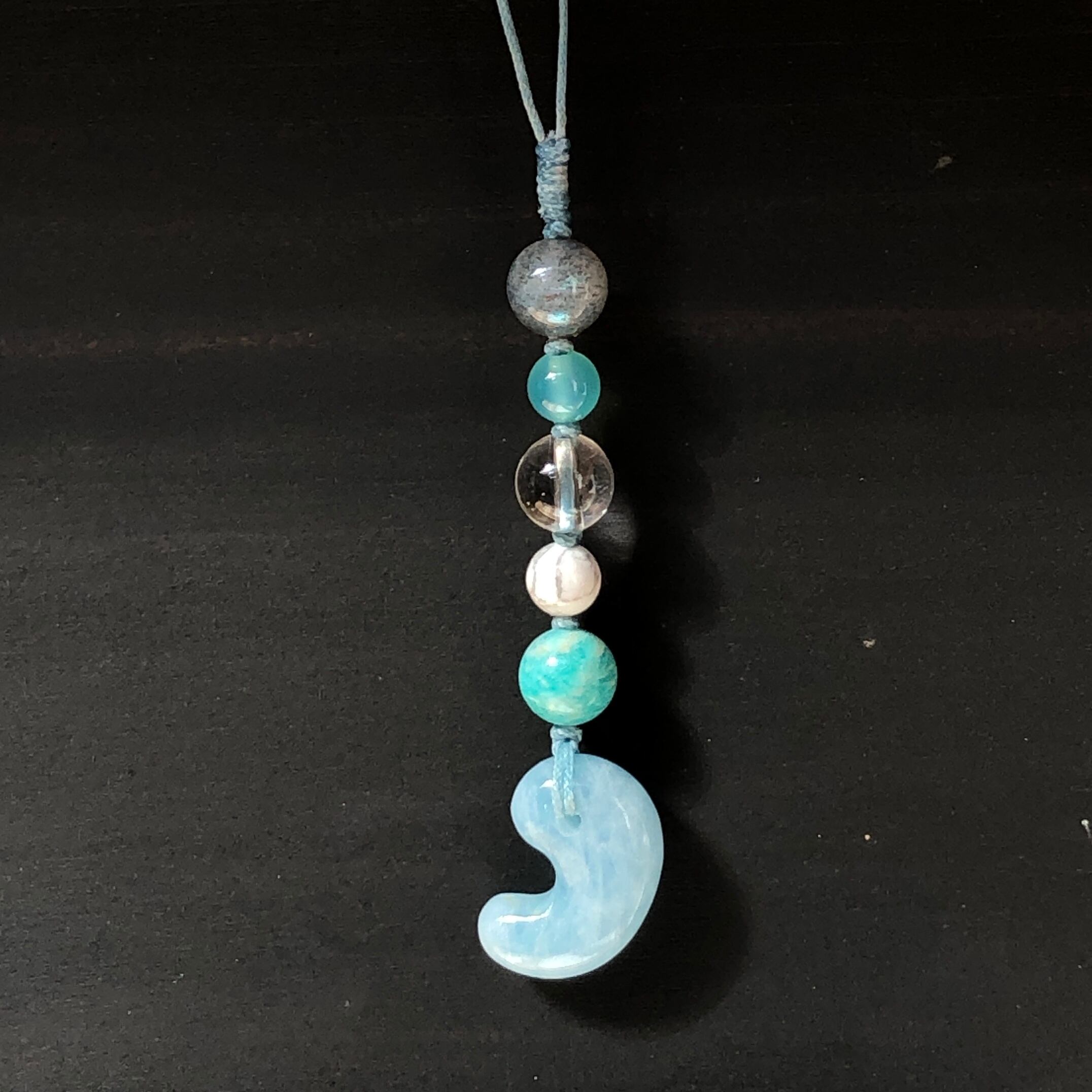 ■使用している石 アクアマリン(勾玉)、ラブラドライト、水晶、シーブルーカルセドニー、ホワイトハウライト、アマゾナイト