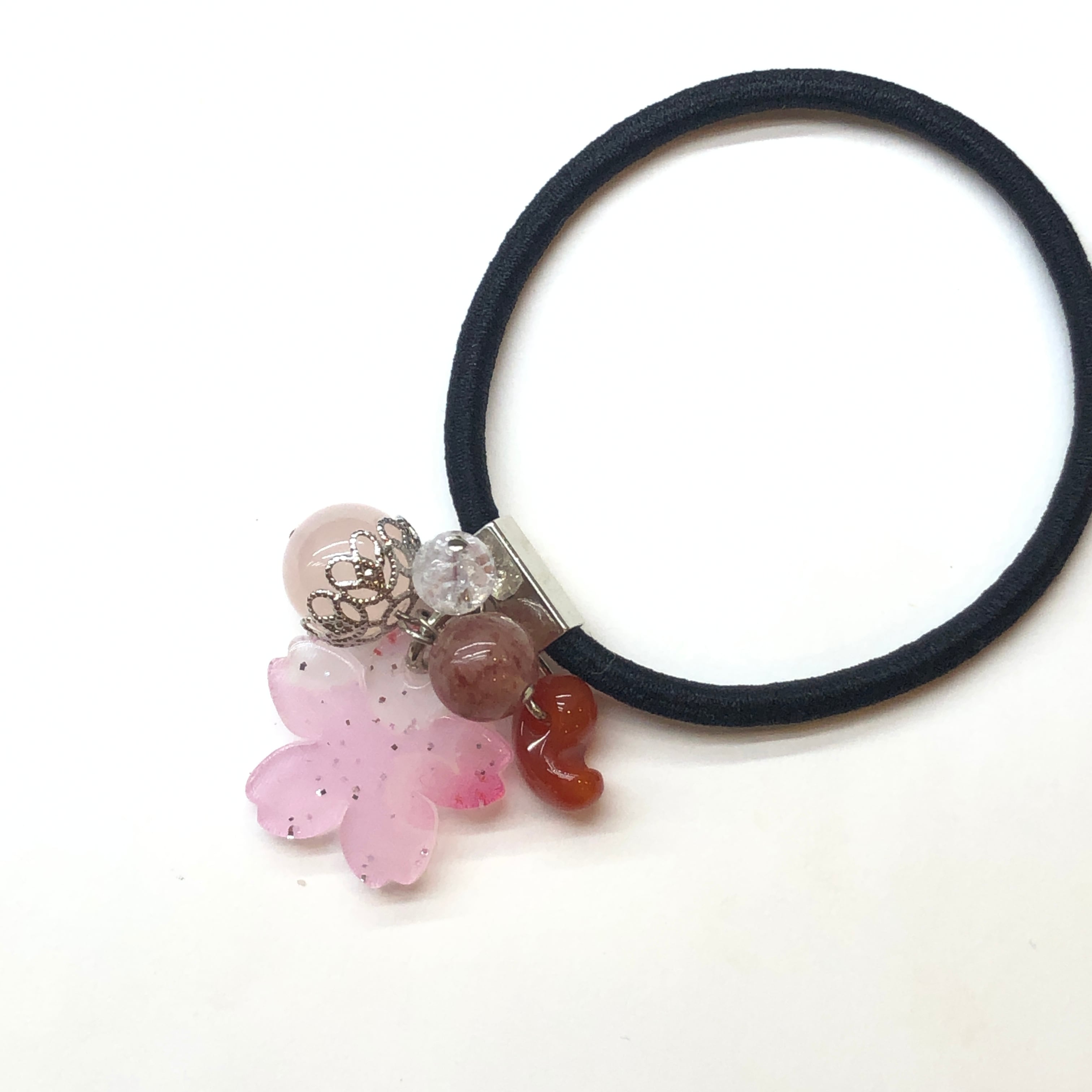 桜と勾玉が付いた可愛い天然石ヘアゴムです♡