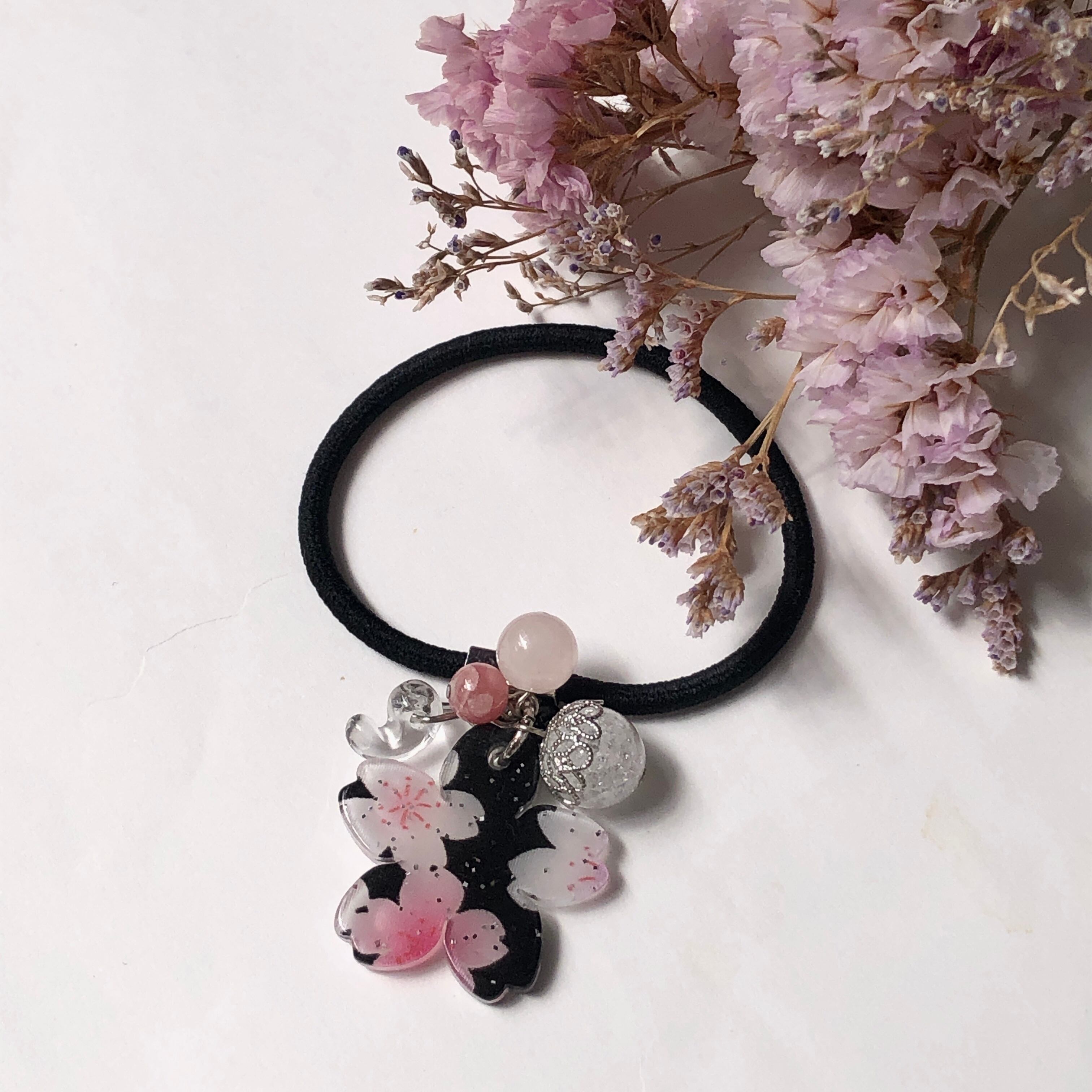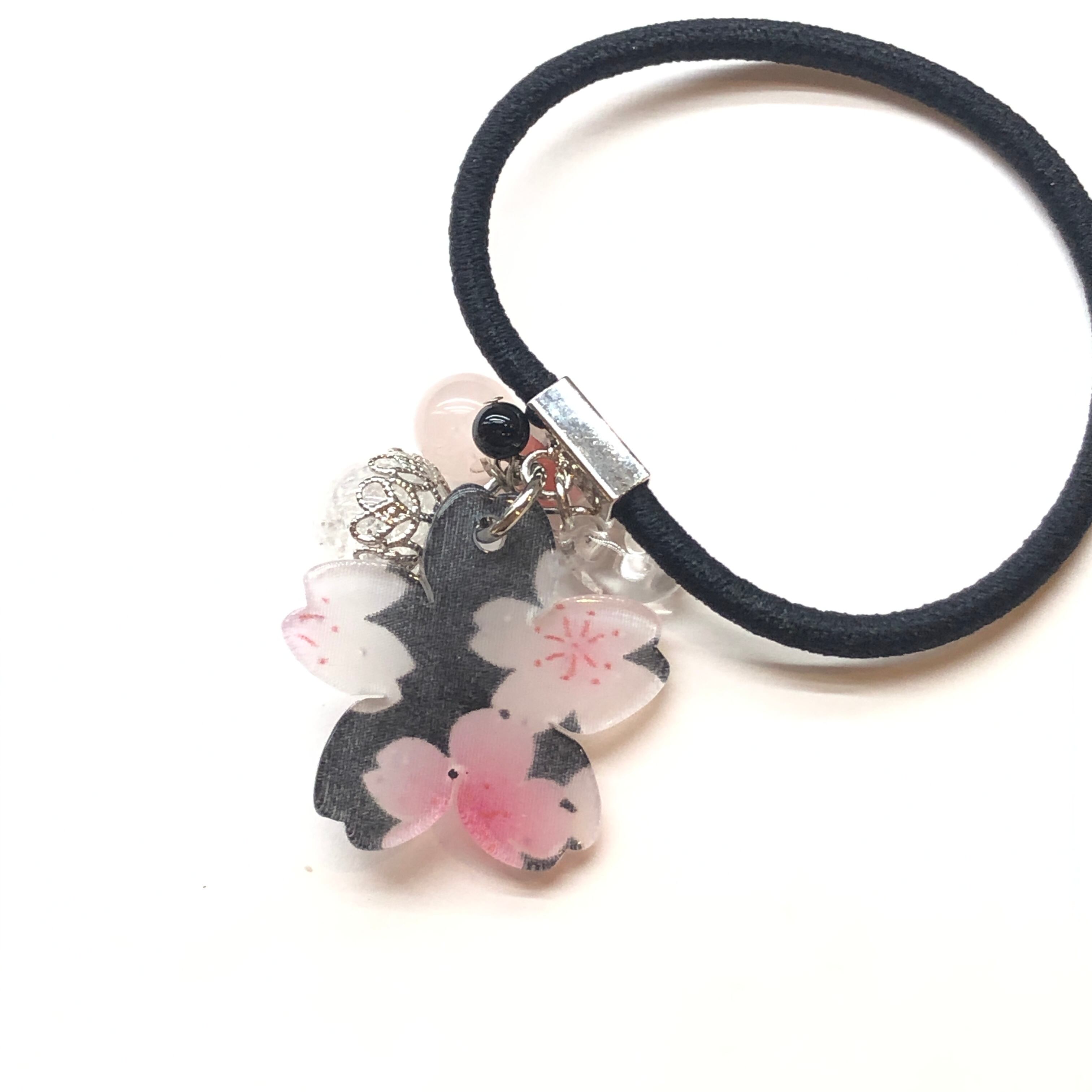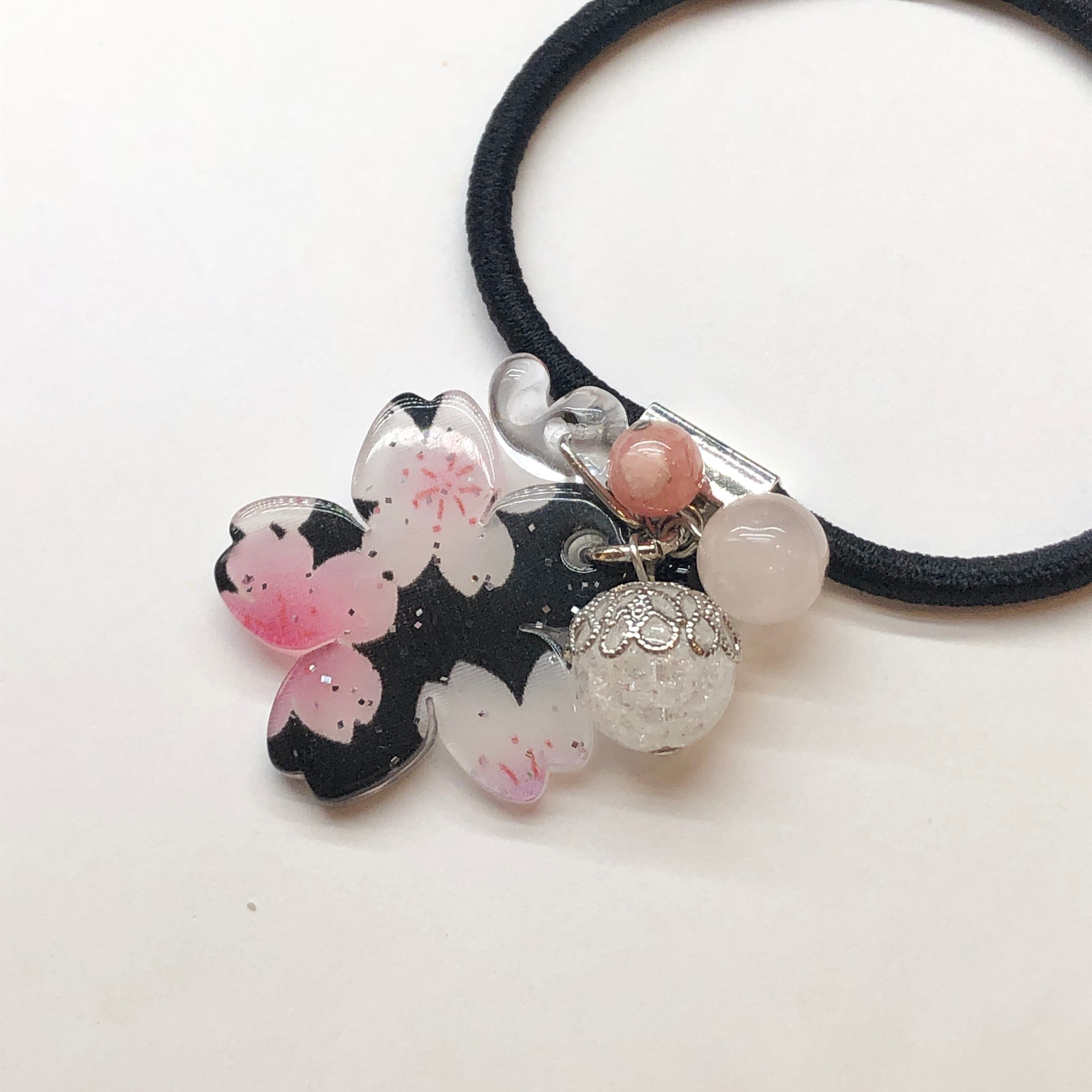 桜と勾玉が付いた可愛い天然石ヘアゴムです♡