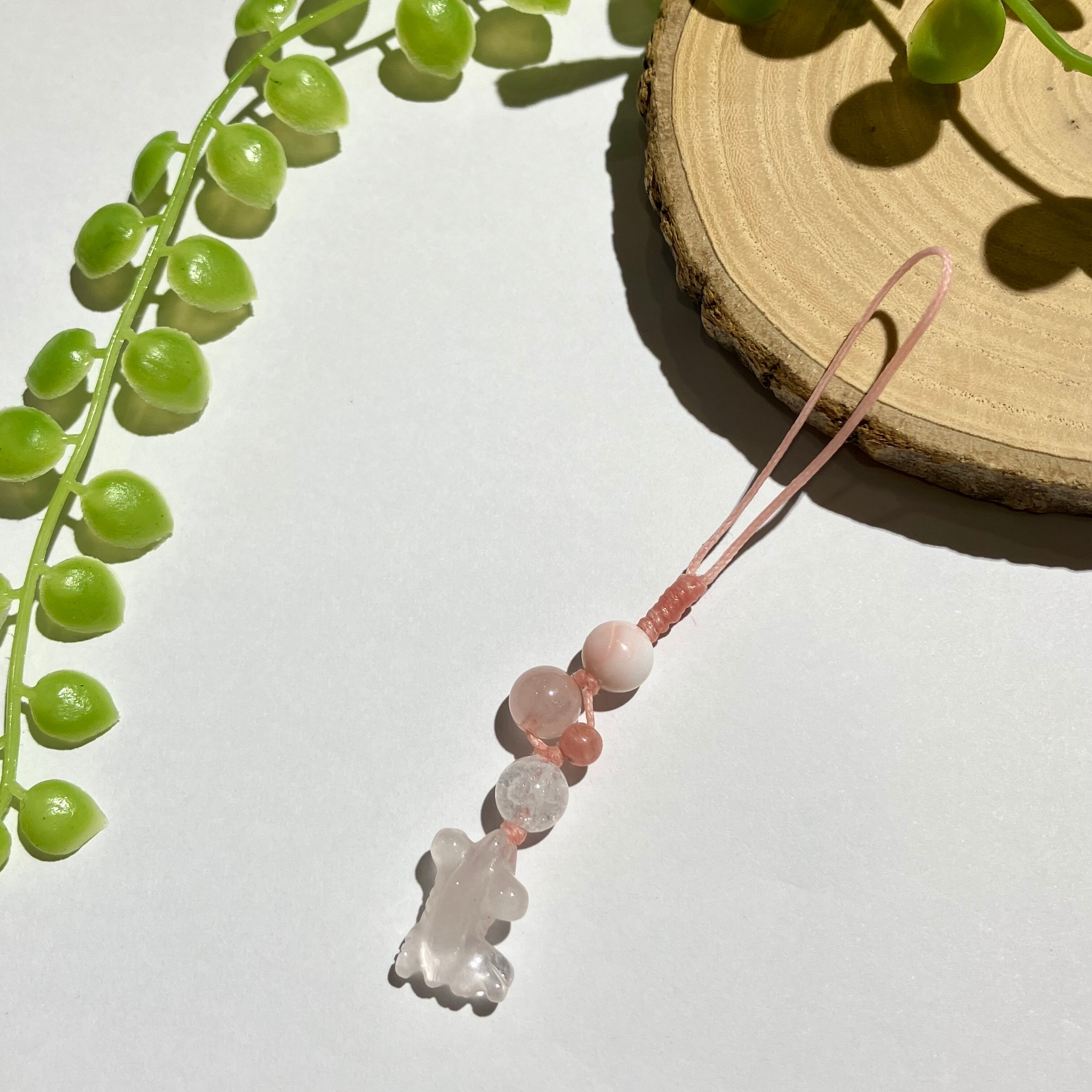 ■使用している石 ローズクォーツ(金魚)、クィーンコンクシェル、ロードクロサイト、ローズクォーツ、クラック水晶